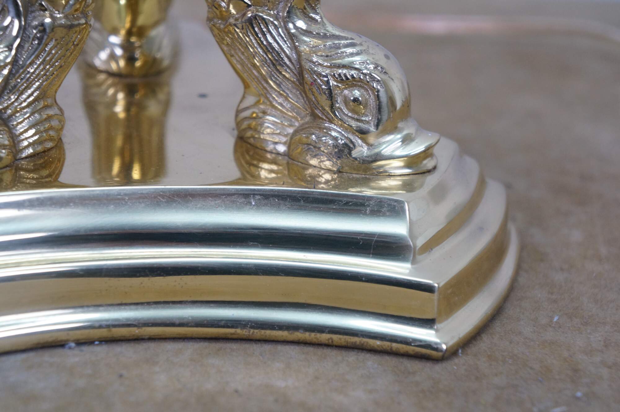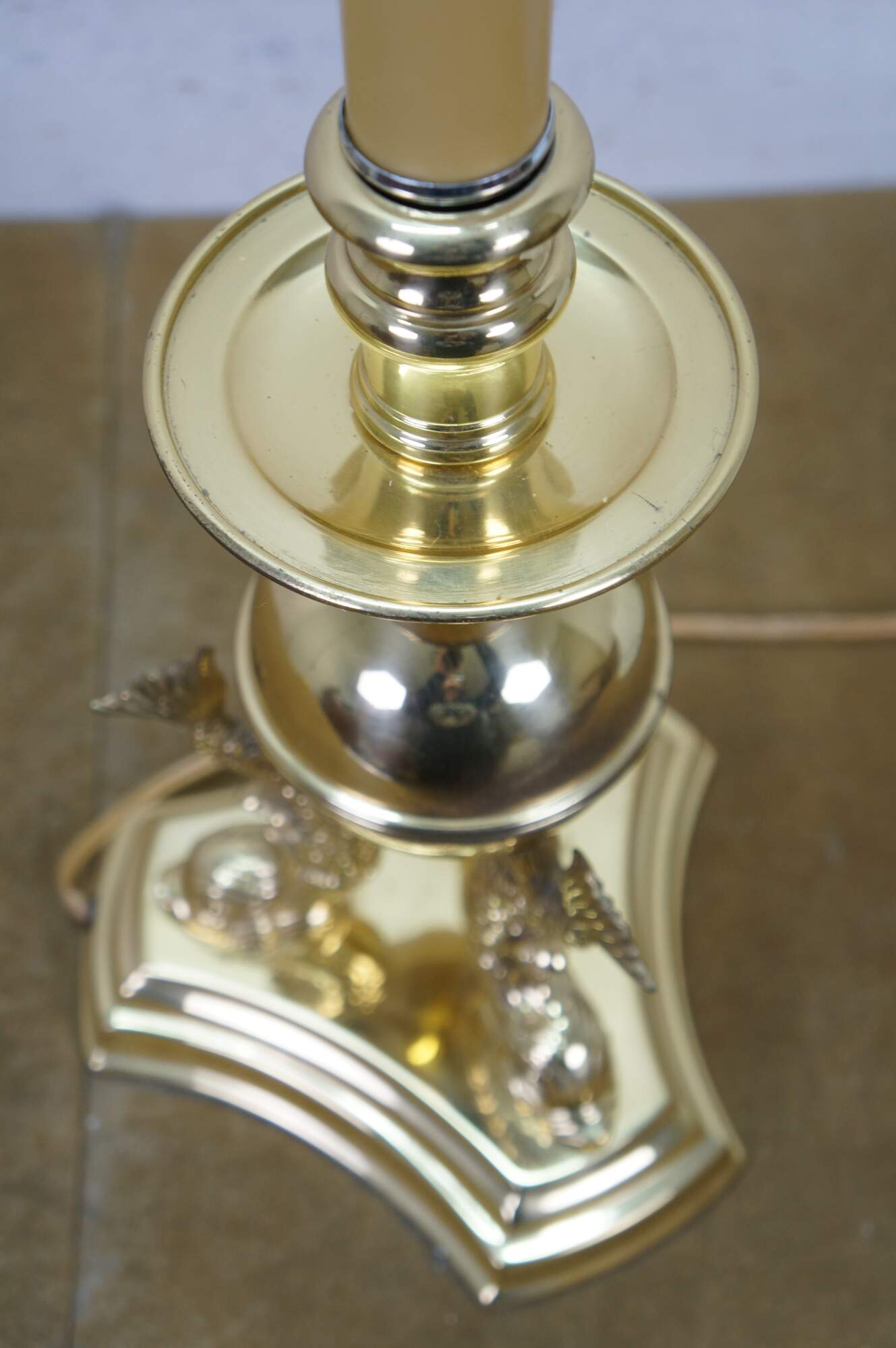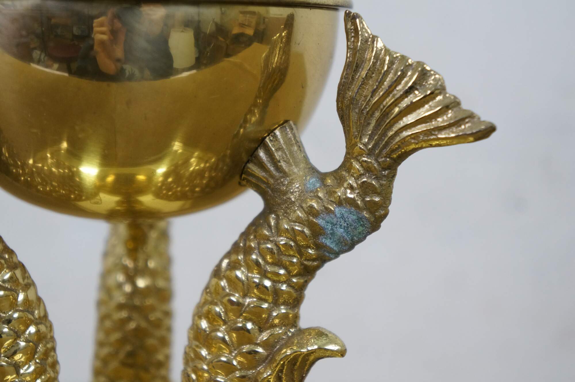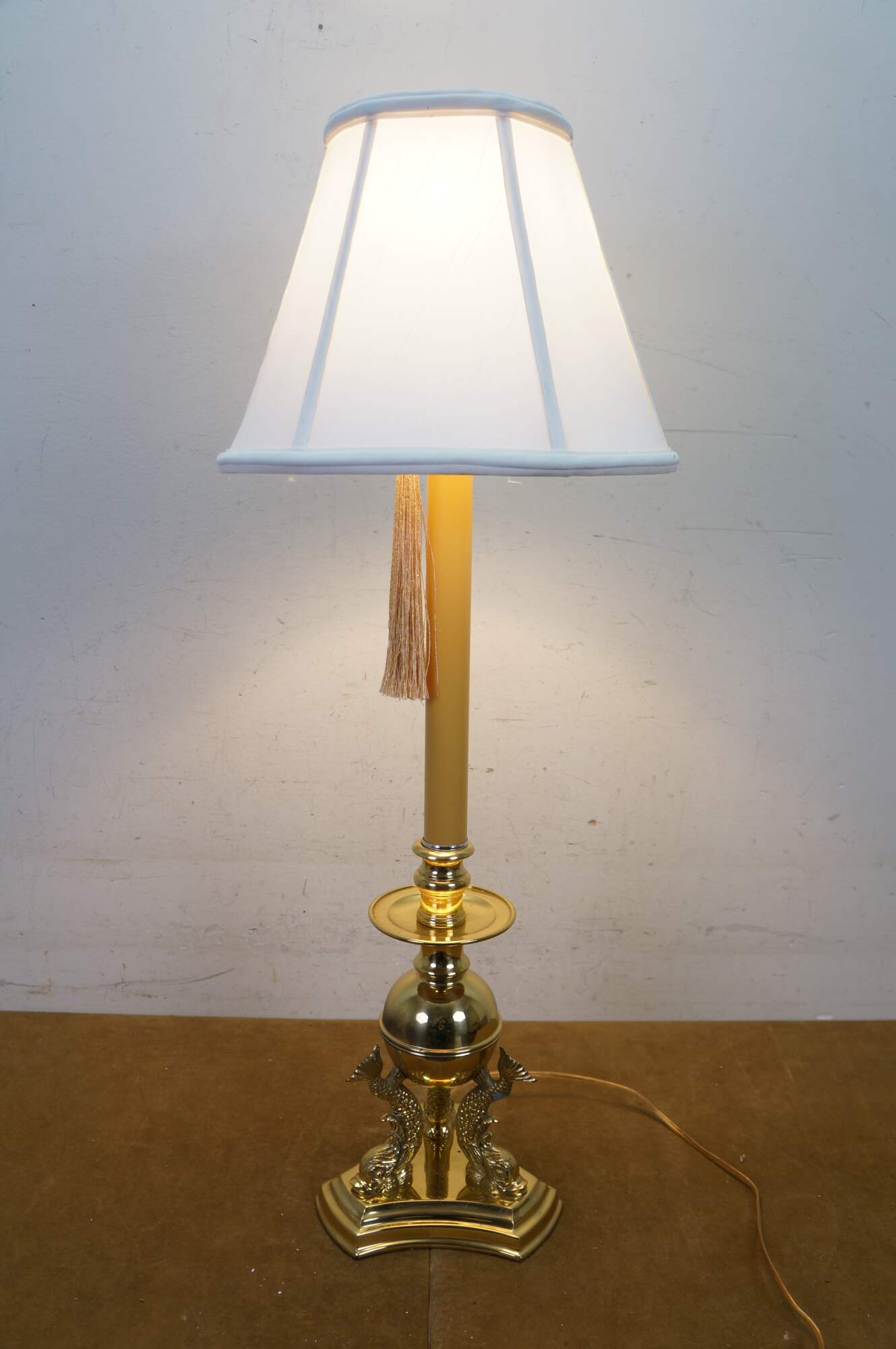 Vintage brass table lamp featuring a trio of delphins / dolphins / Koi fish supporting an orb and candlestick light.