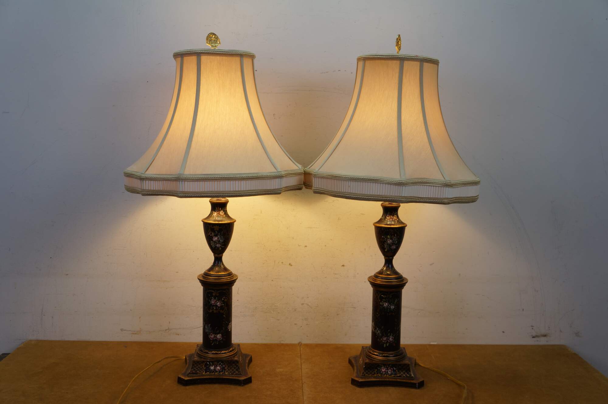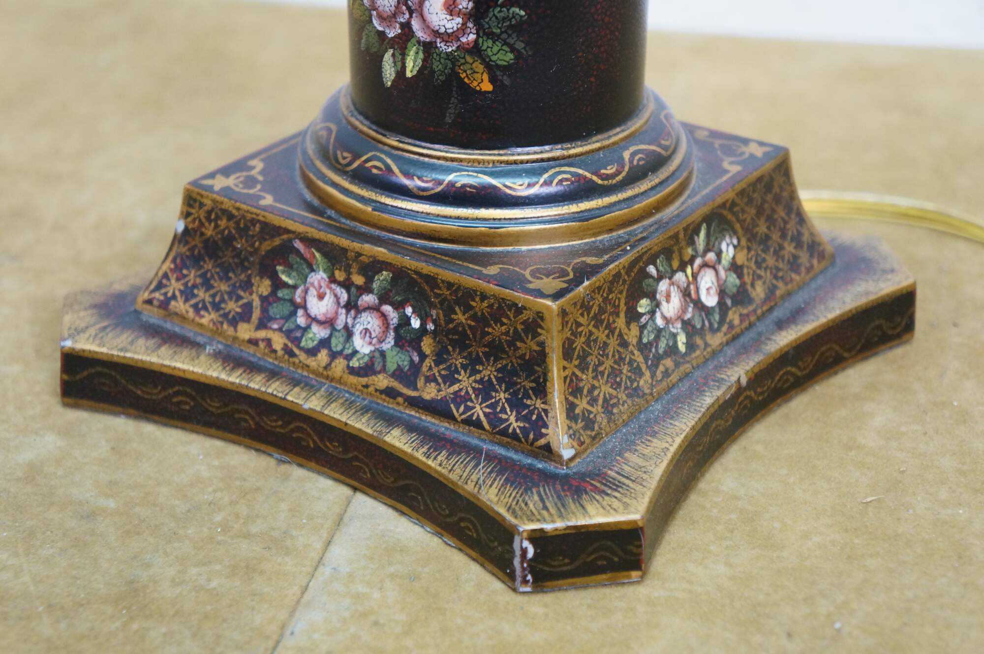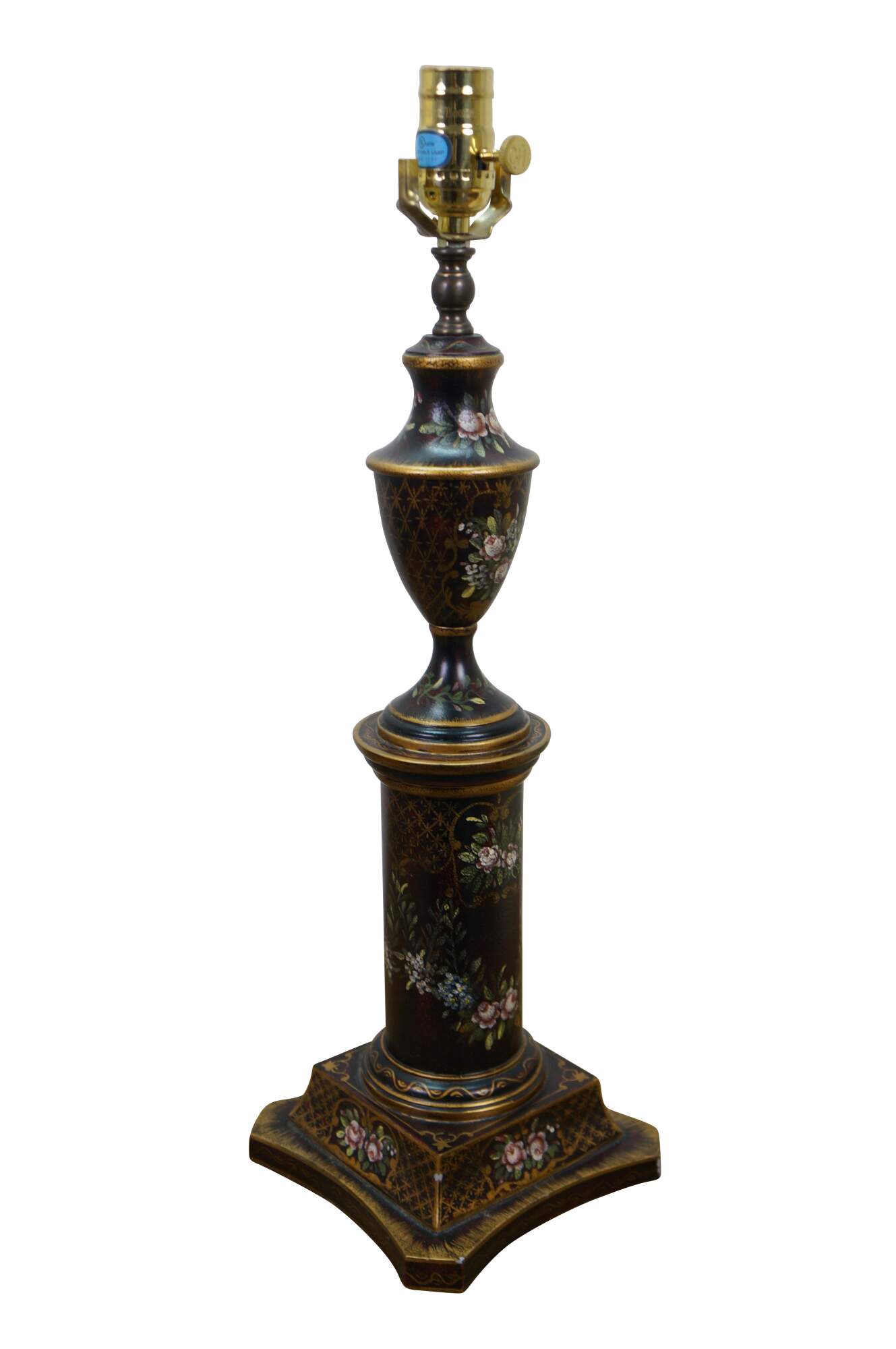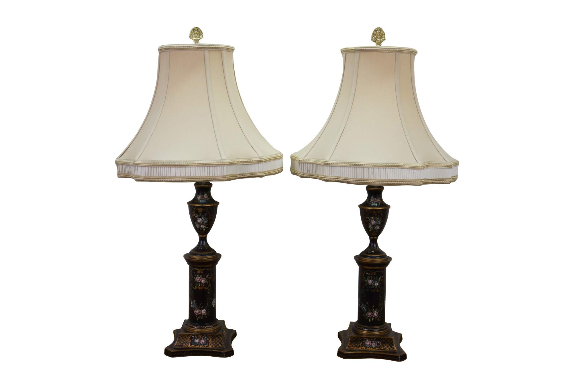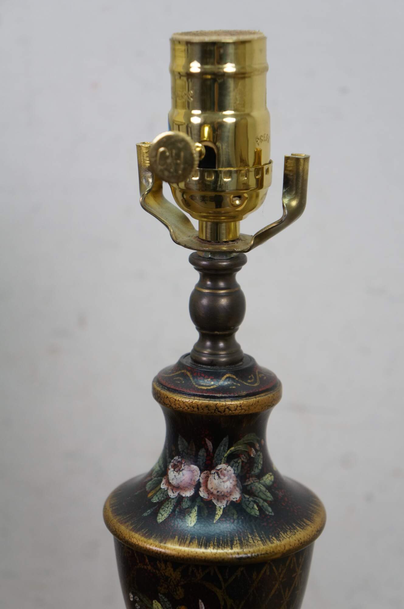 Vintage pair of Chelsea House table lamps featuring a Neoclassical black tole painted floral design with a cylindrical pedestals supporting a pair of mantel vases / trophy urns.Some chips/cracks in lacquer; bent finials