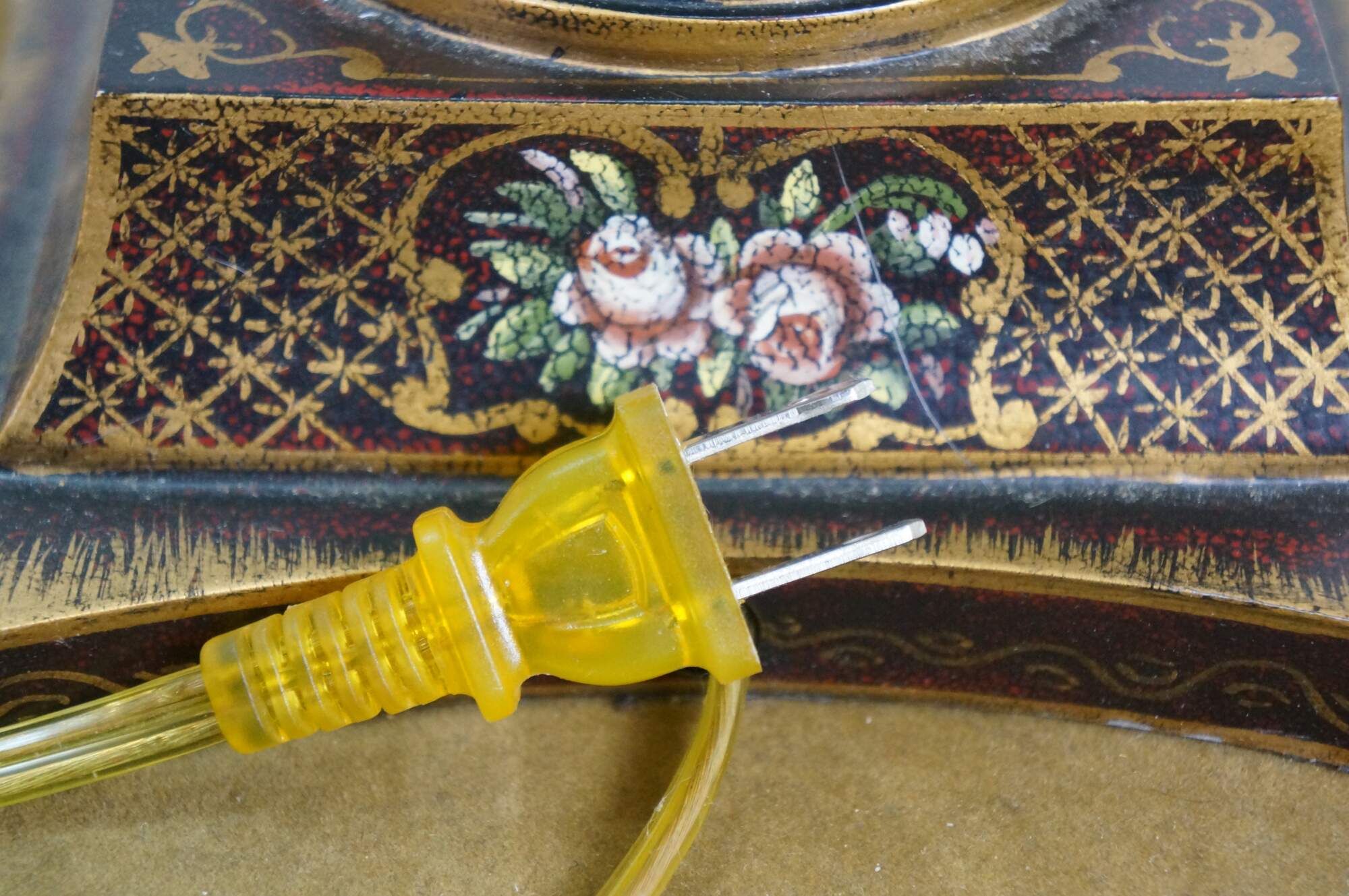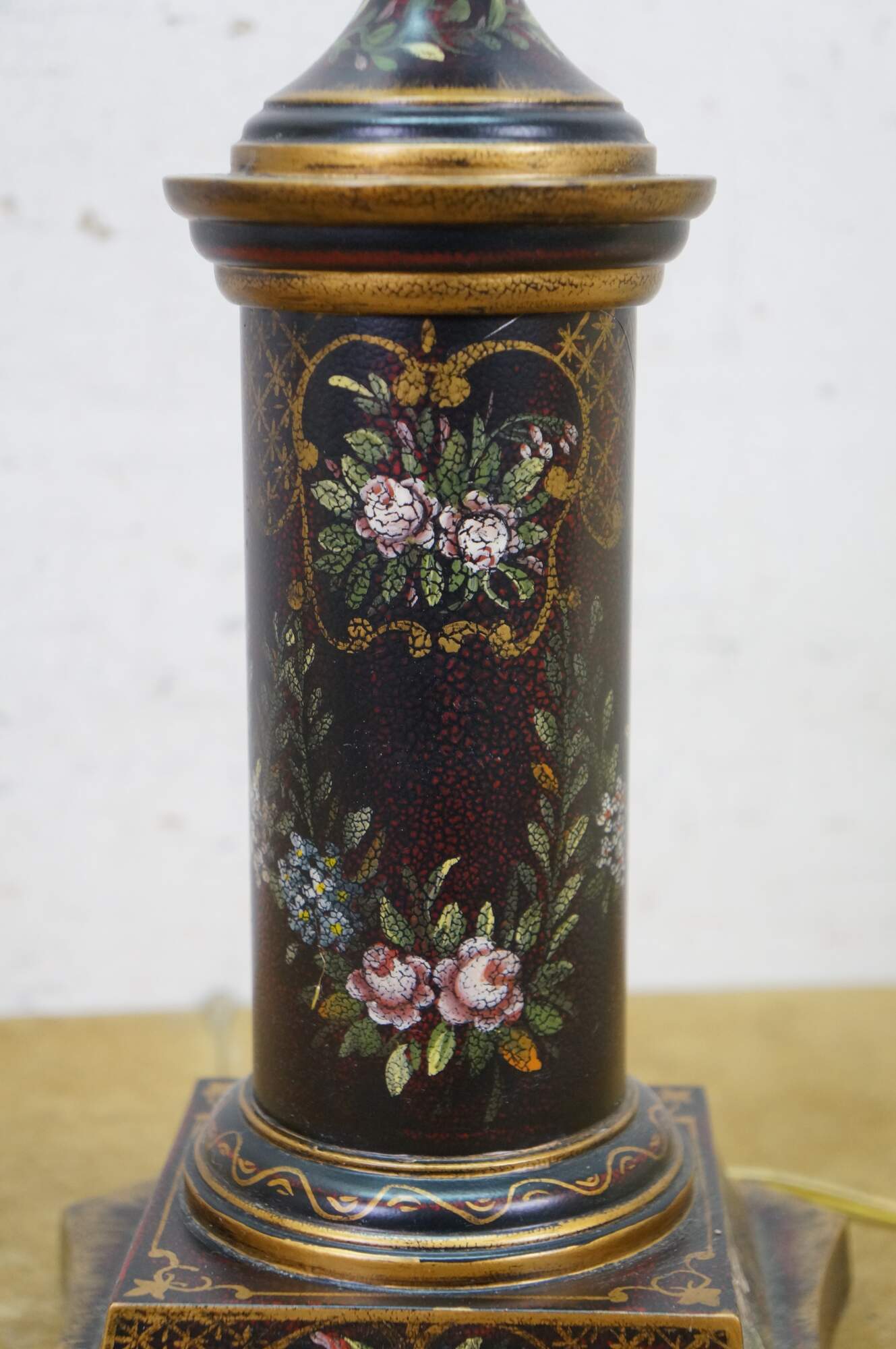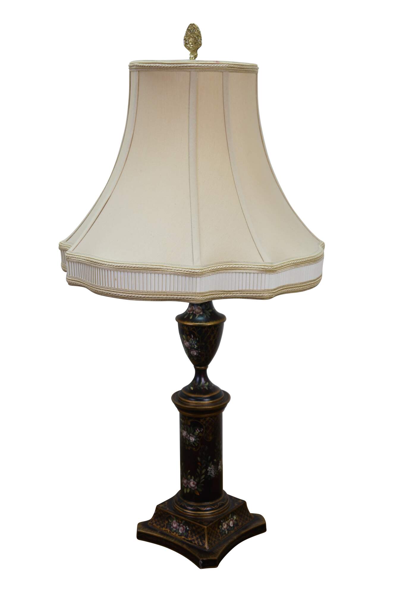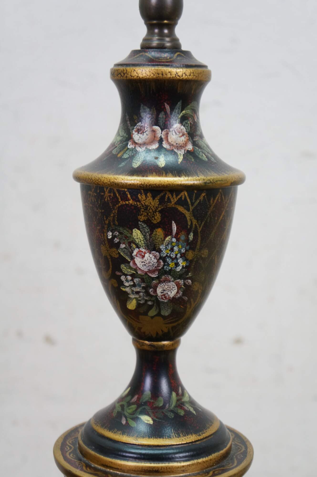 Vintage pair of Chelsea House table lamps featuring a Neoclassical black tole painted floral design with a cylindrical pedestals supporting a pair of mantel vases / trophy urns.Some chips/cracks in lacquer; bent finials
