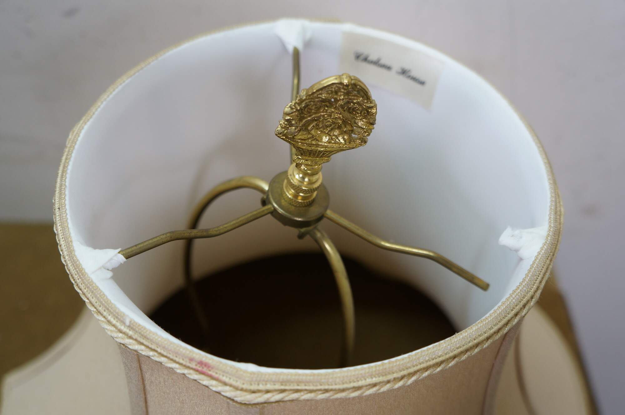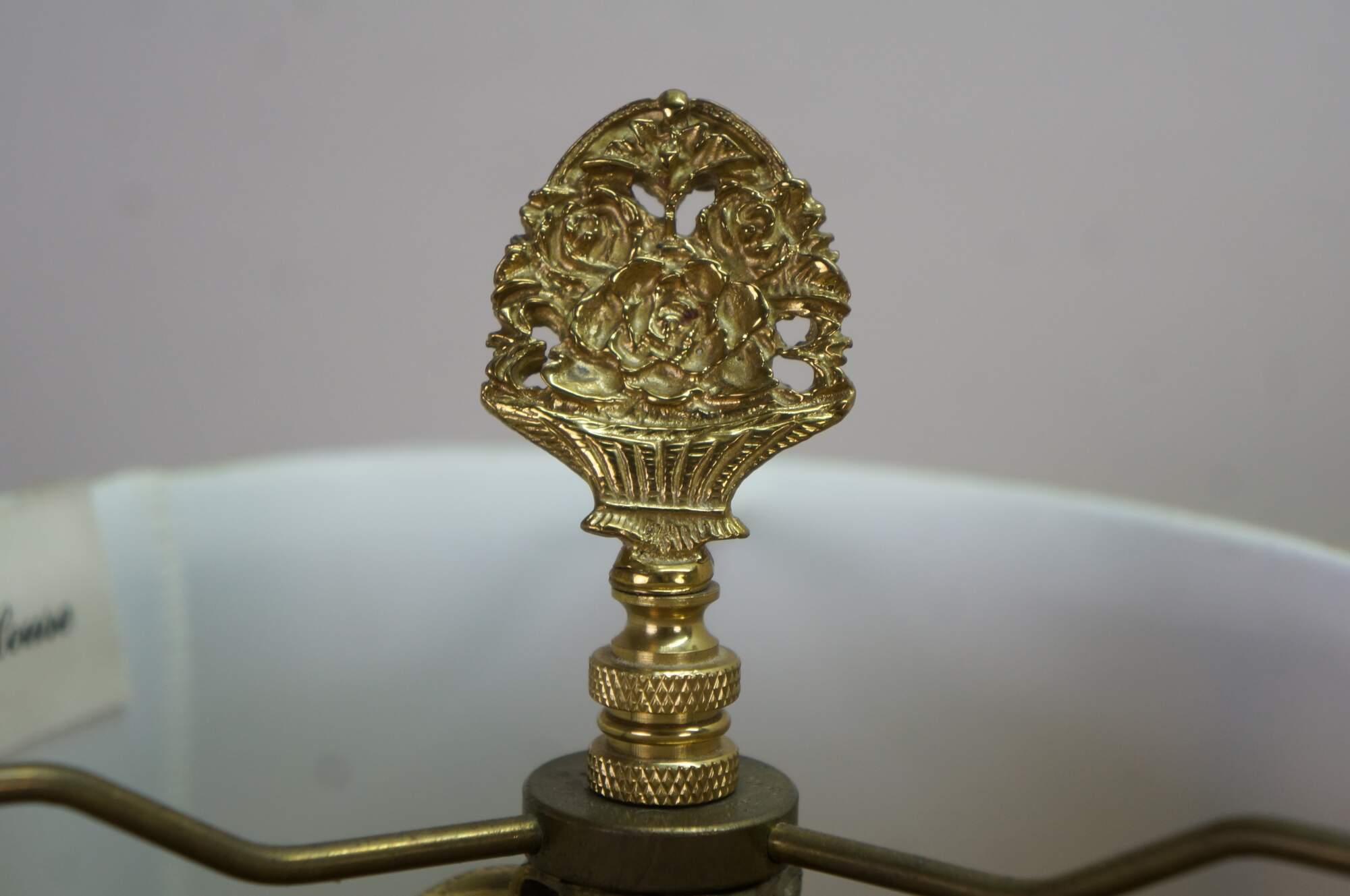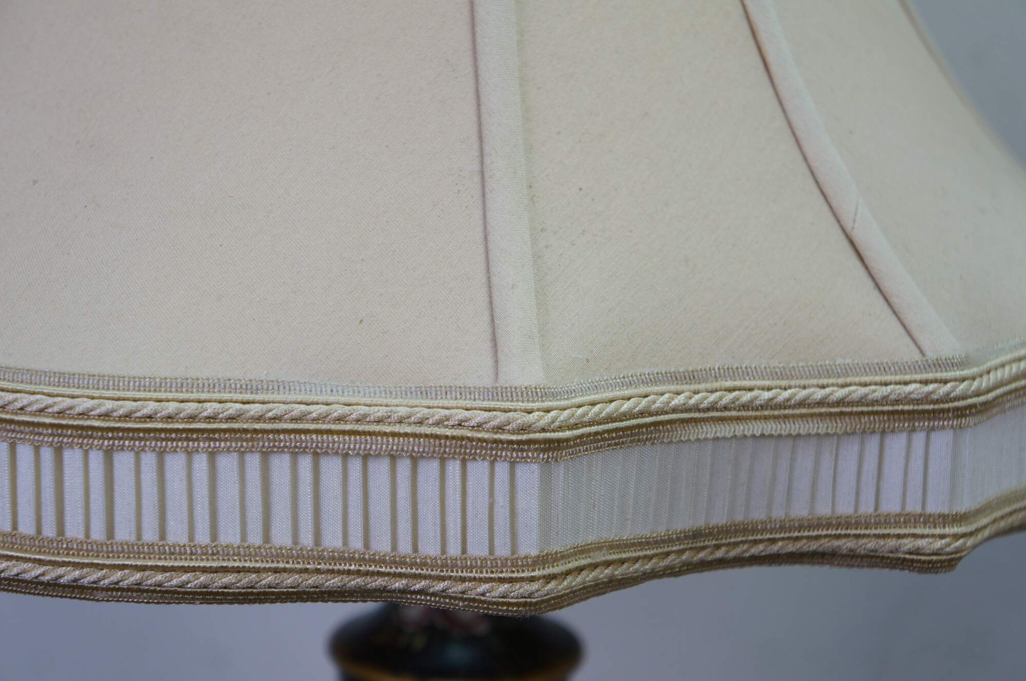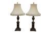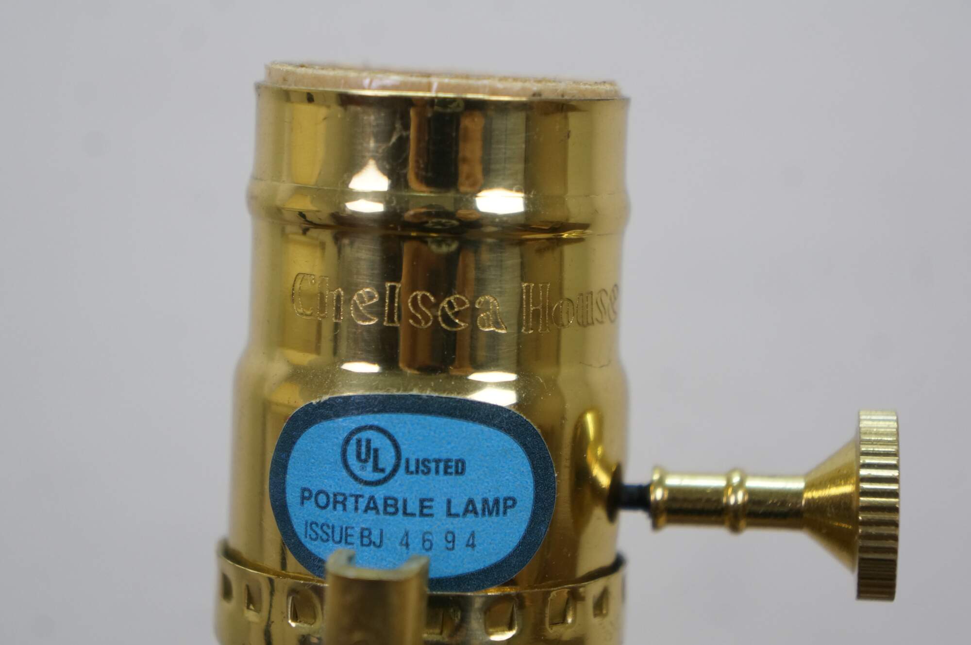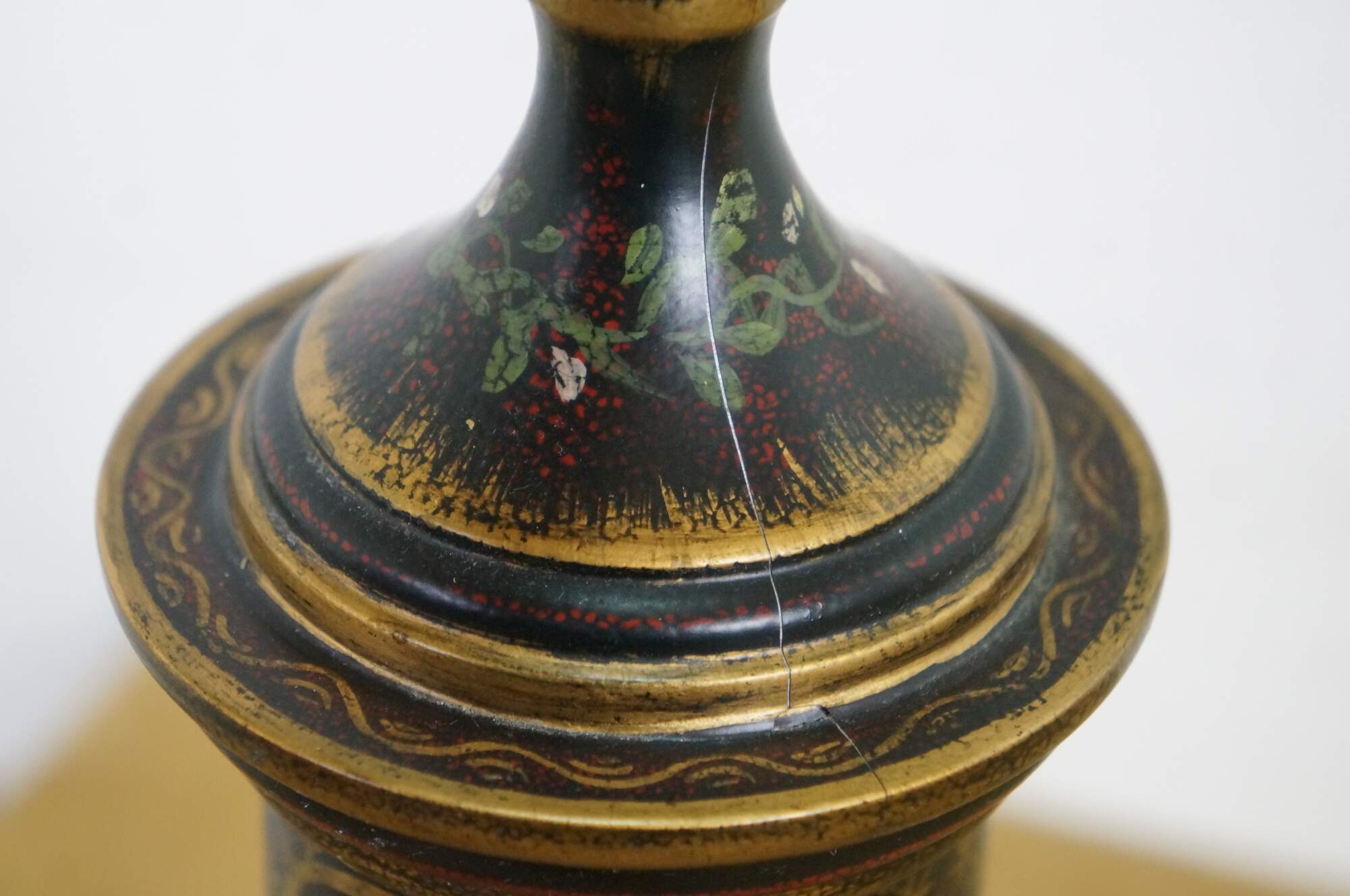 Vintage pair of Chelsea House table lamps featuring a Neoclassical black tole painted floral design with a cylindrical pedestals supporting a pair of mantel vases / trophy urns.Some chips/cracks in lacquer; bent finials