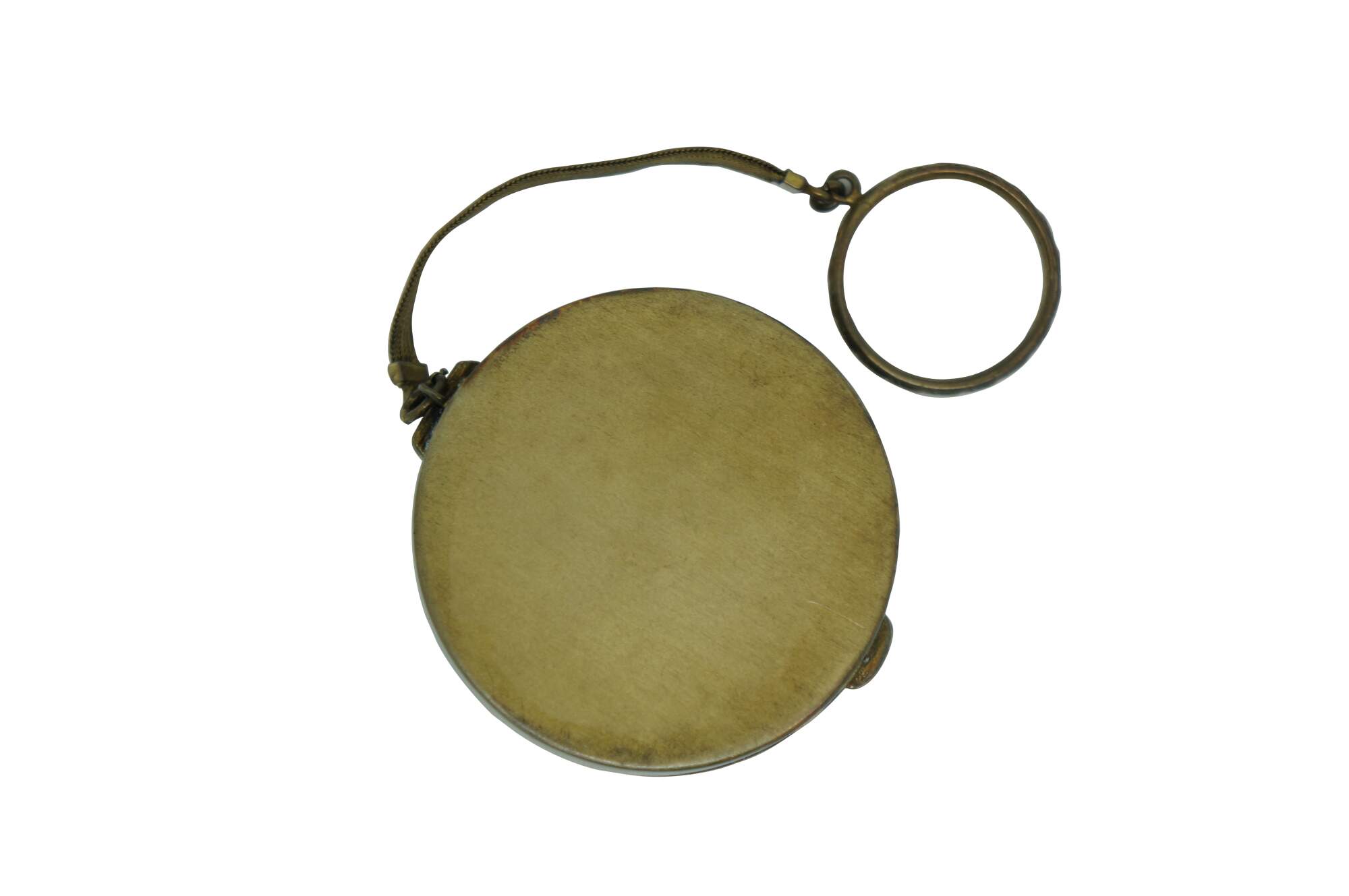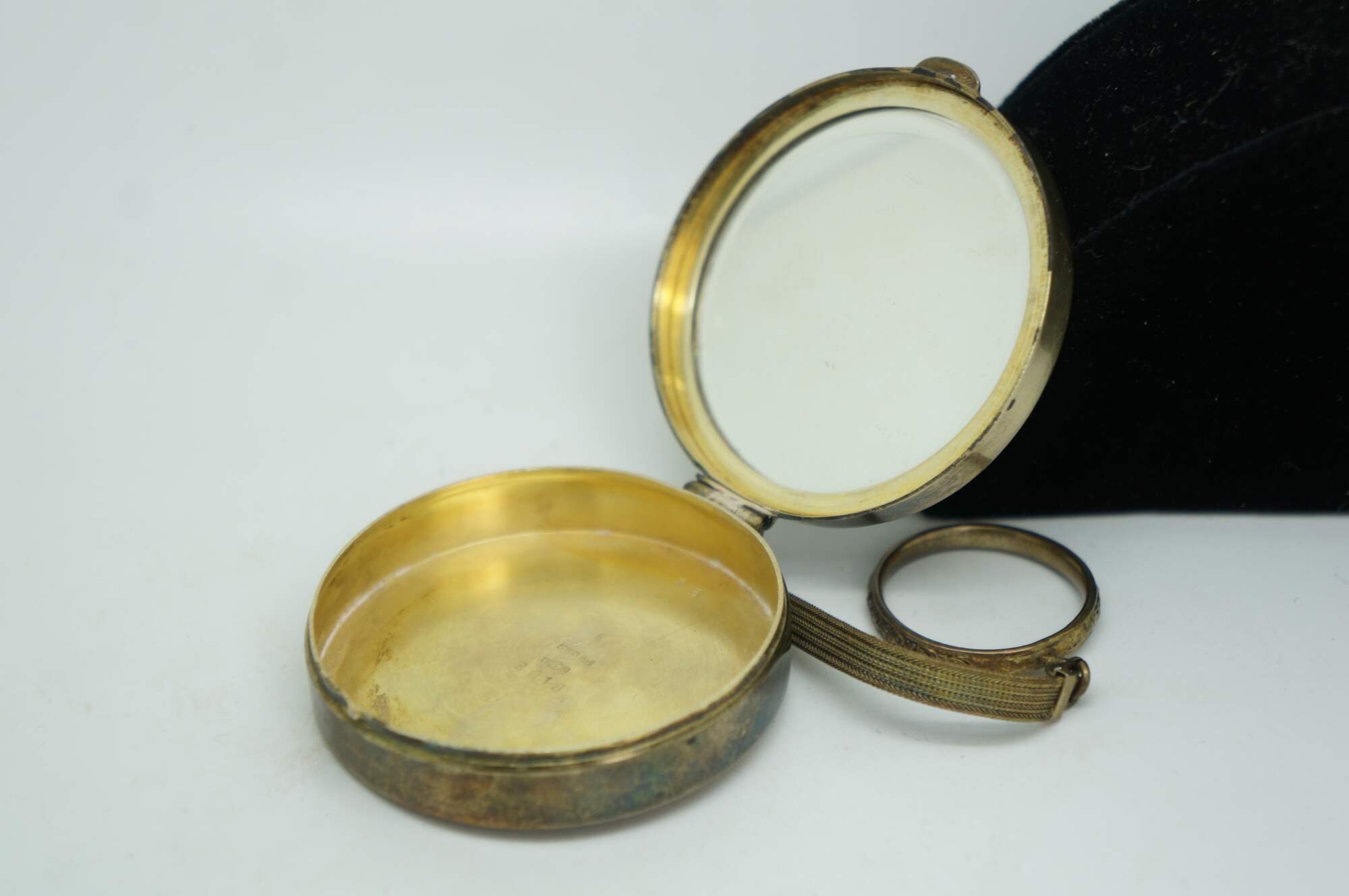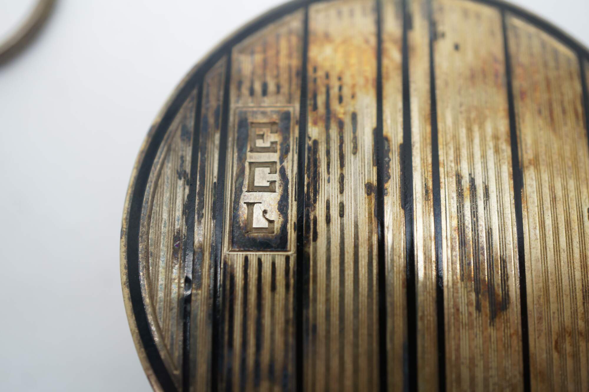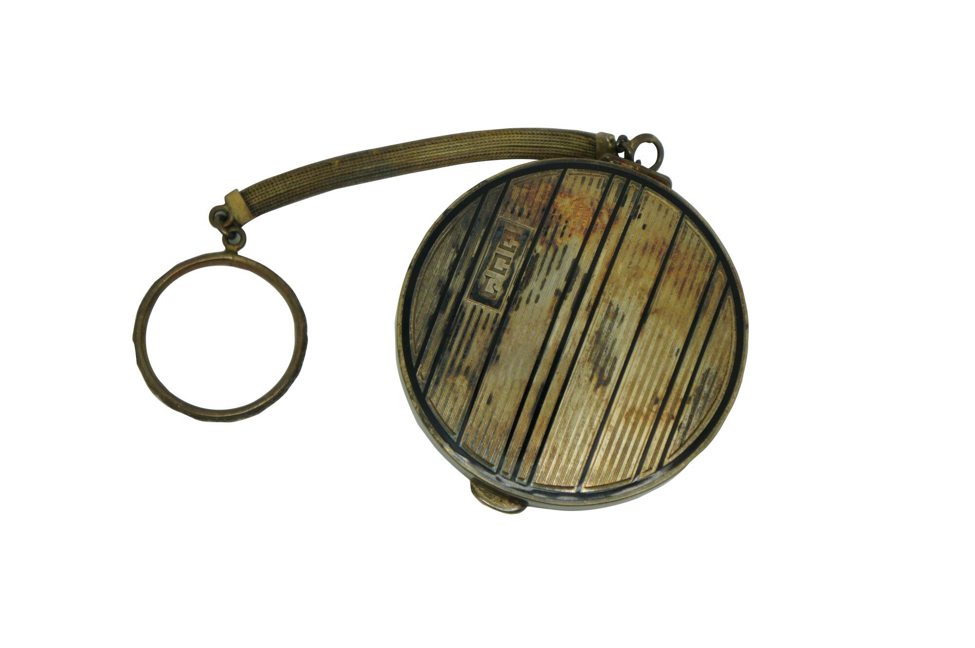 Antique art deco sterling silver makeup compact with mirror and keyring / chain. Marked with a crown, script T, and lion passant for Sheffield England. Monogram ECL,