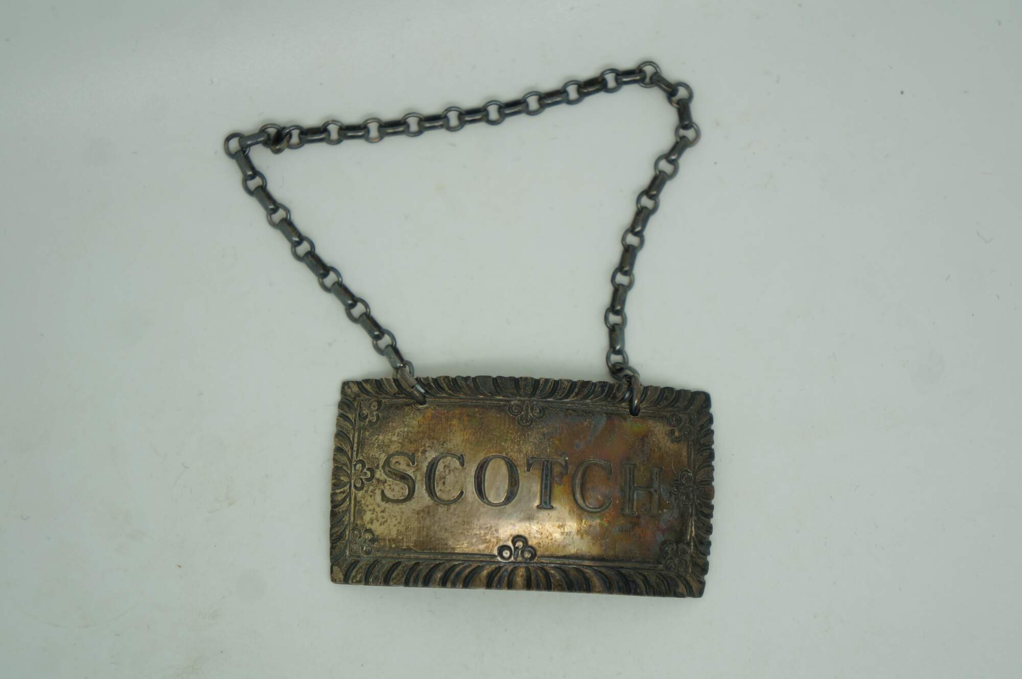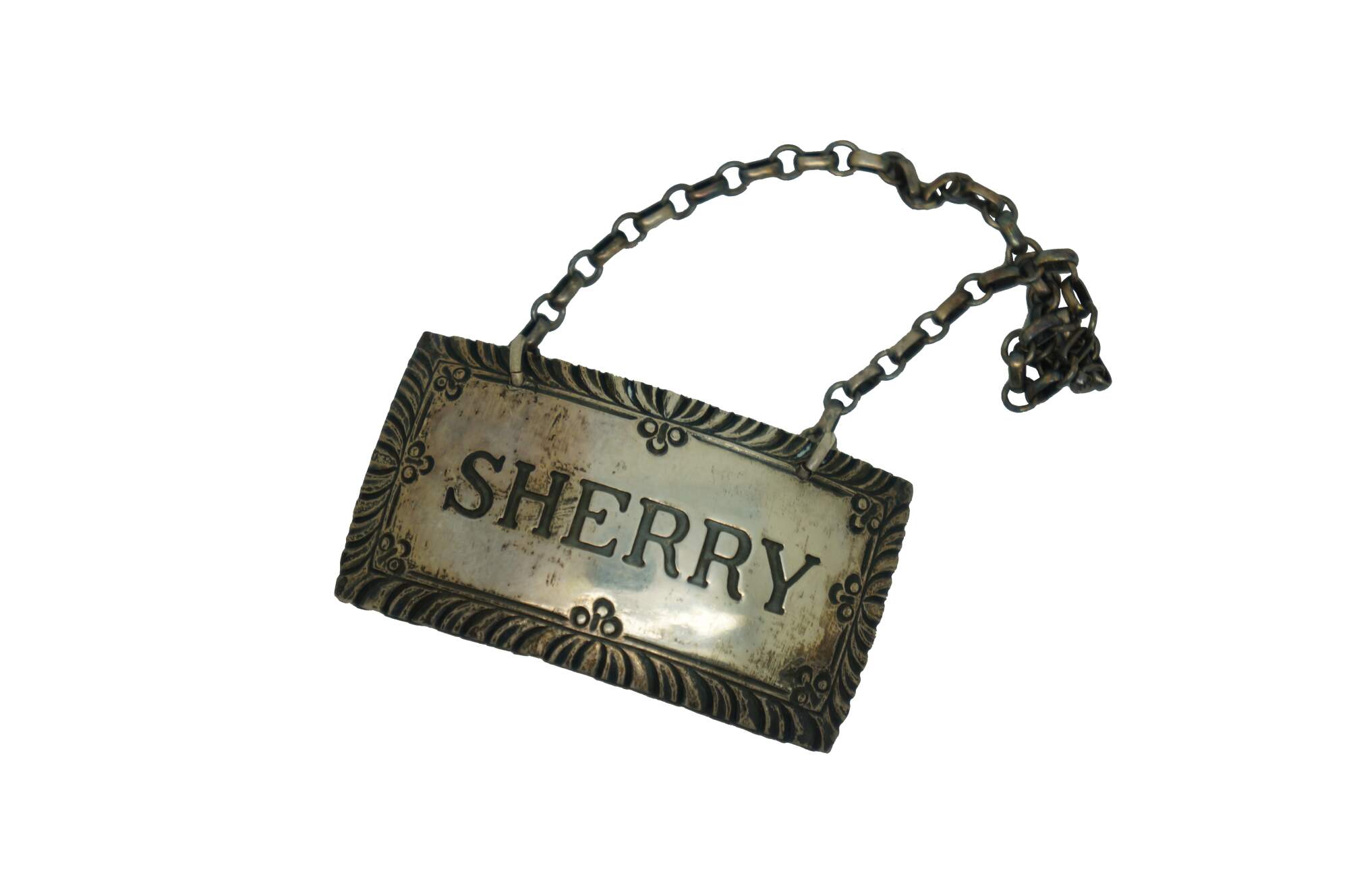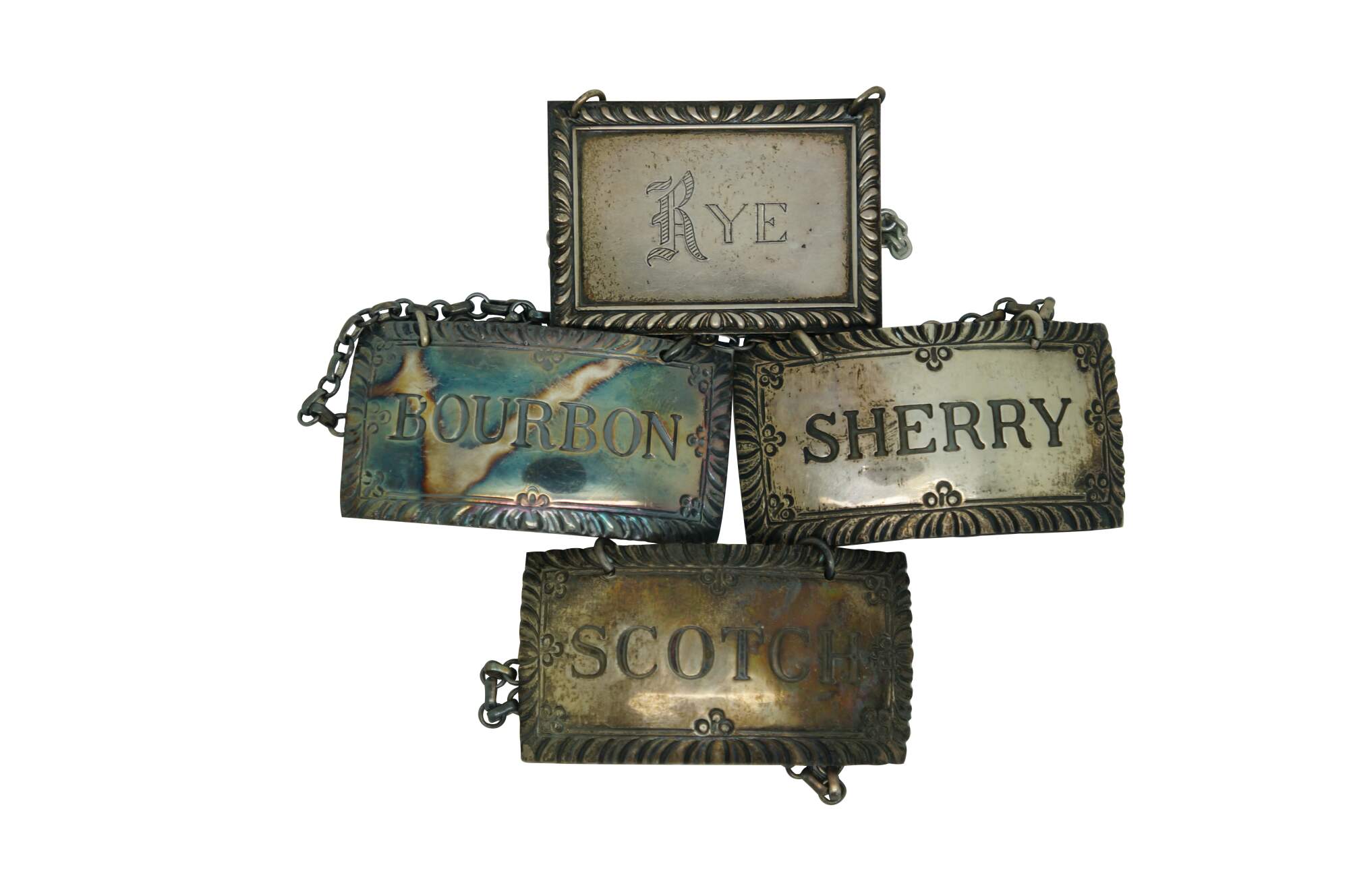 Five antique sterling silver 925 liquor decanter bottle badges / labels / plaques.