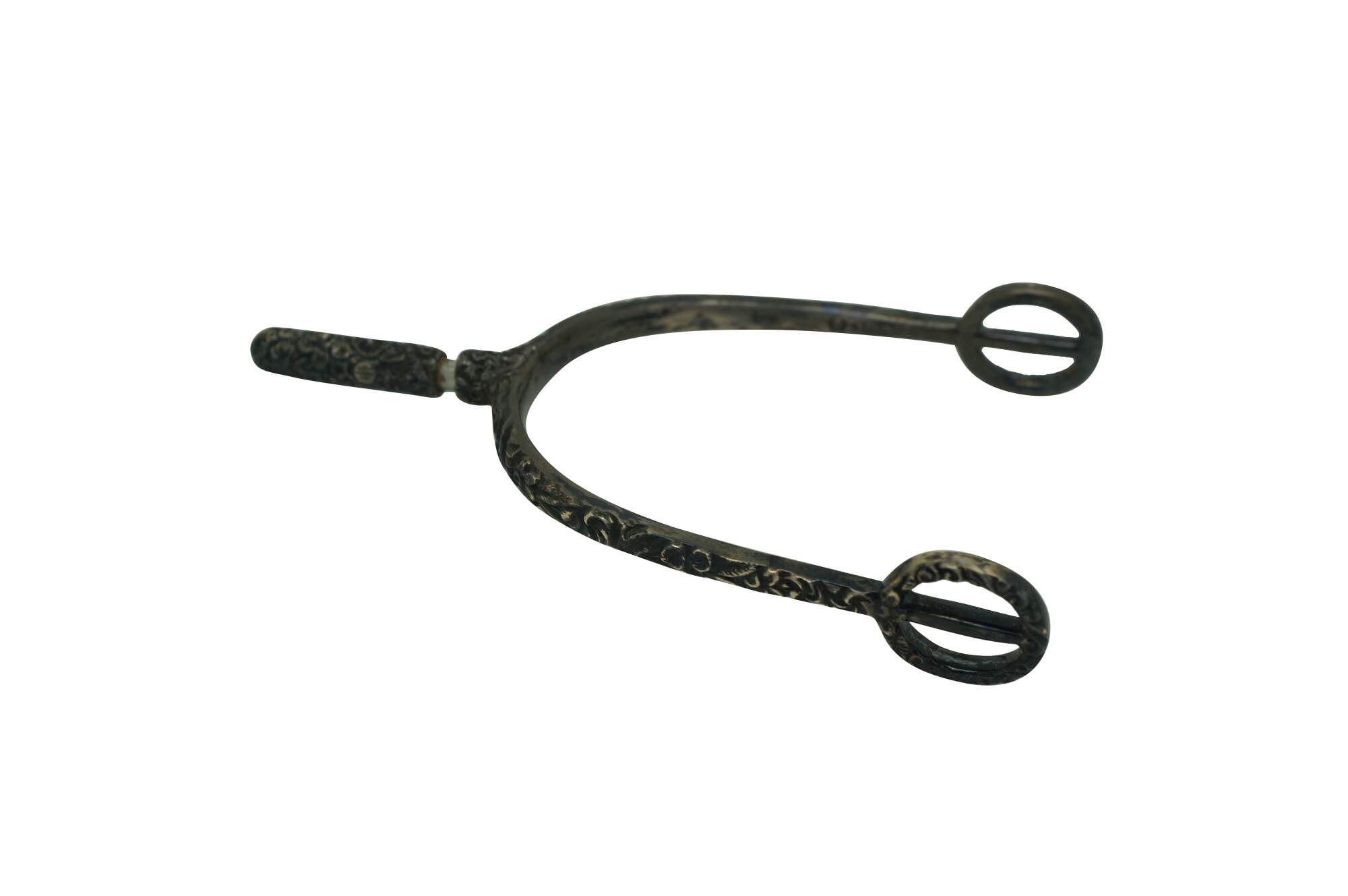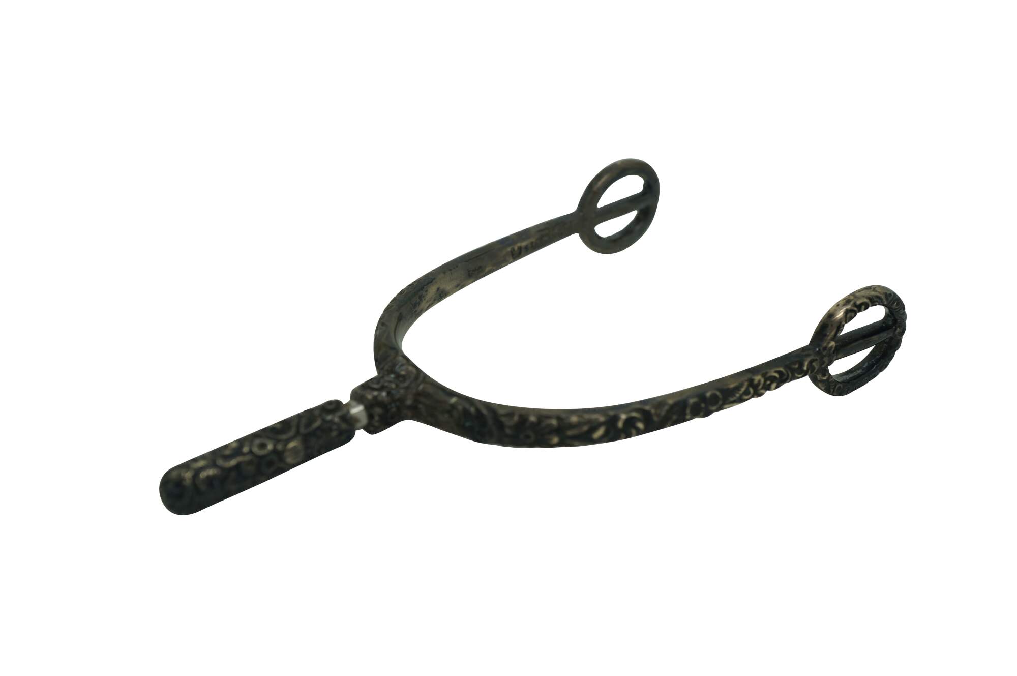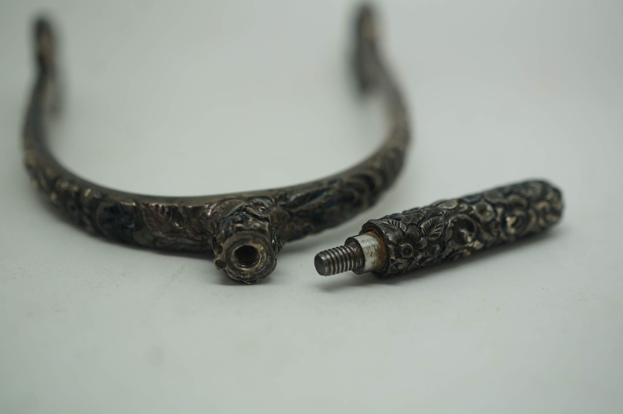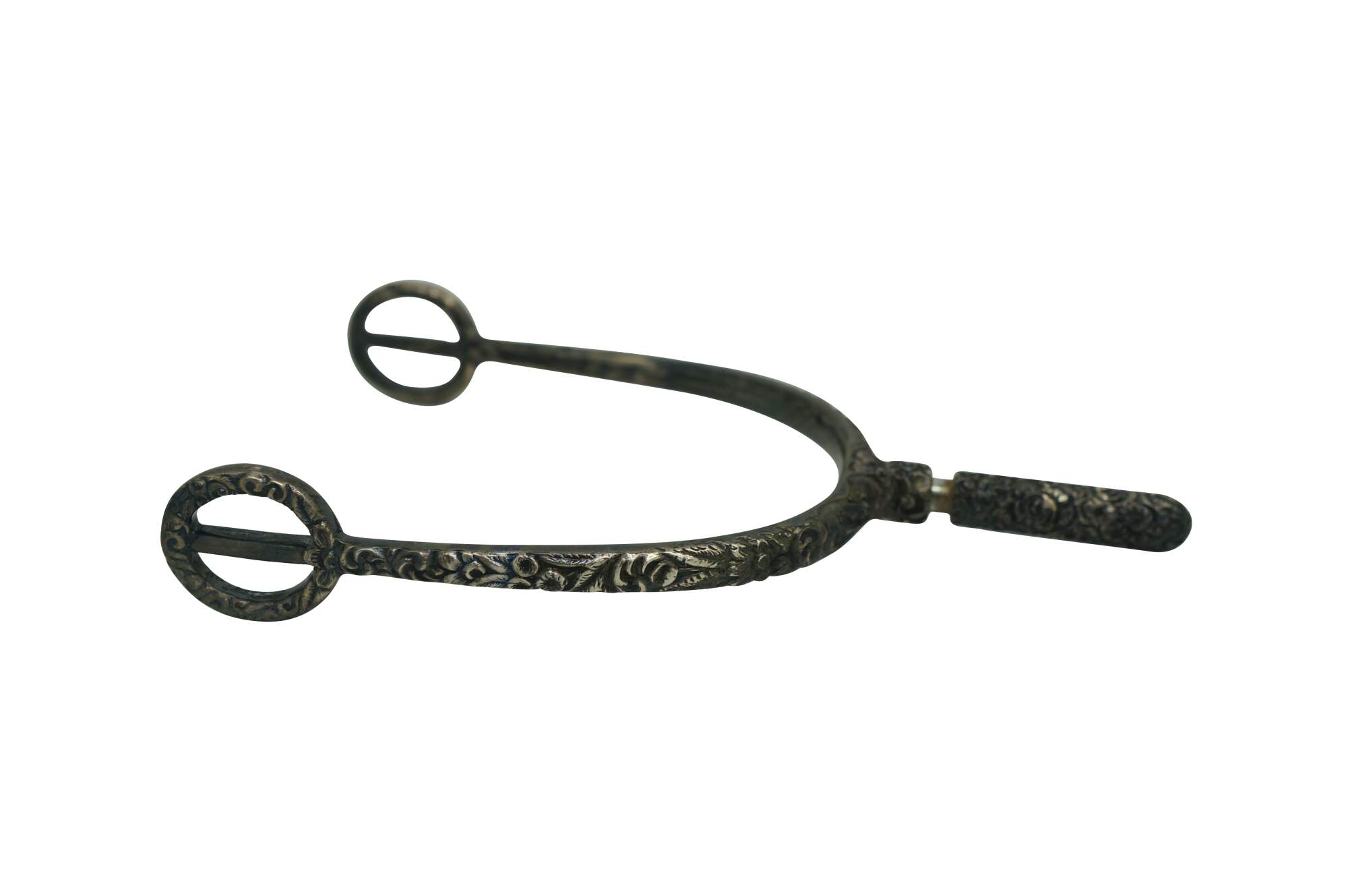Antique repousse sterling silver equestrian horse spur featuring an ornate floral design with removable screw top. Circa pre civil war / late 19th century.