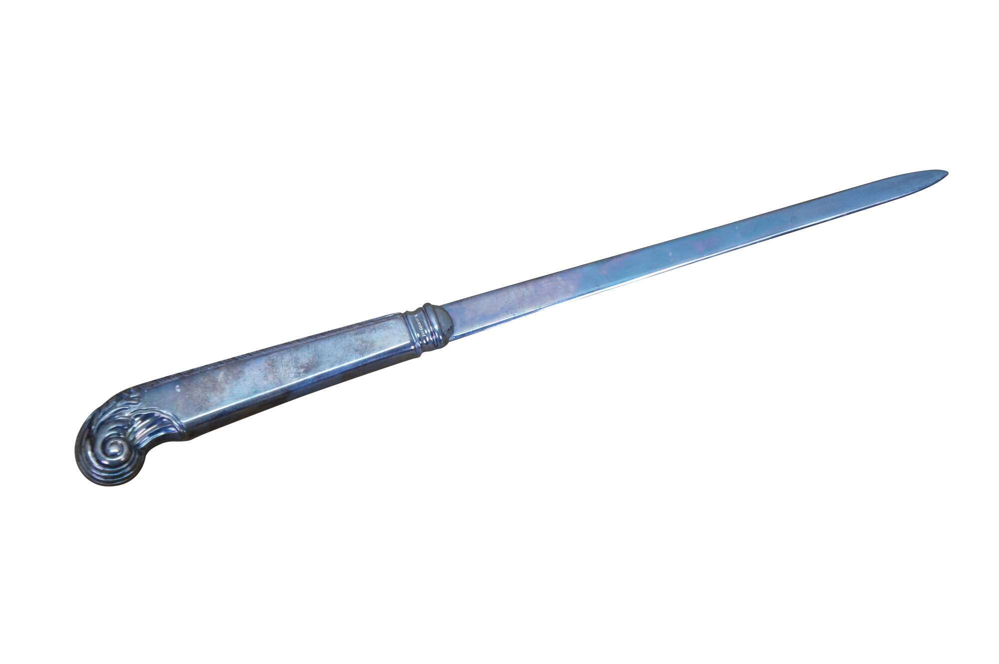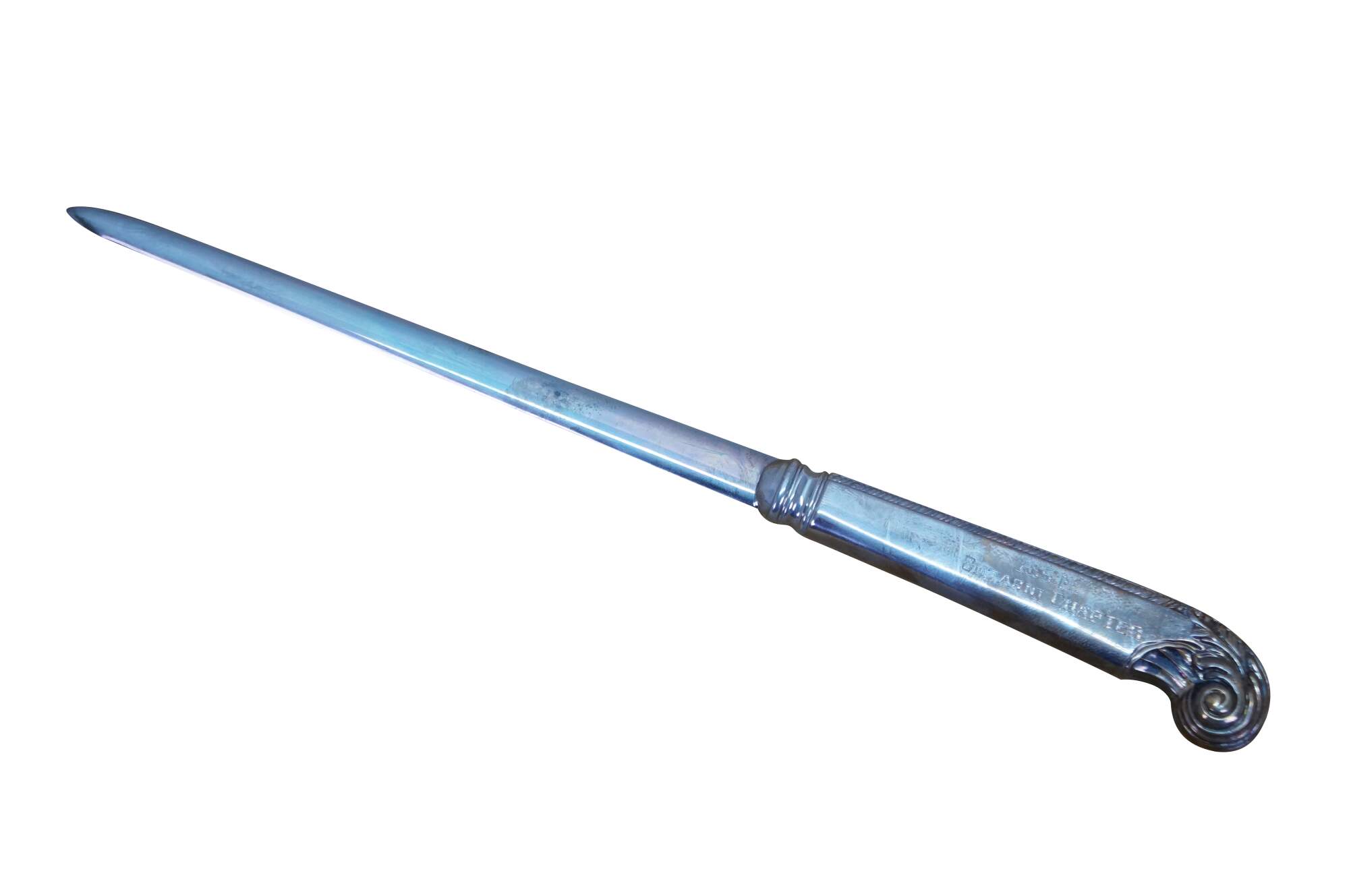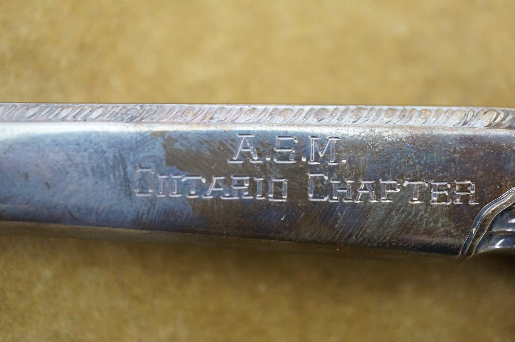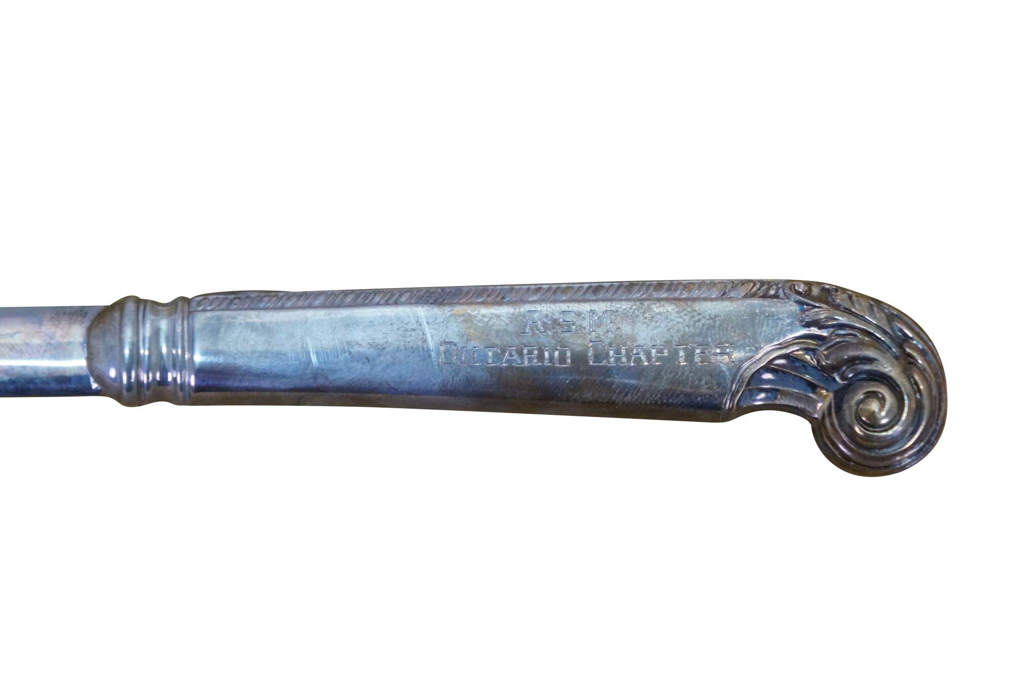 Mid century Birks sterling silver letter opener featuring a scrolled acanthus design and the inscription A.S.M Ontario Chapter.