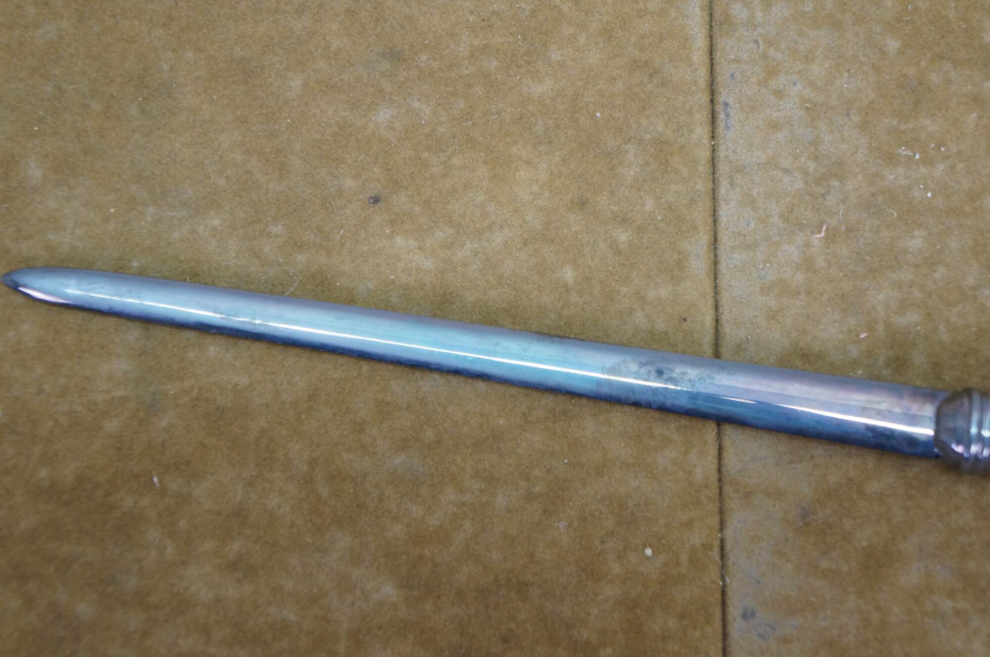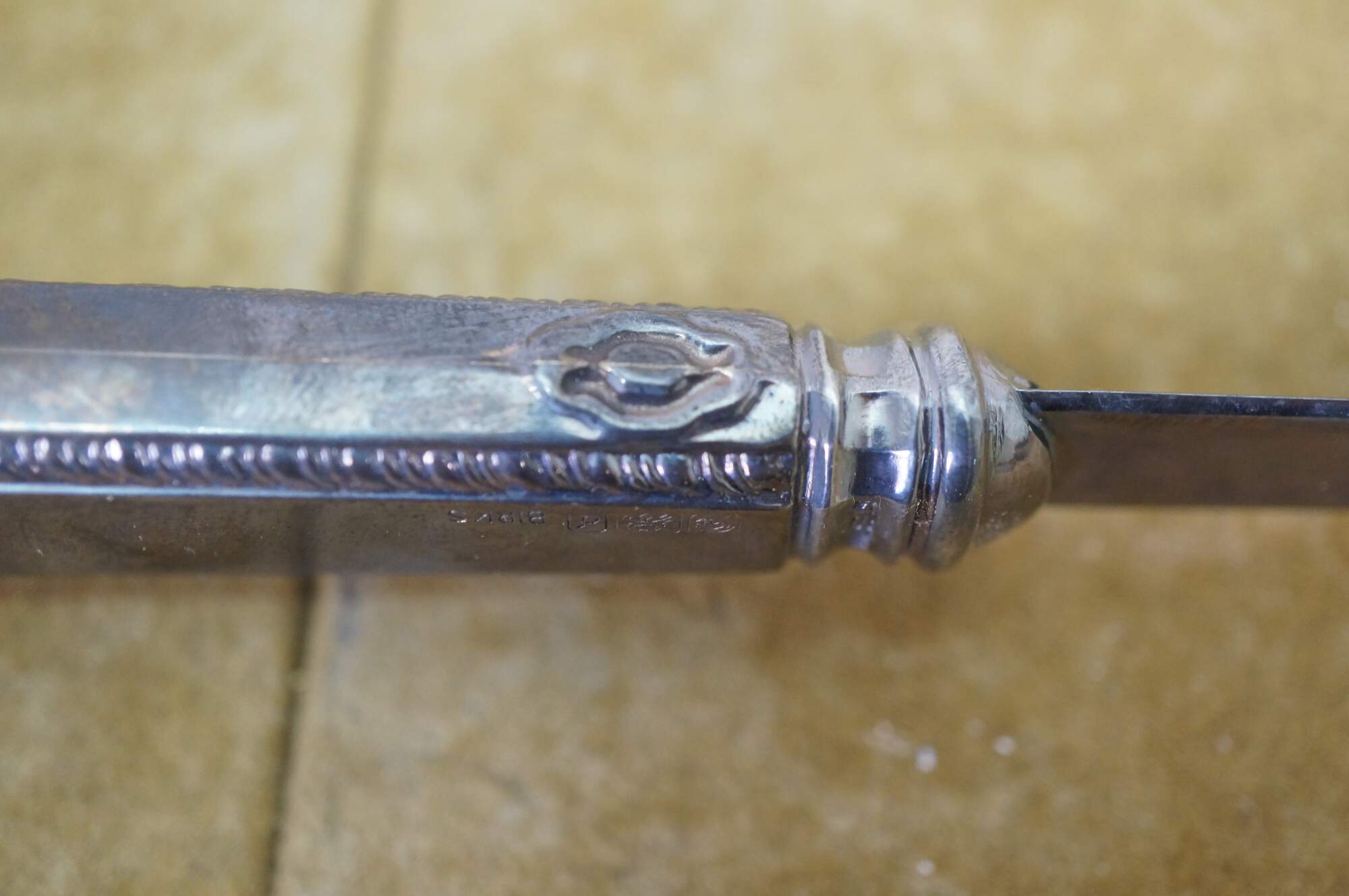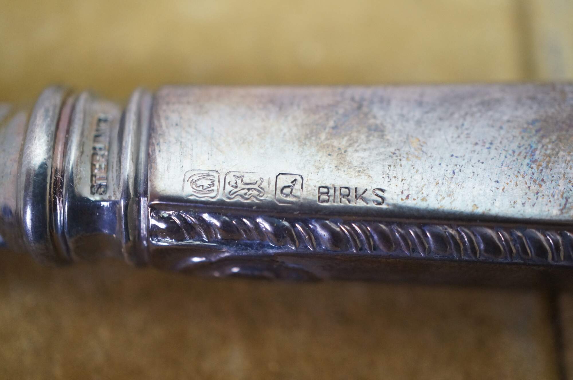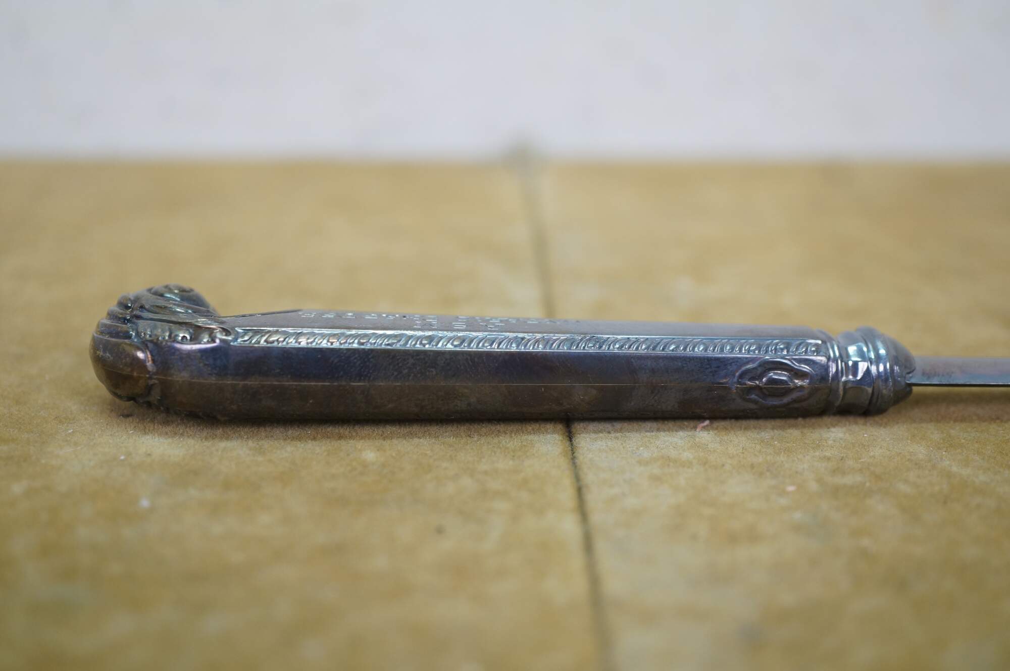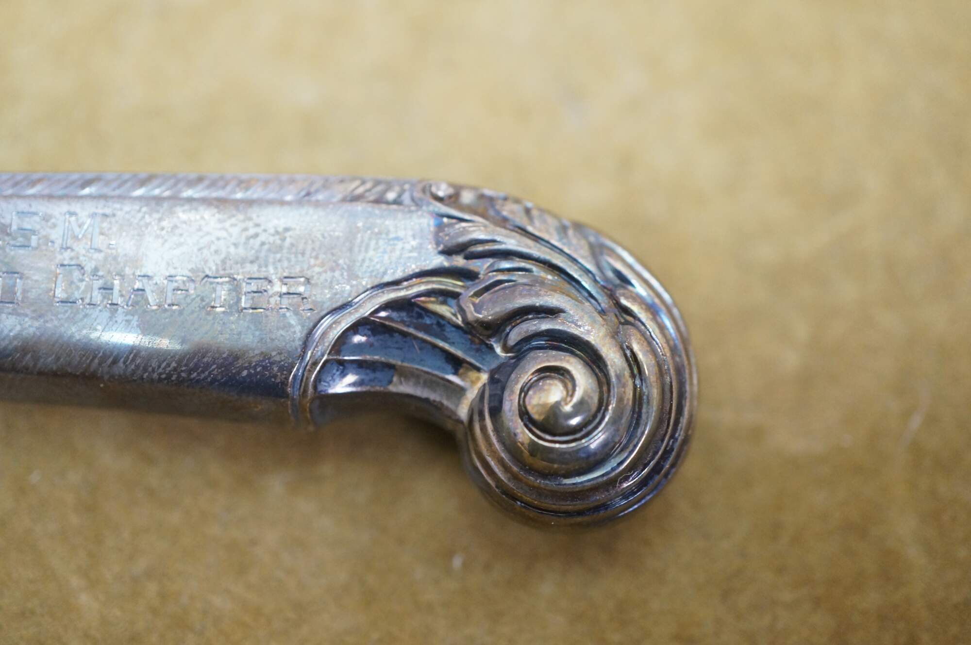Mid century Birks sterling silver letter opener featuring a scrolled acanthus design and the inscription A.S.M Ontario Chapter.
