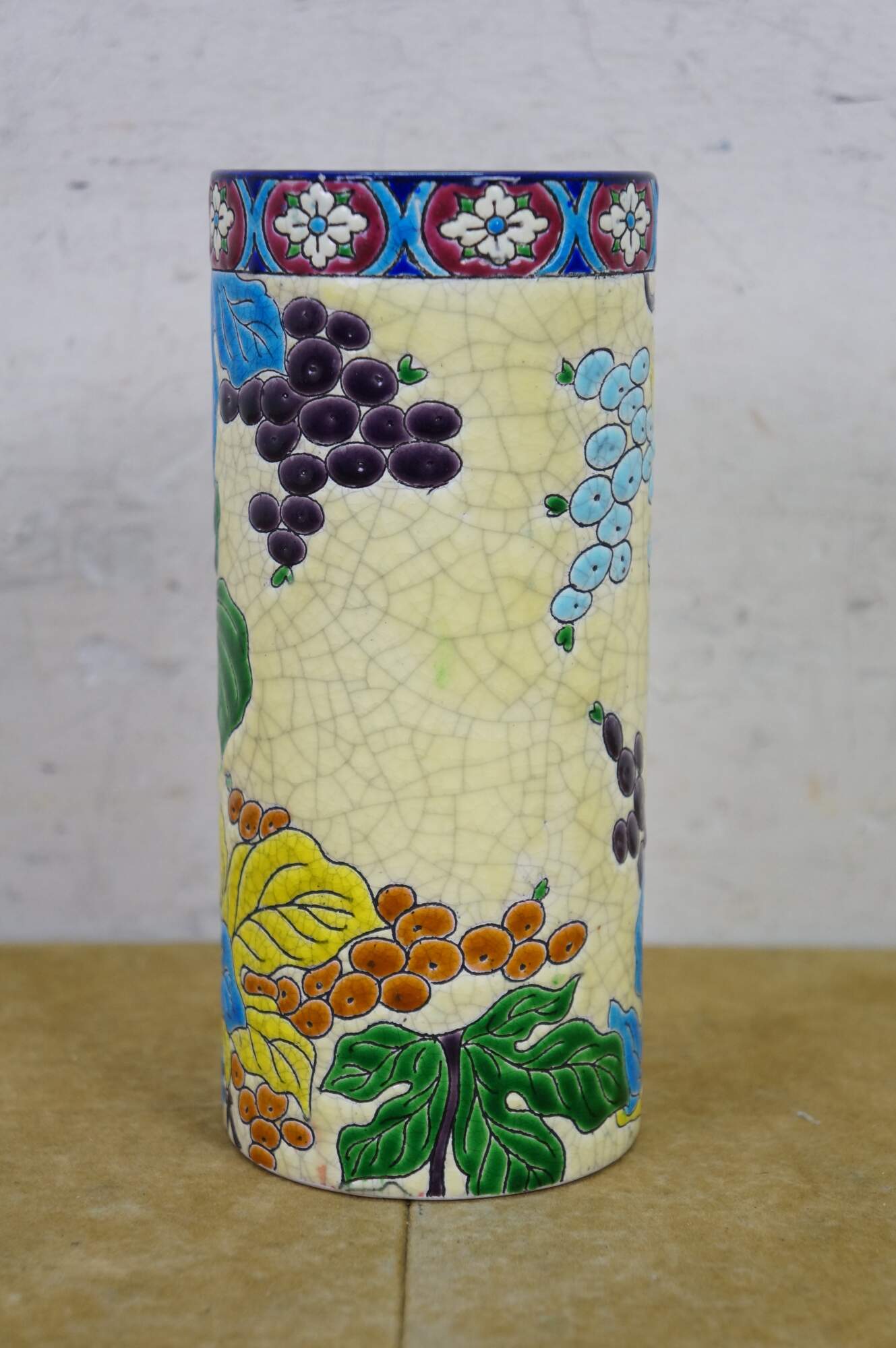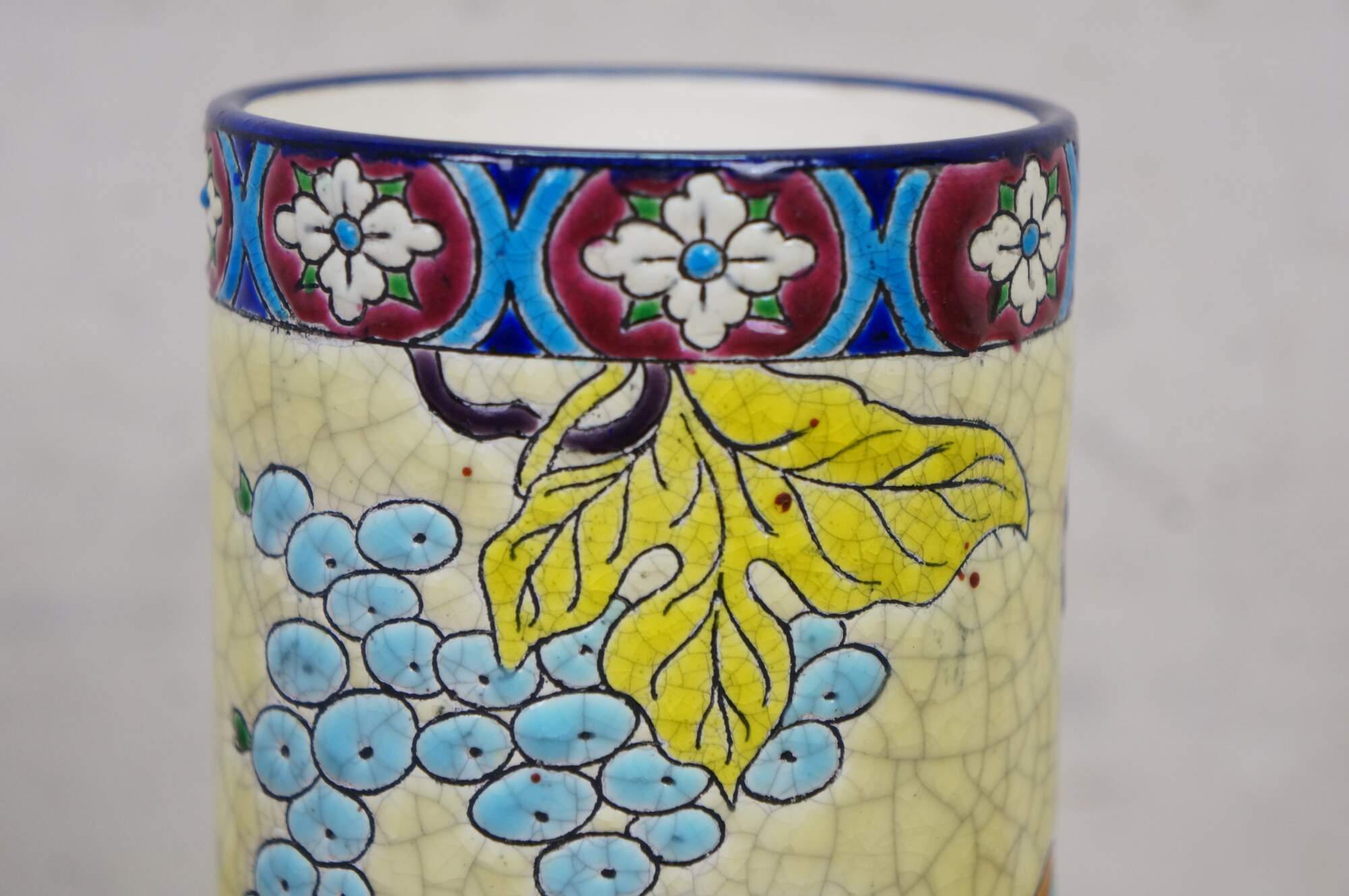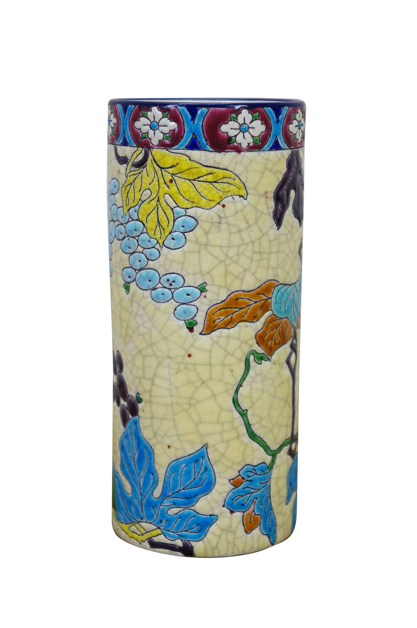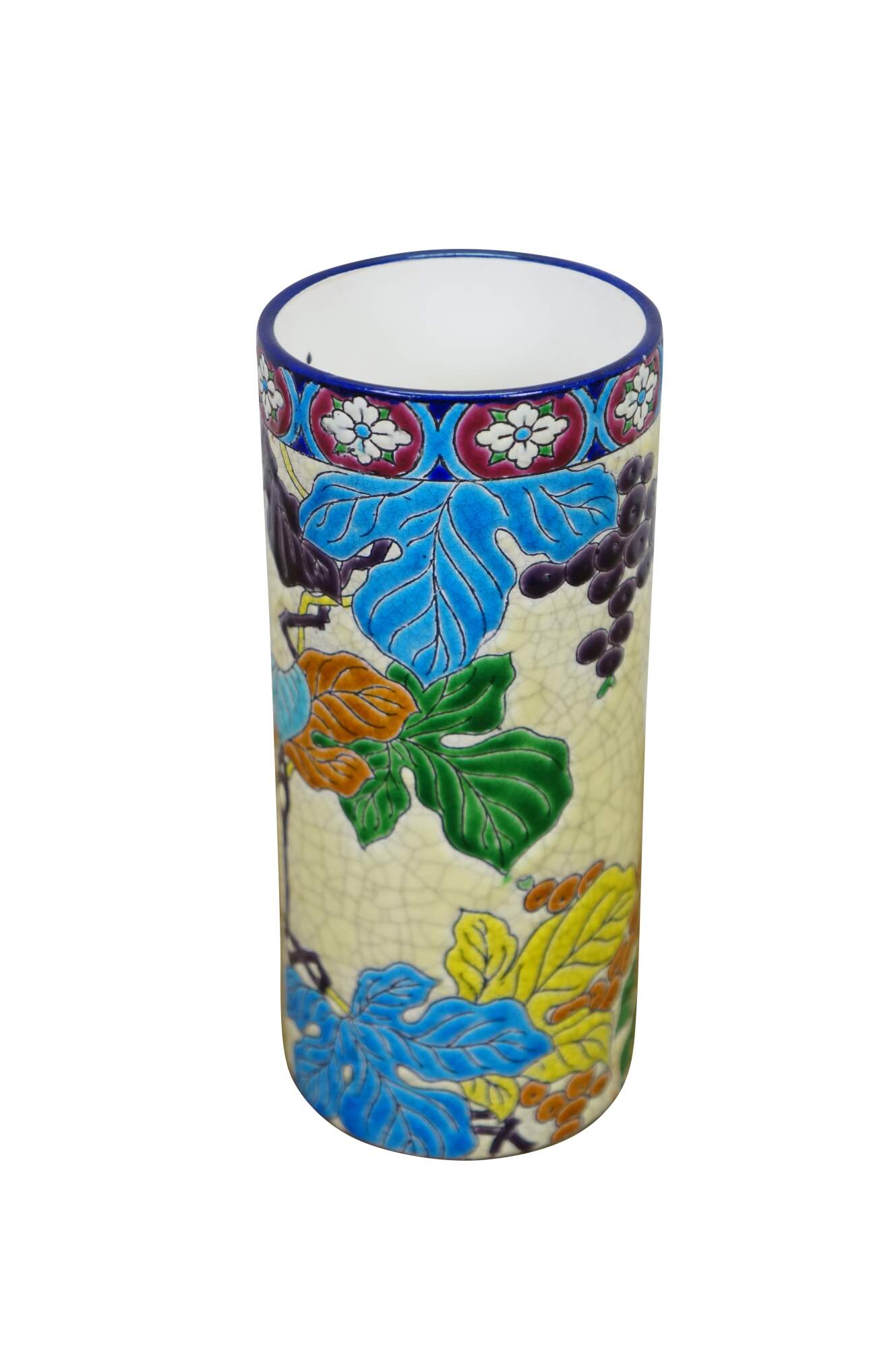 Antique French Longwy Emaux cloisonne enameled ceramic mantel vase or urn featuring a cylindrical shape with a floral grapevine / grapes / berries theme.