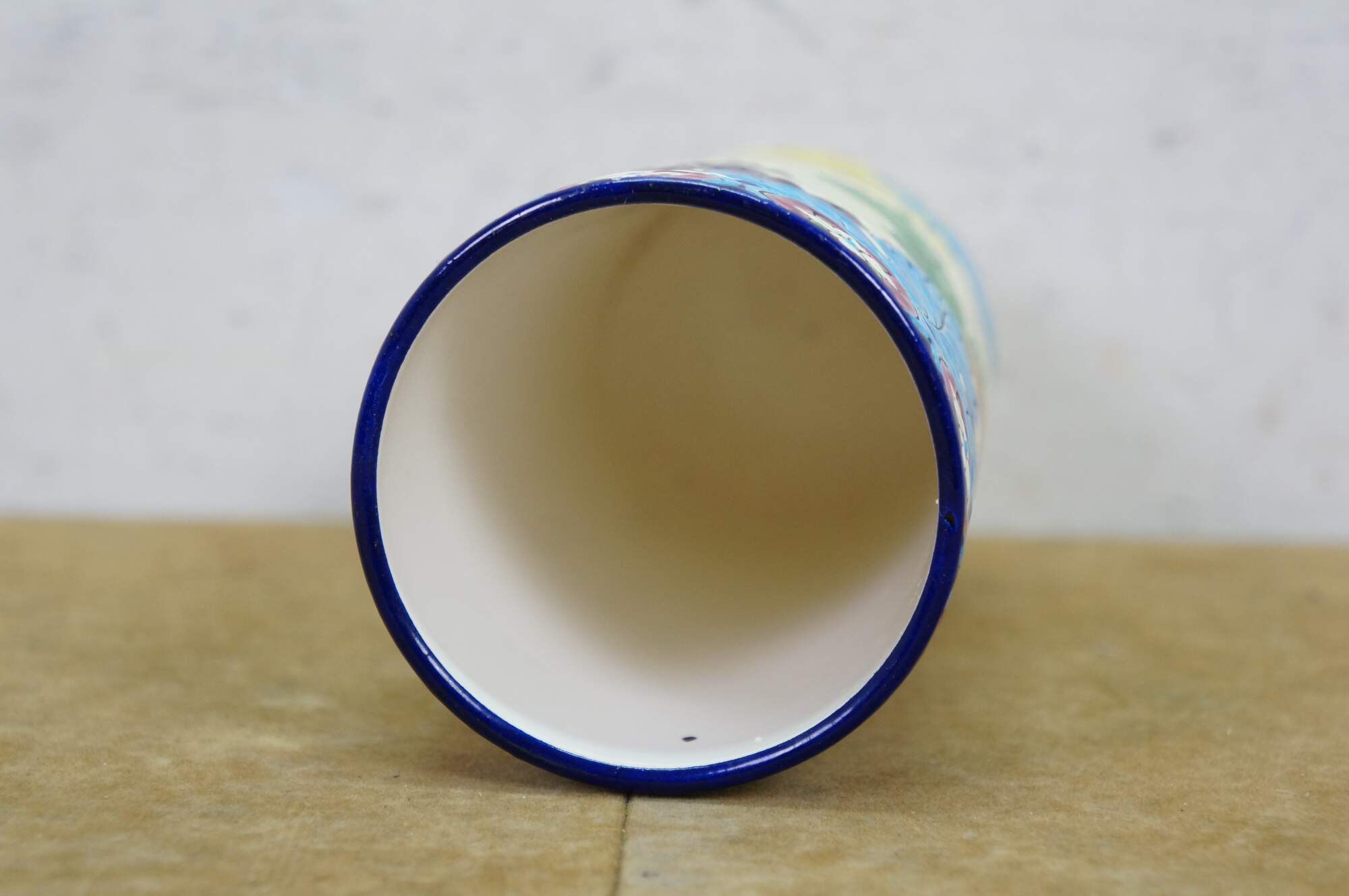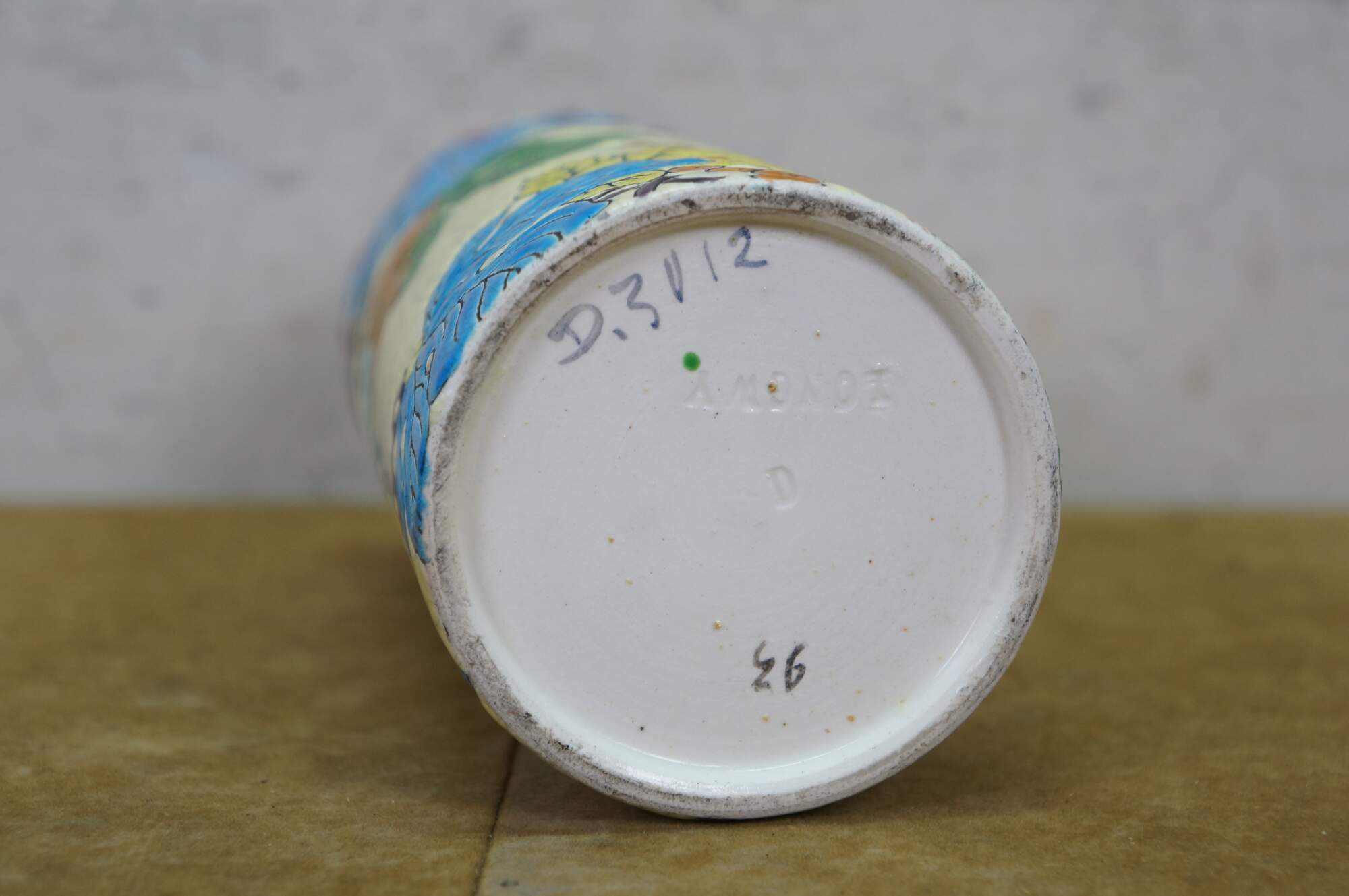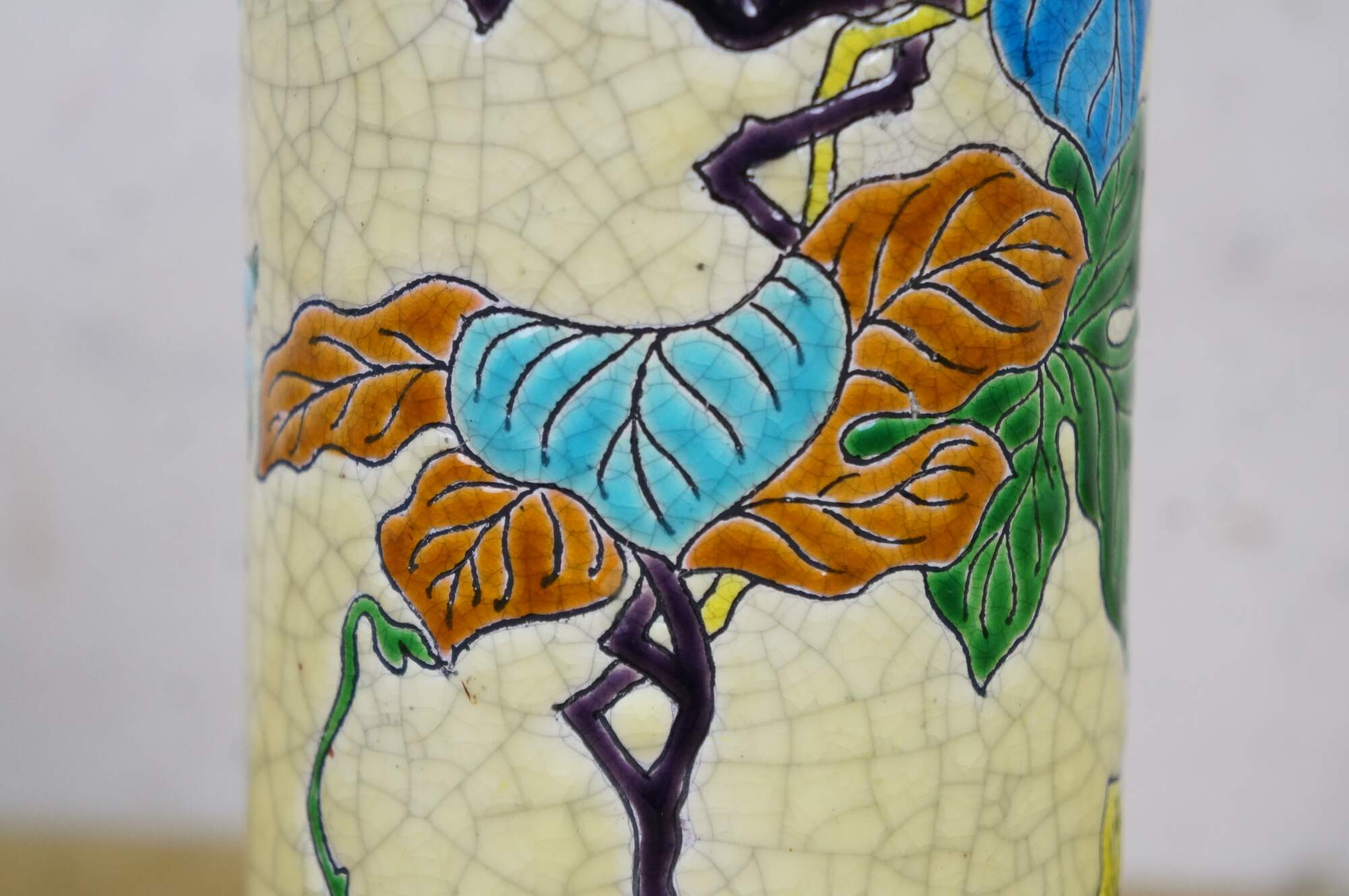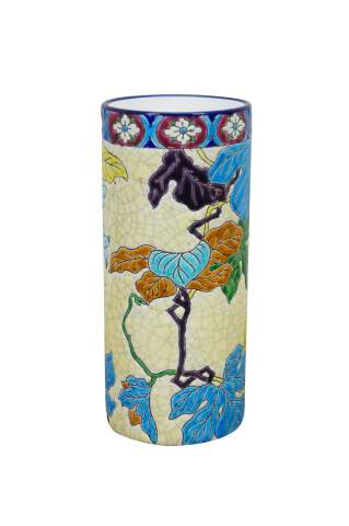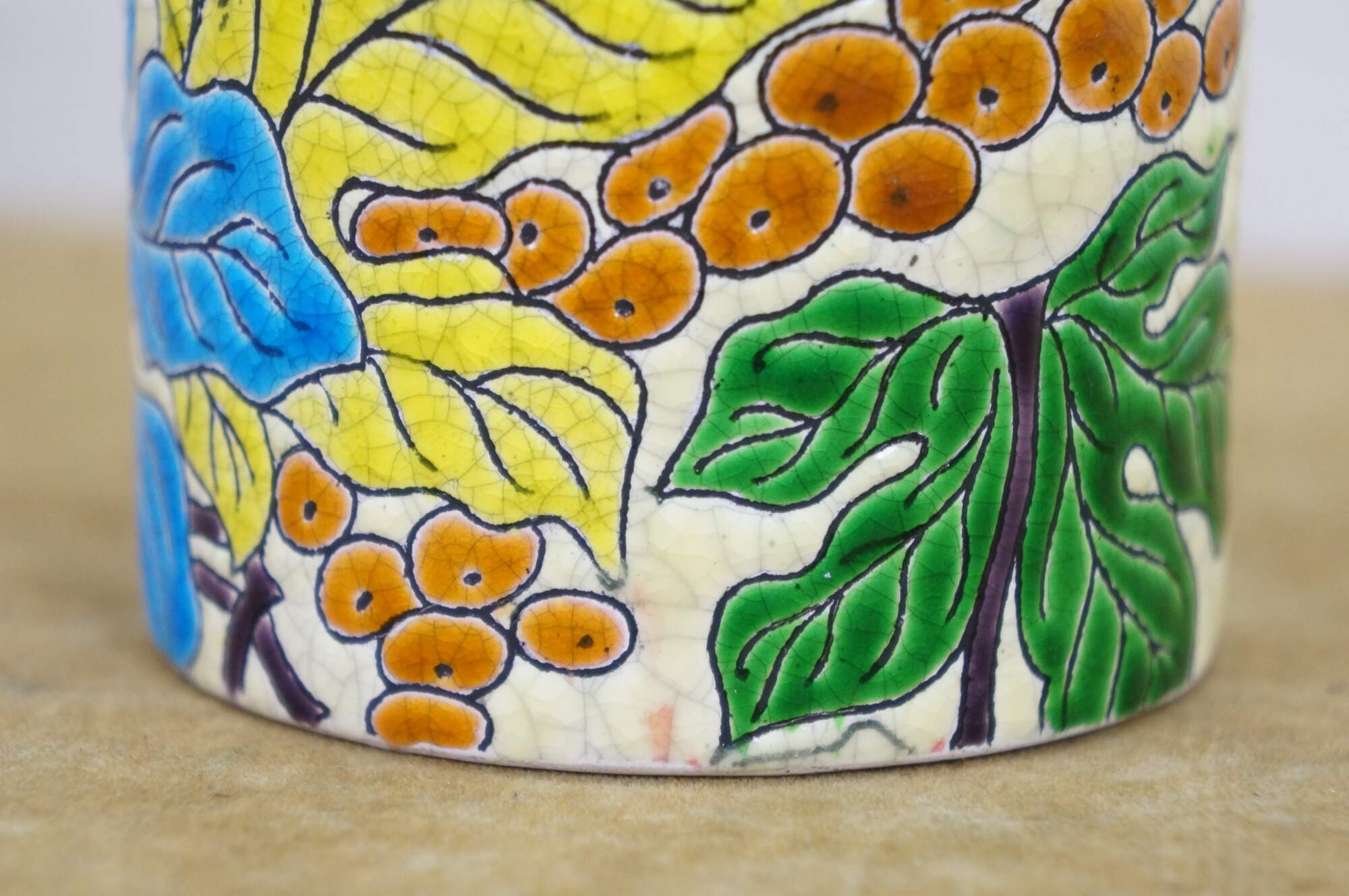 Antique French Longwy Emaux cloisonne enameled ceramic mantel vase or urn featuring a cylindrical shape with a floral grapevine / grapes / berries theme.