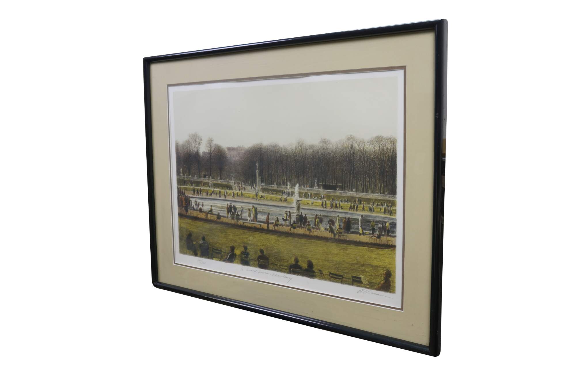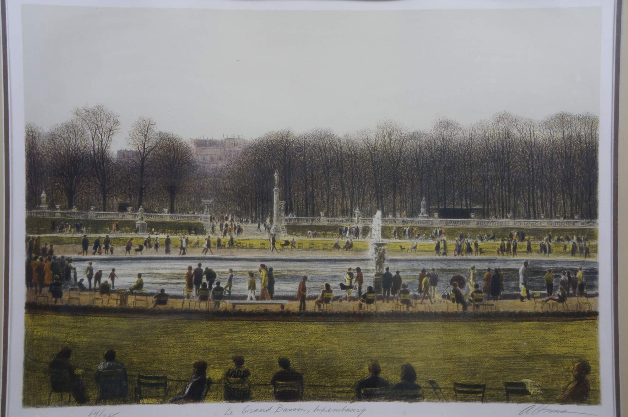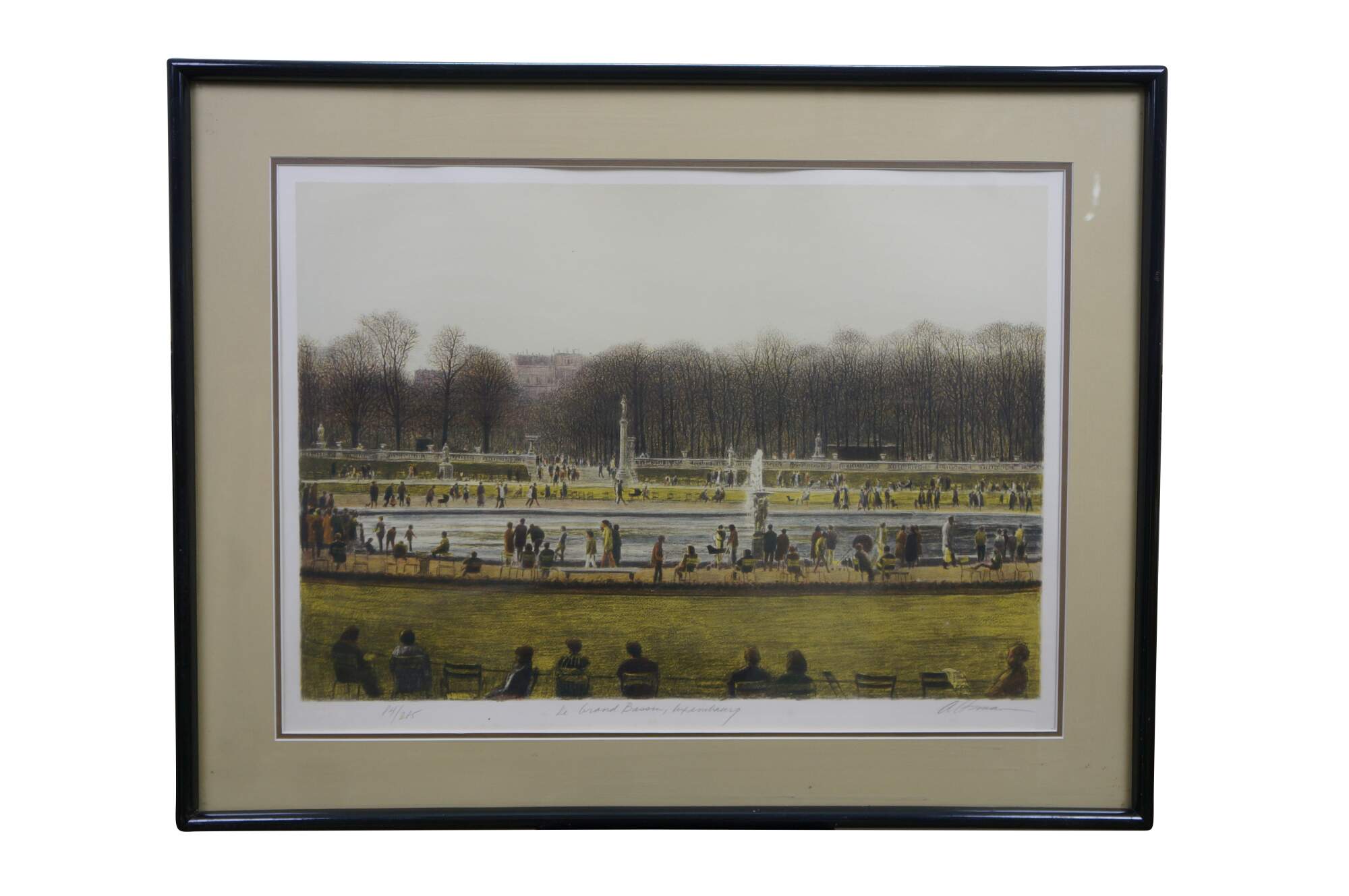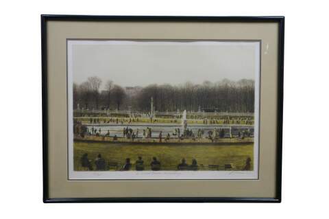 Vintage signed lithograph titled Le Grand Bassin, Luxembourg by American artist Harold Altman.� Harold Altman (1924–2003), a recognized American printmaker known for his park scenes. The artwork depicts the grand fountain pond in the Jardin du Luxembourg in Paris France. The print is hand signed and numbered by the artist. 84 / 285 circa 1983.