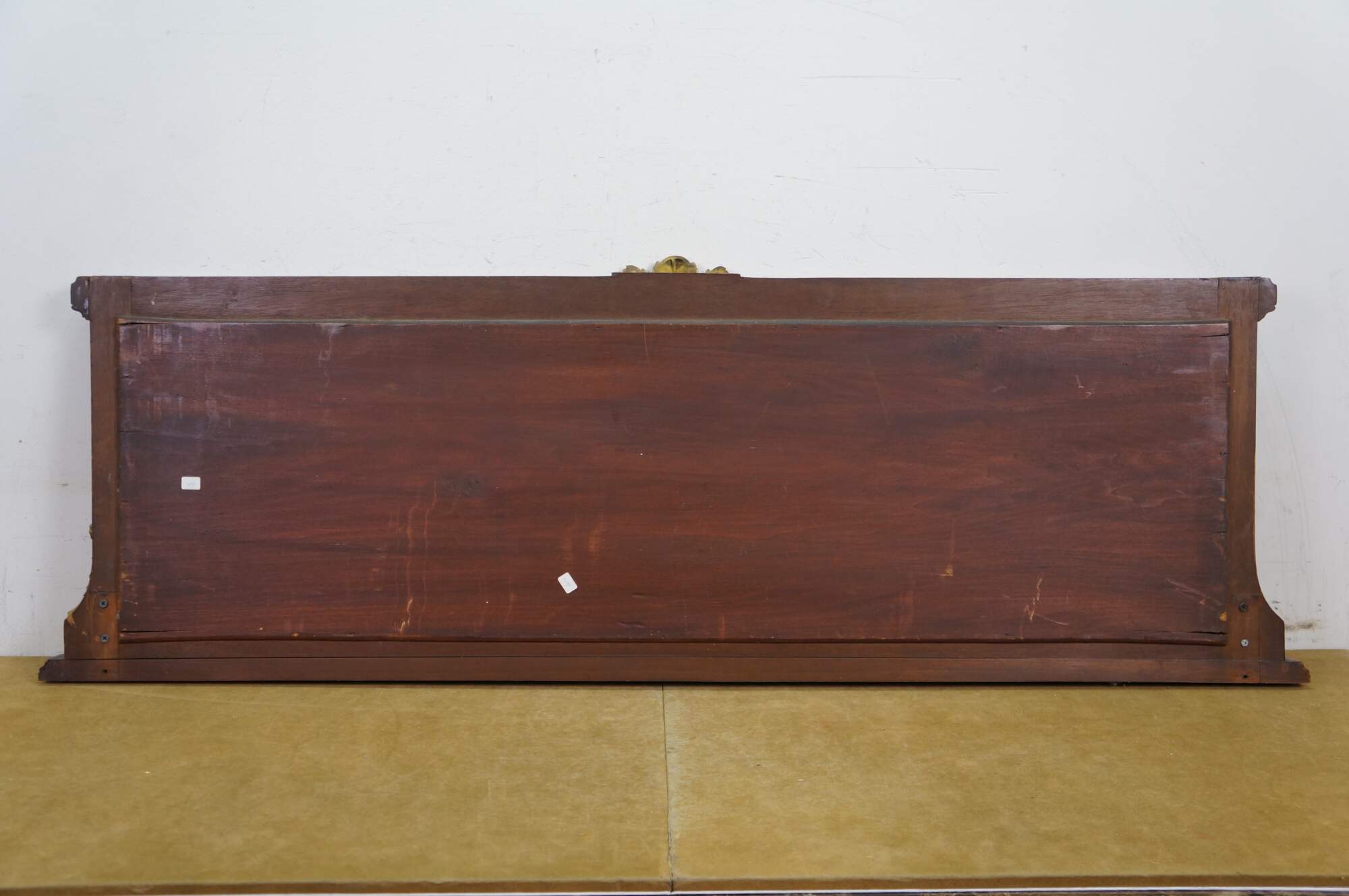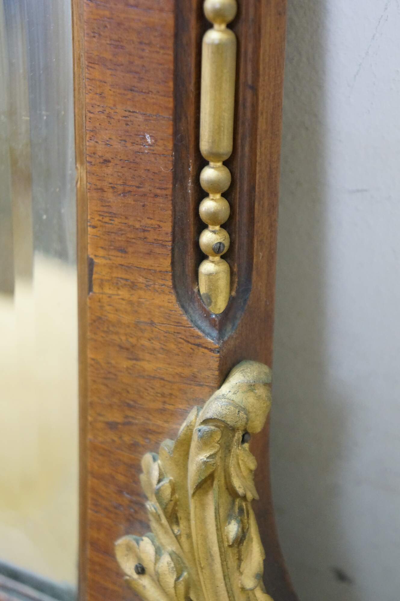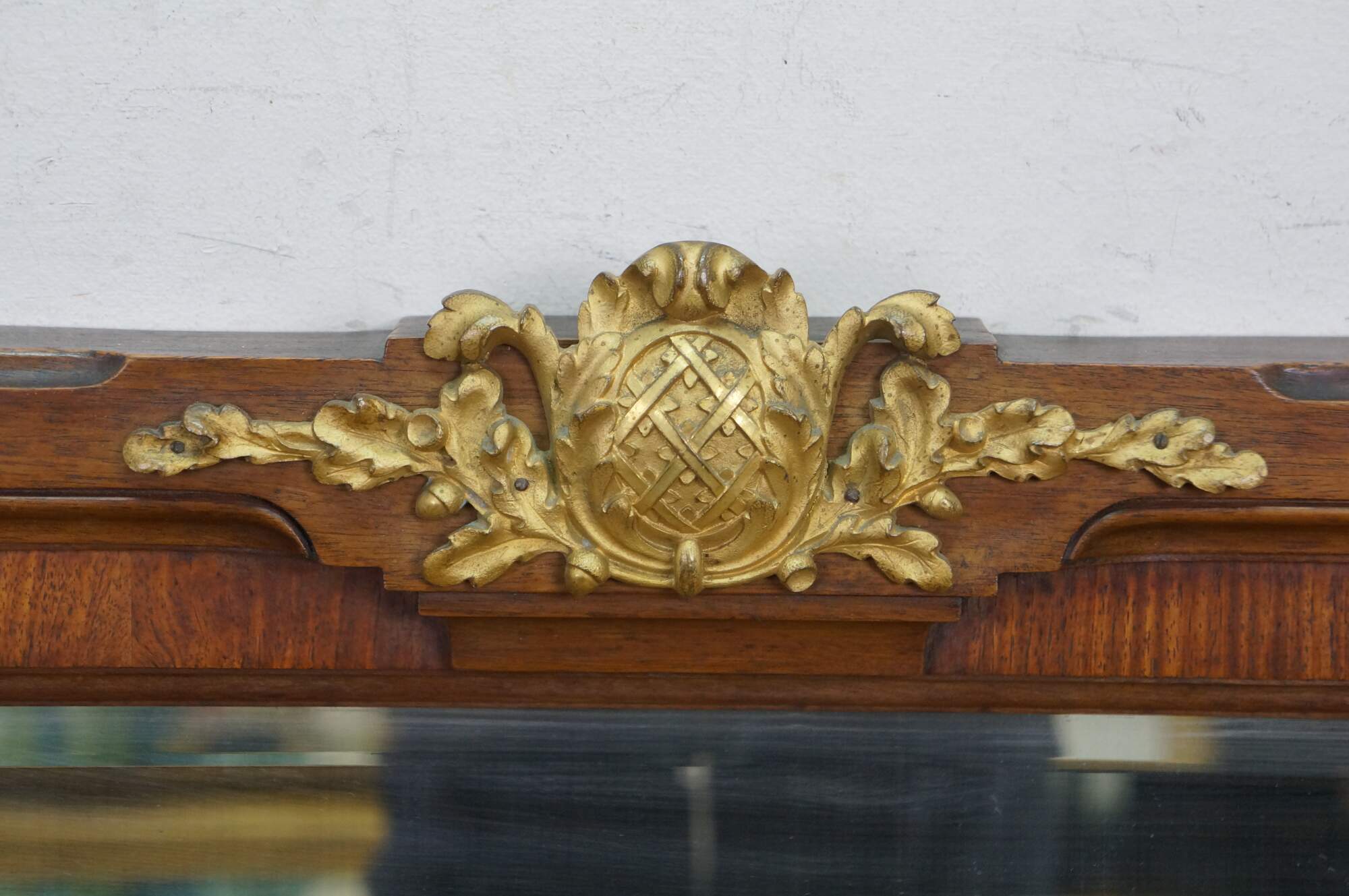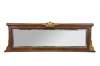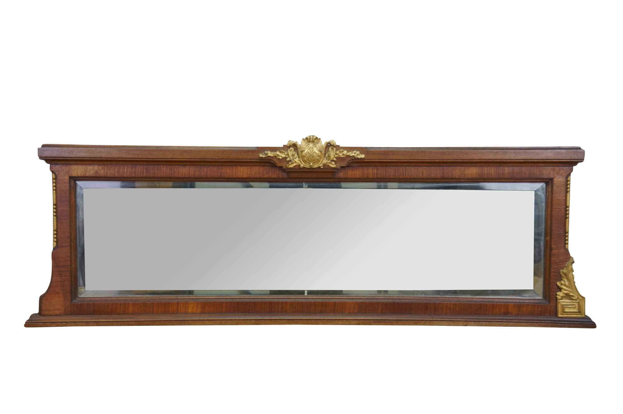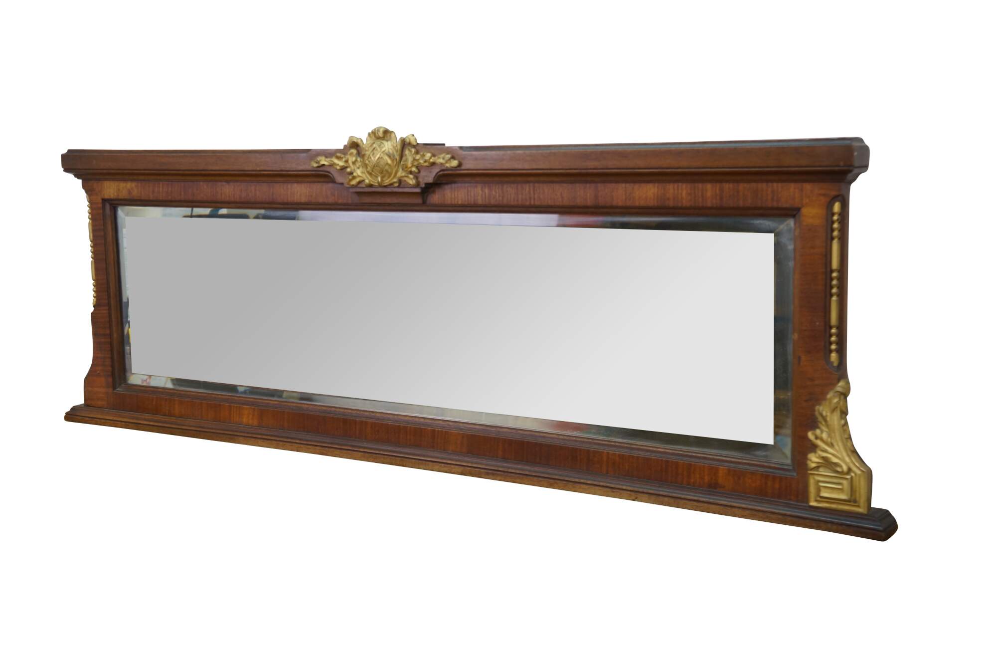 Antique Victorian Empire style mahogany mantel mirror with gold gilded decorative mounts, ornate central crest, acanthus accents, and beveled mirror.