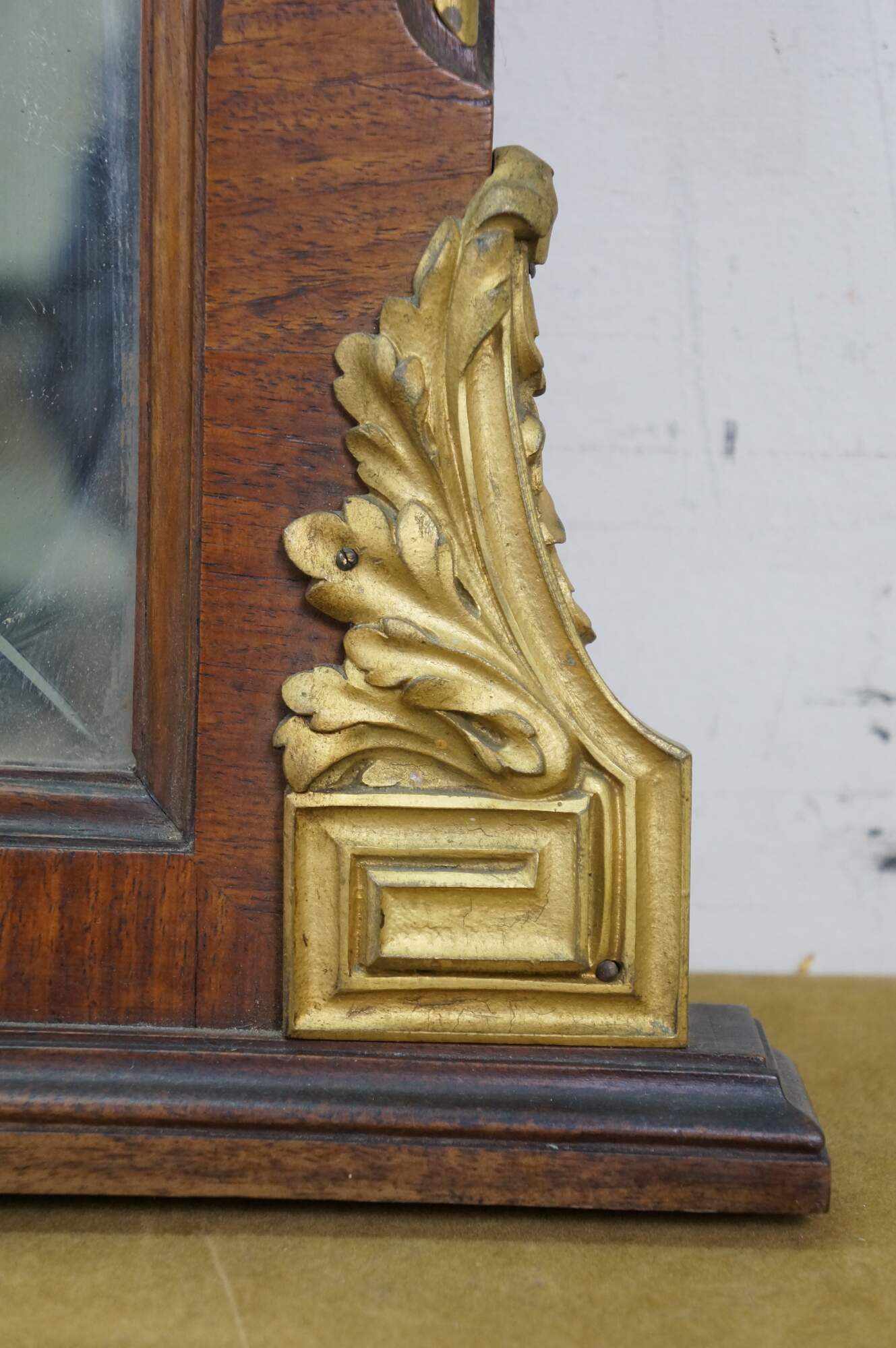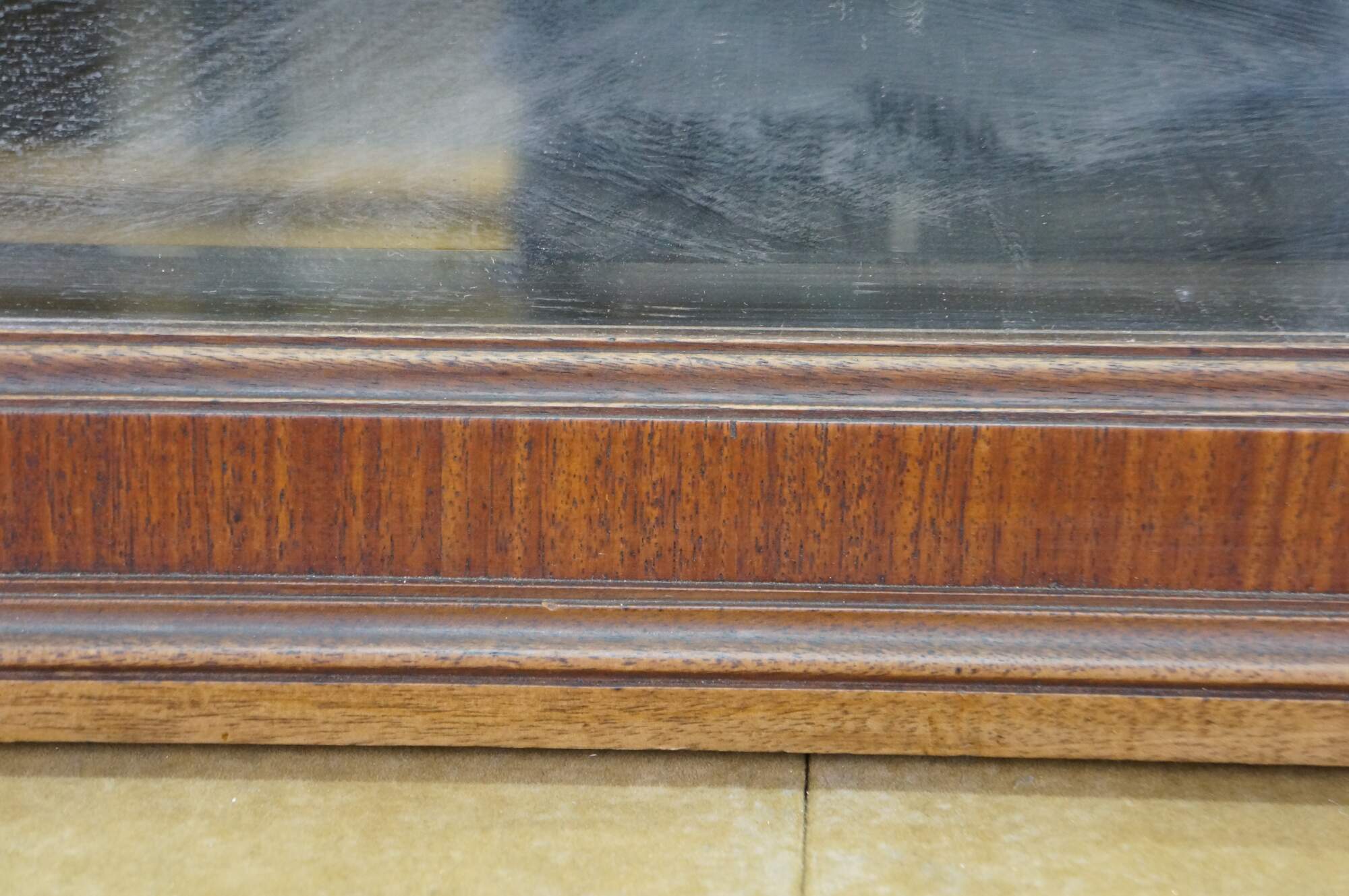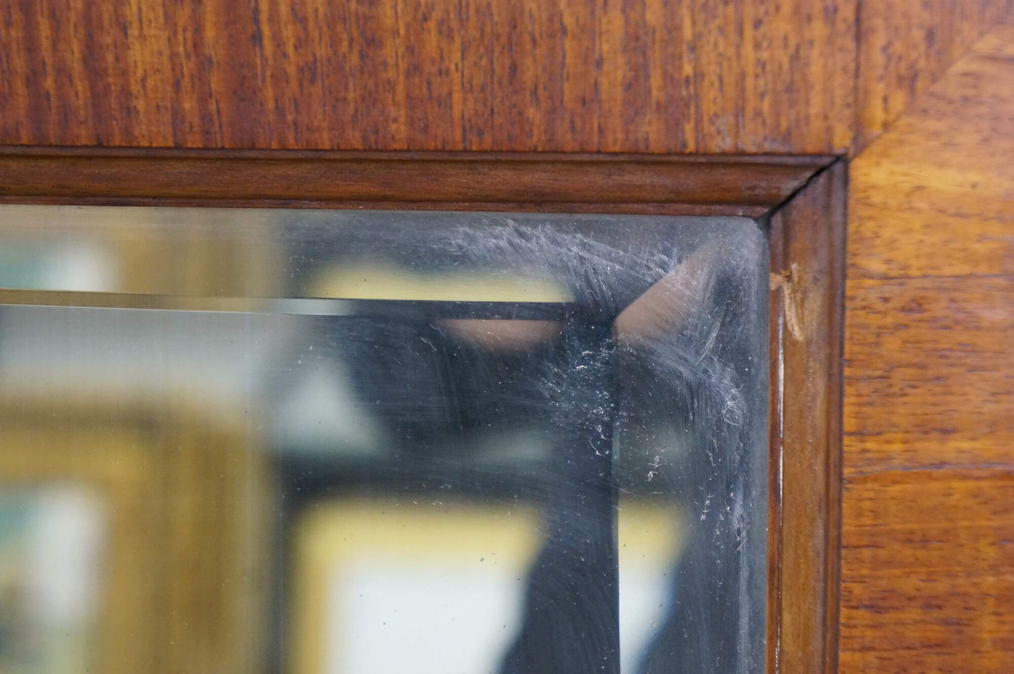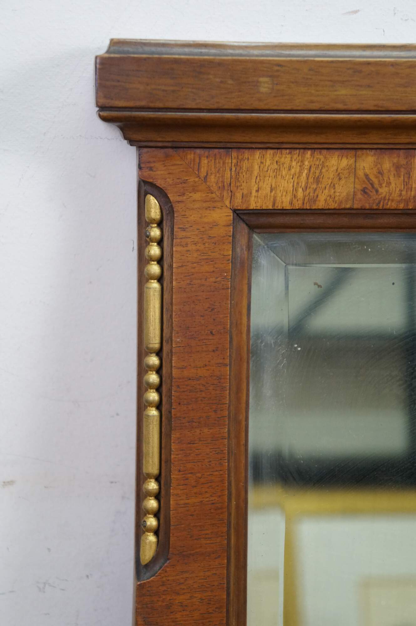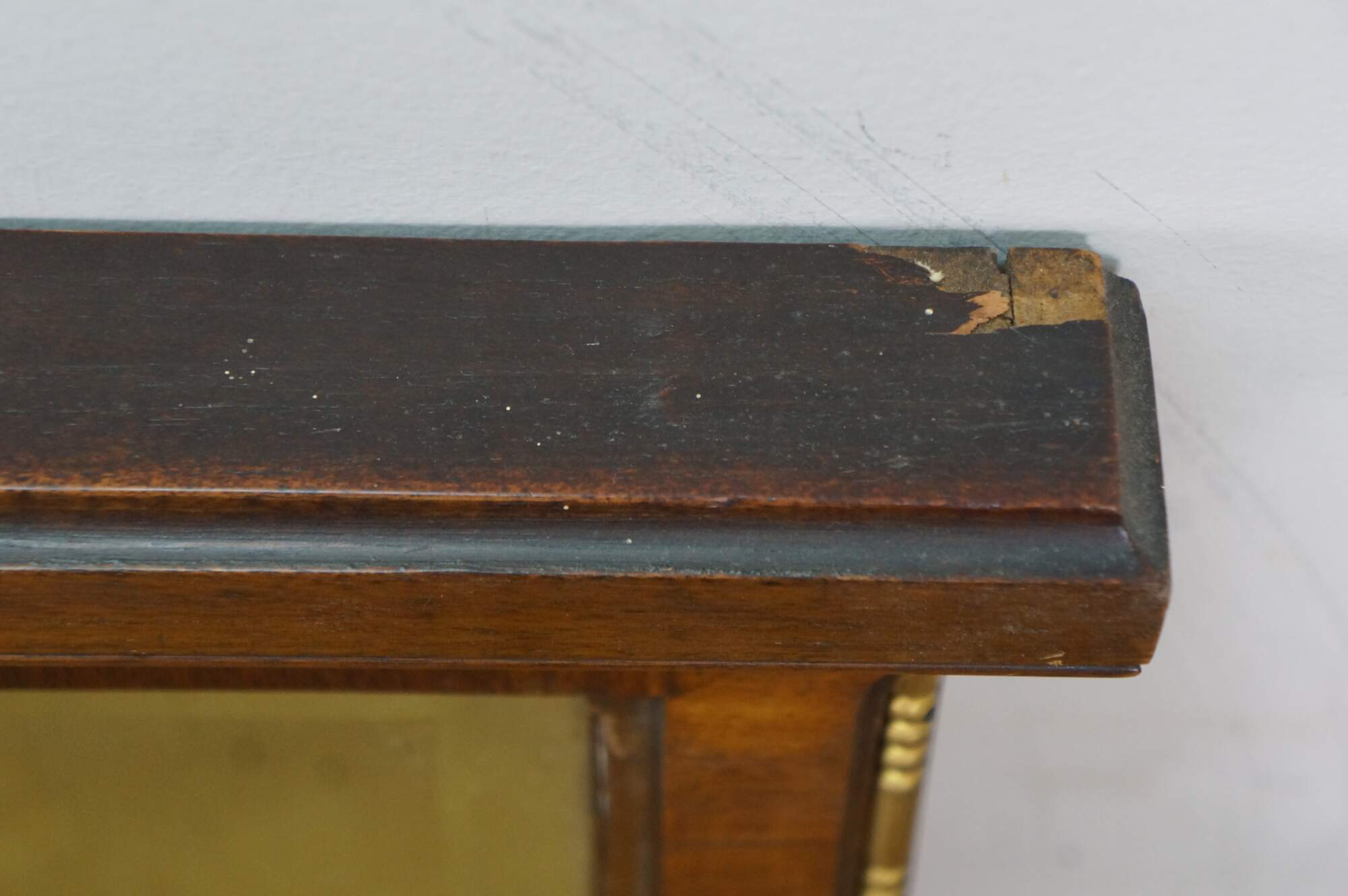 Missing brass corner piece on one side; some chipped veneer top edge; streaking to mirror from age.