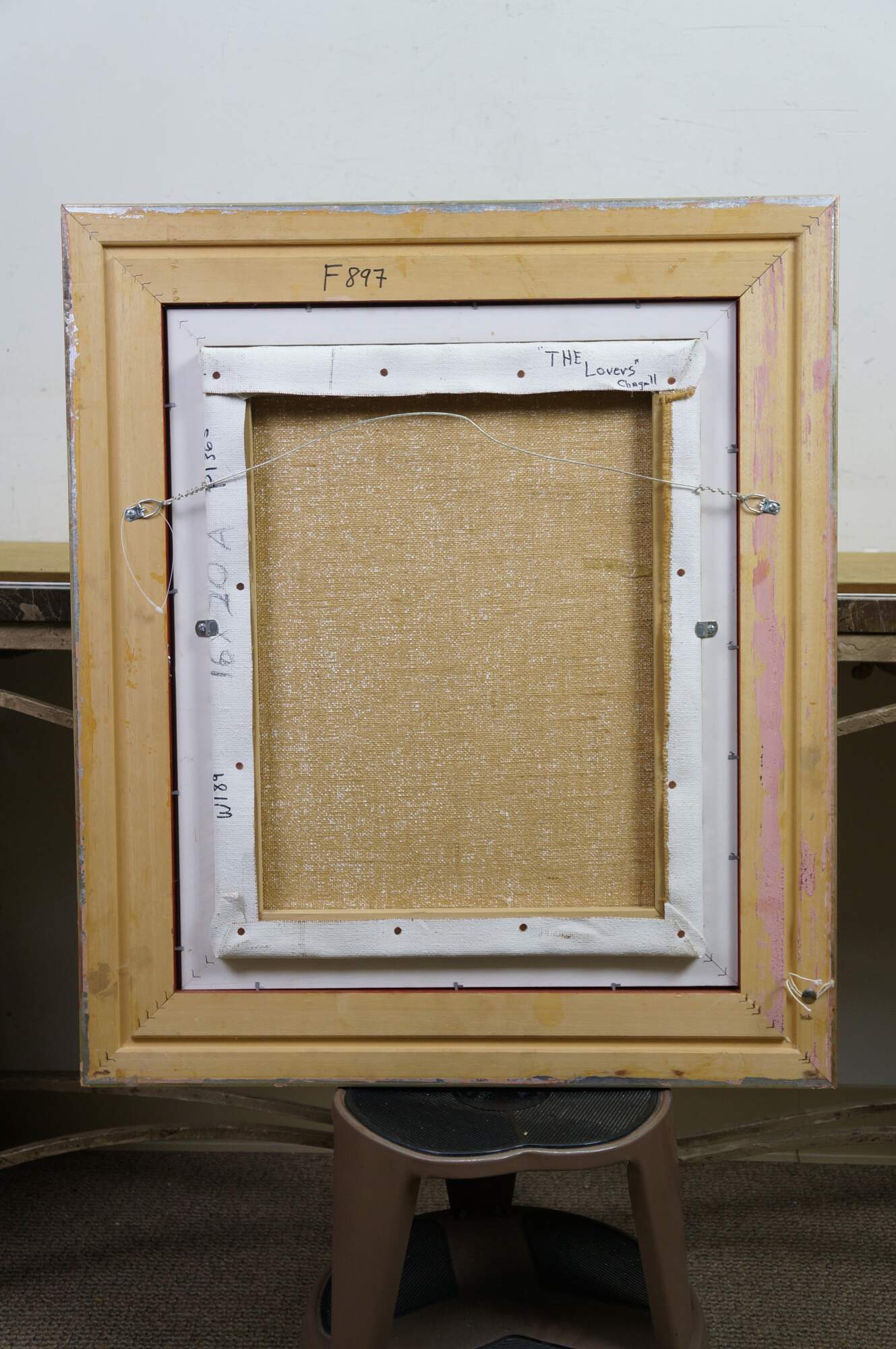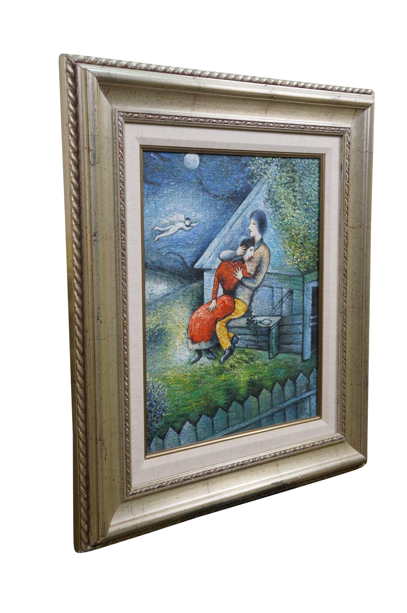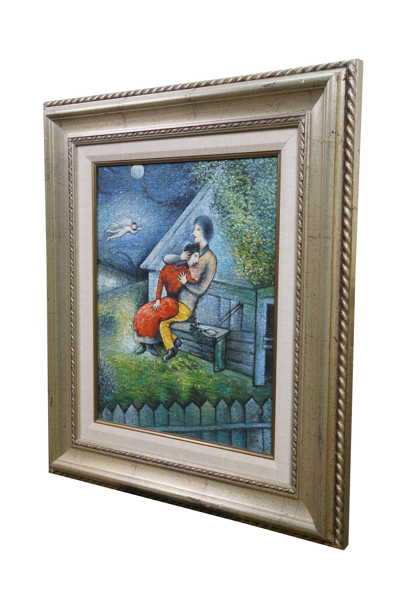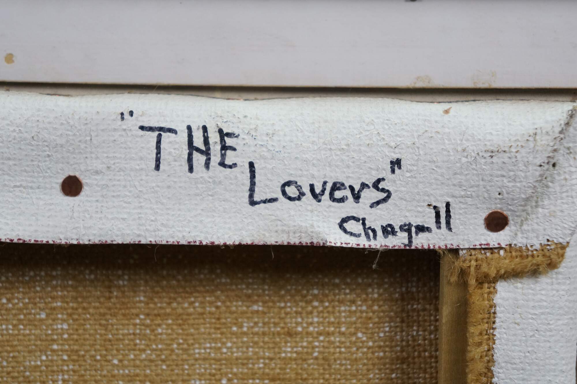 Vintage oil painting on burlap canvas titled The Lovers after Marc Chagall.�