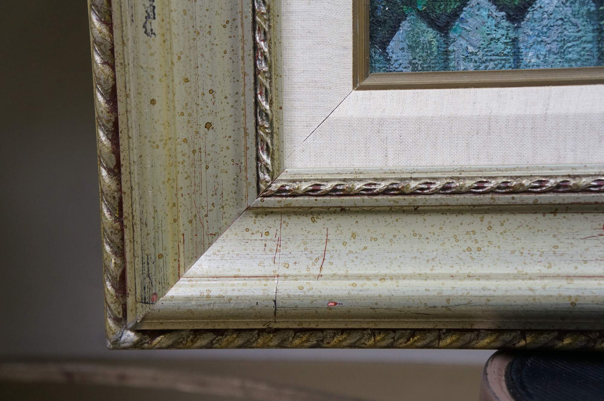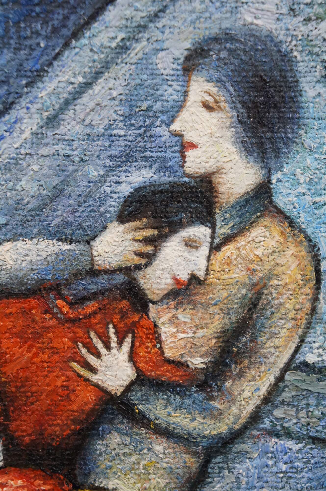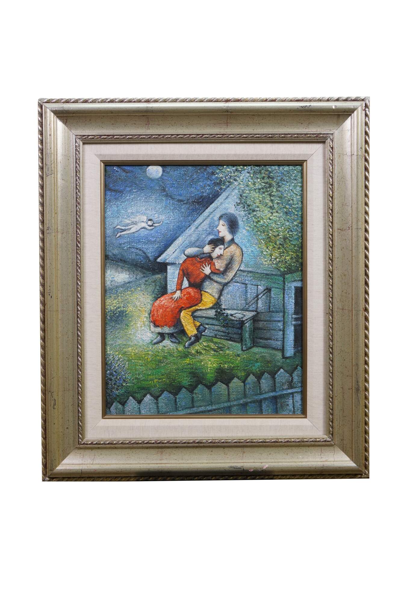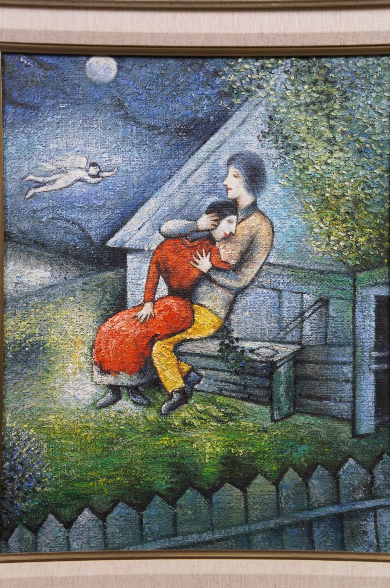 Vintage oil painting on burlap canvas titled The Lovers after Marc Chagall.�