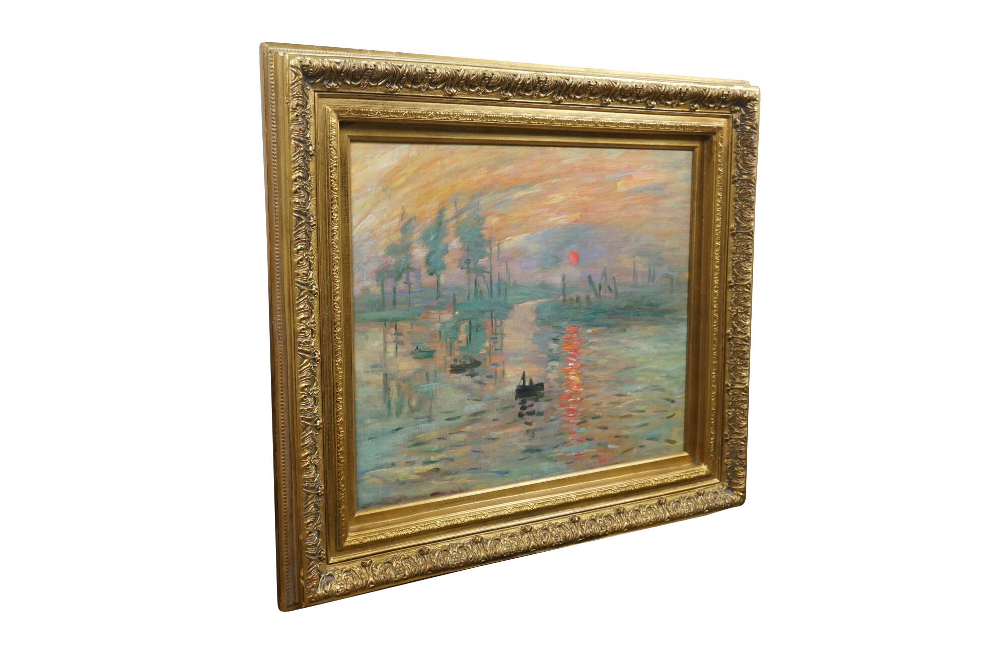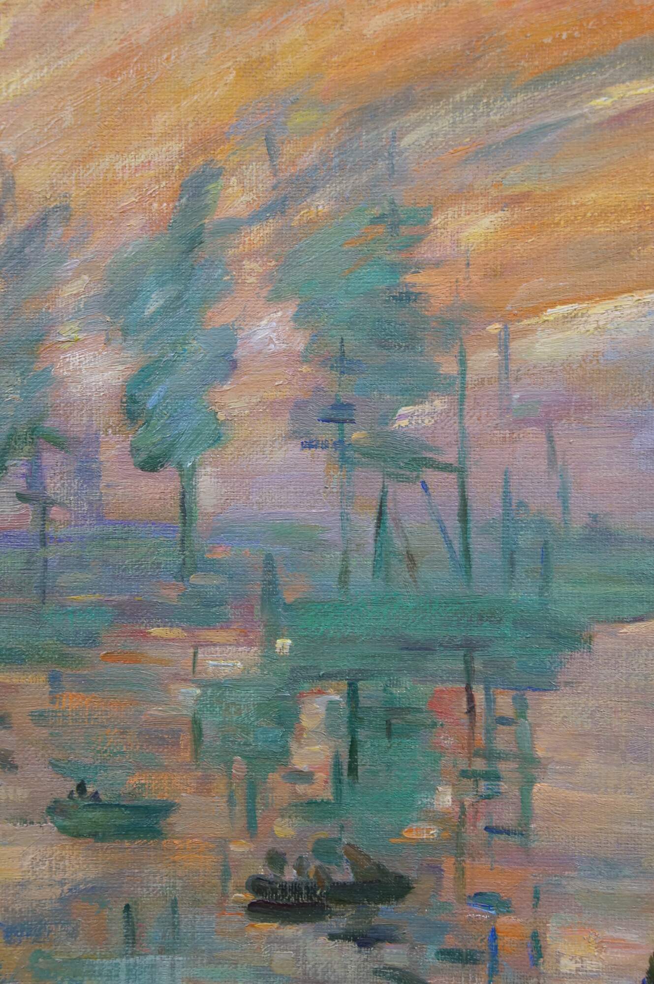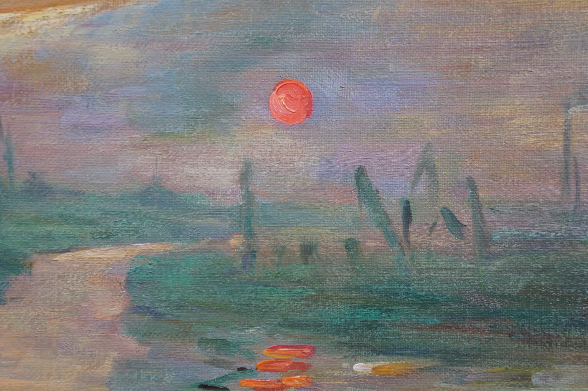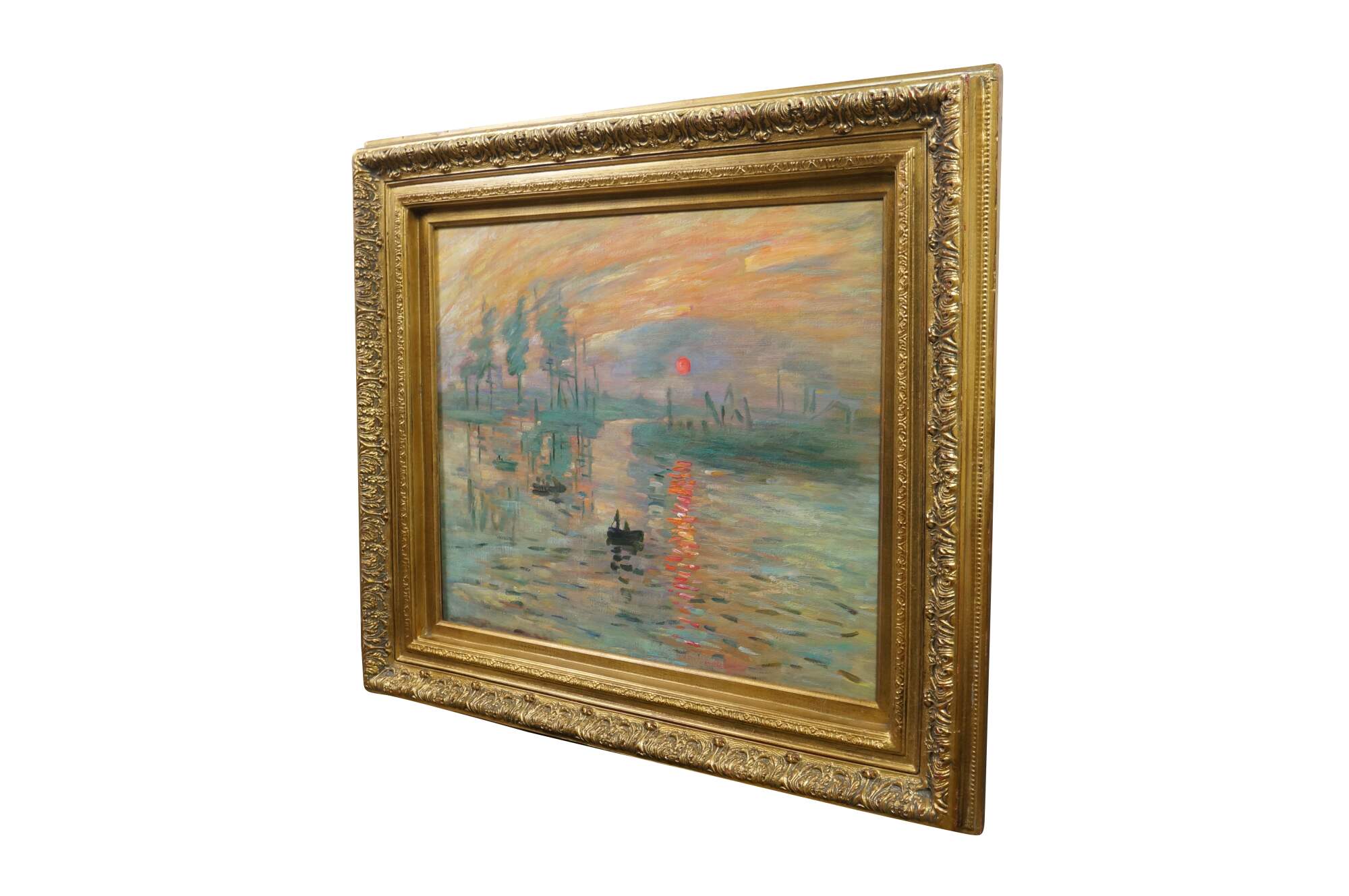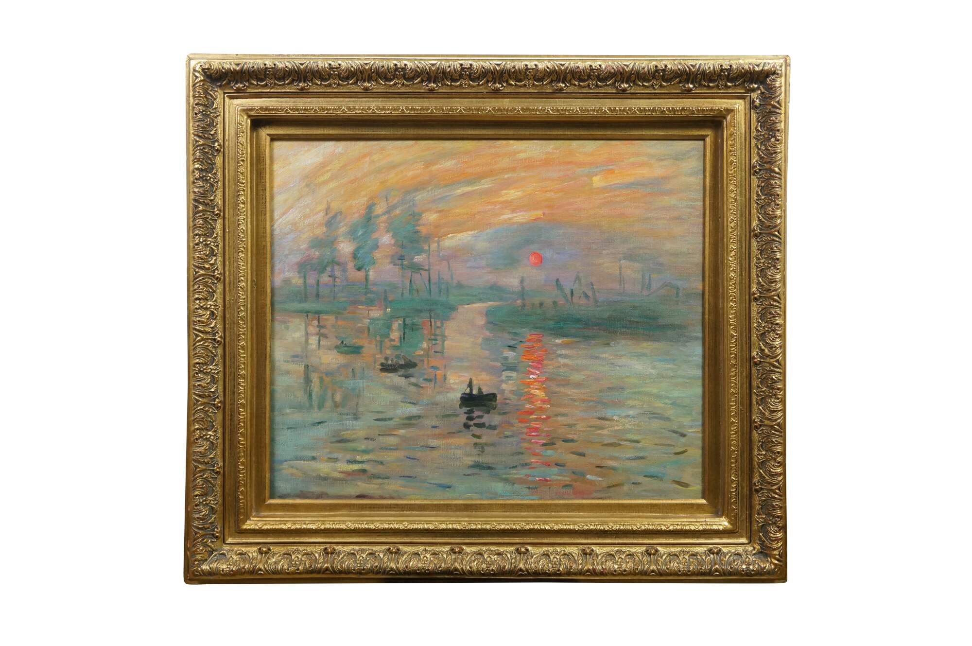 Vintage oil painting on burlap after Claude Monet's 1872 painting, Impression, Sunrise (Impression, soleil levant).� This painting is widely regarded as the masterpiece that gave the Impressionist movement its name. It depicts the port of Le Havre, France, at dawn, capturing the effects of light and fog on the water.� Monet used loose, quick brushstrokes to capture a fleeting sensation rather than detailed realism.� The artwork was first exhibited in Paris in 1874 and is currently housed in the Musée Marmottan Monet in Paris France. Neoclassical gold acanthus composite frame.