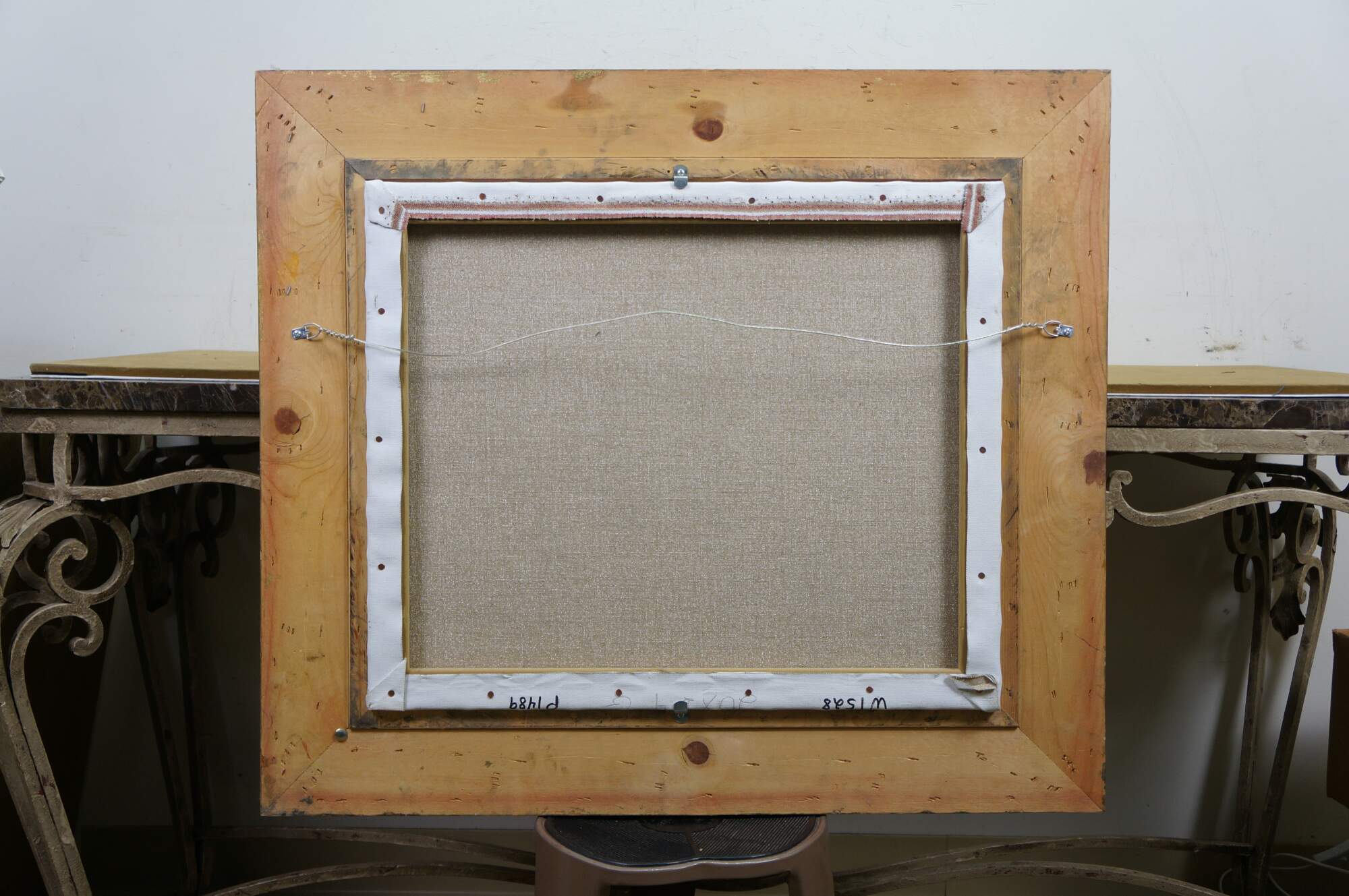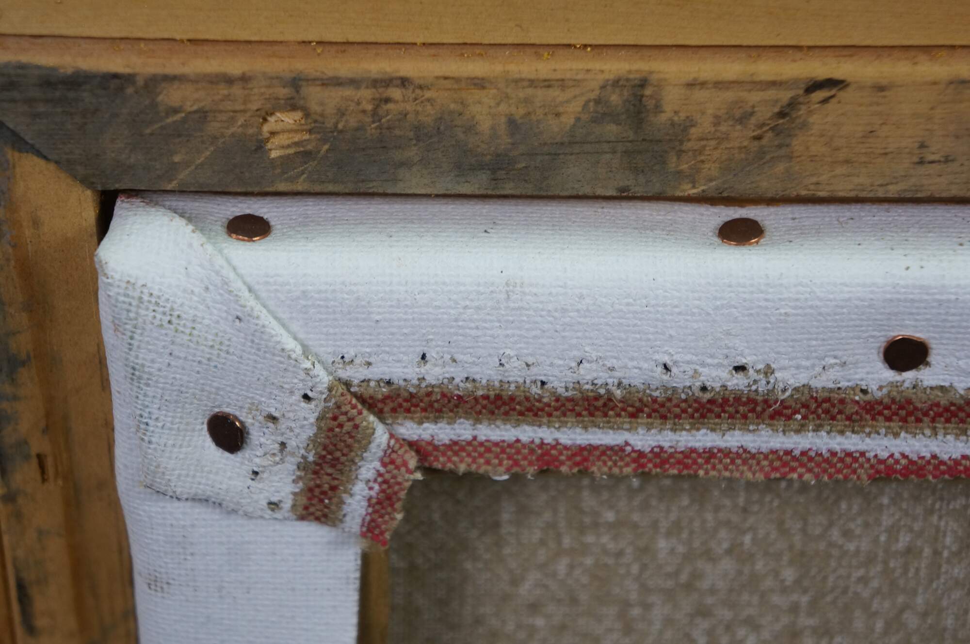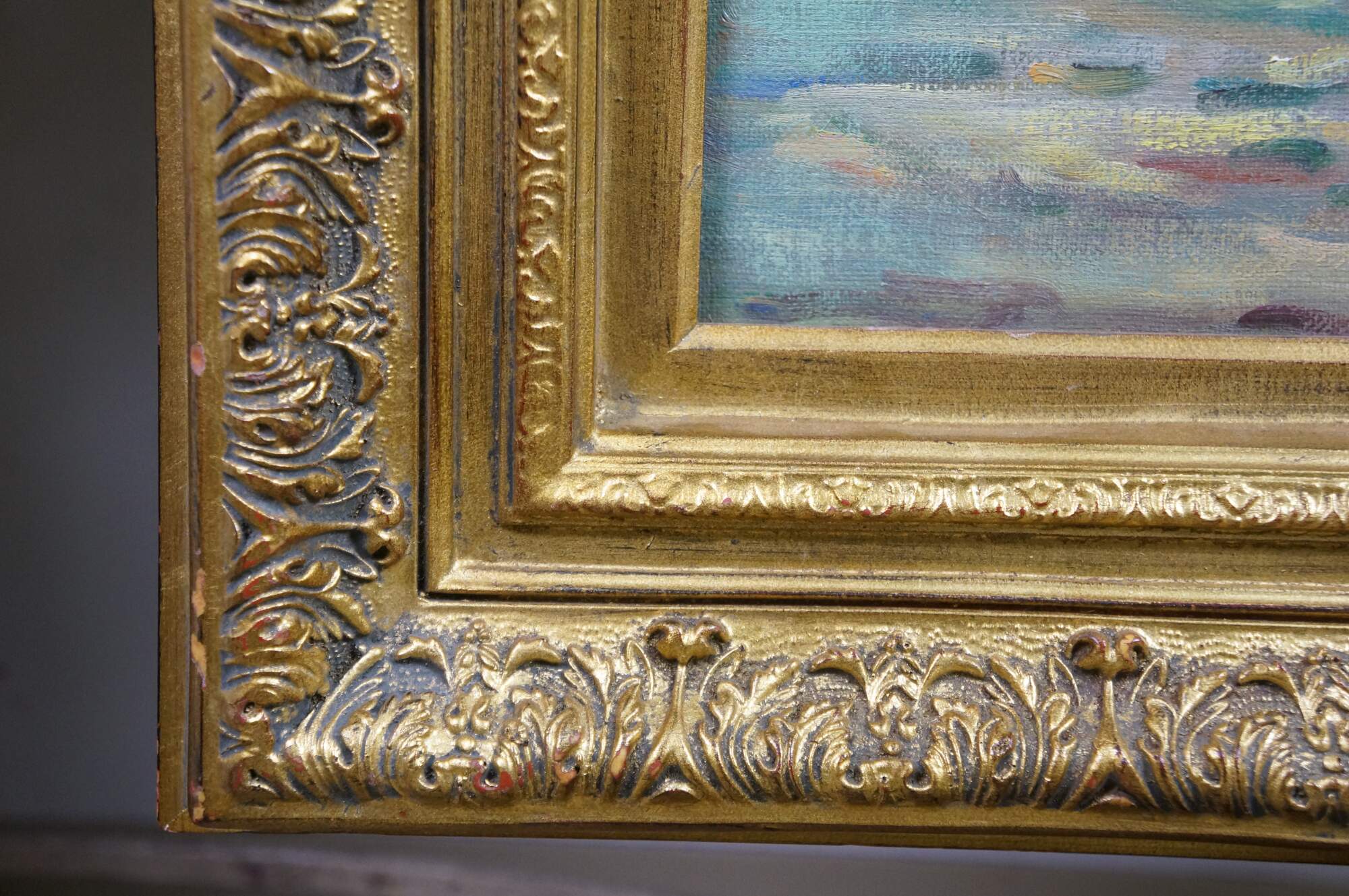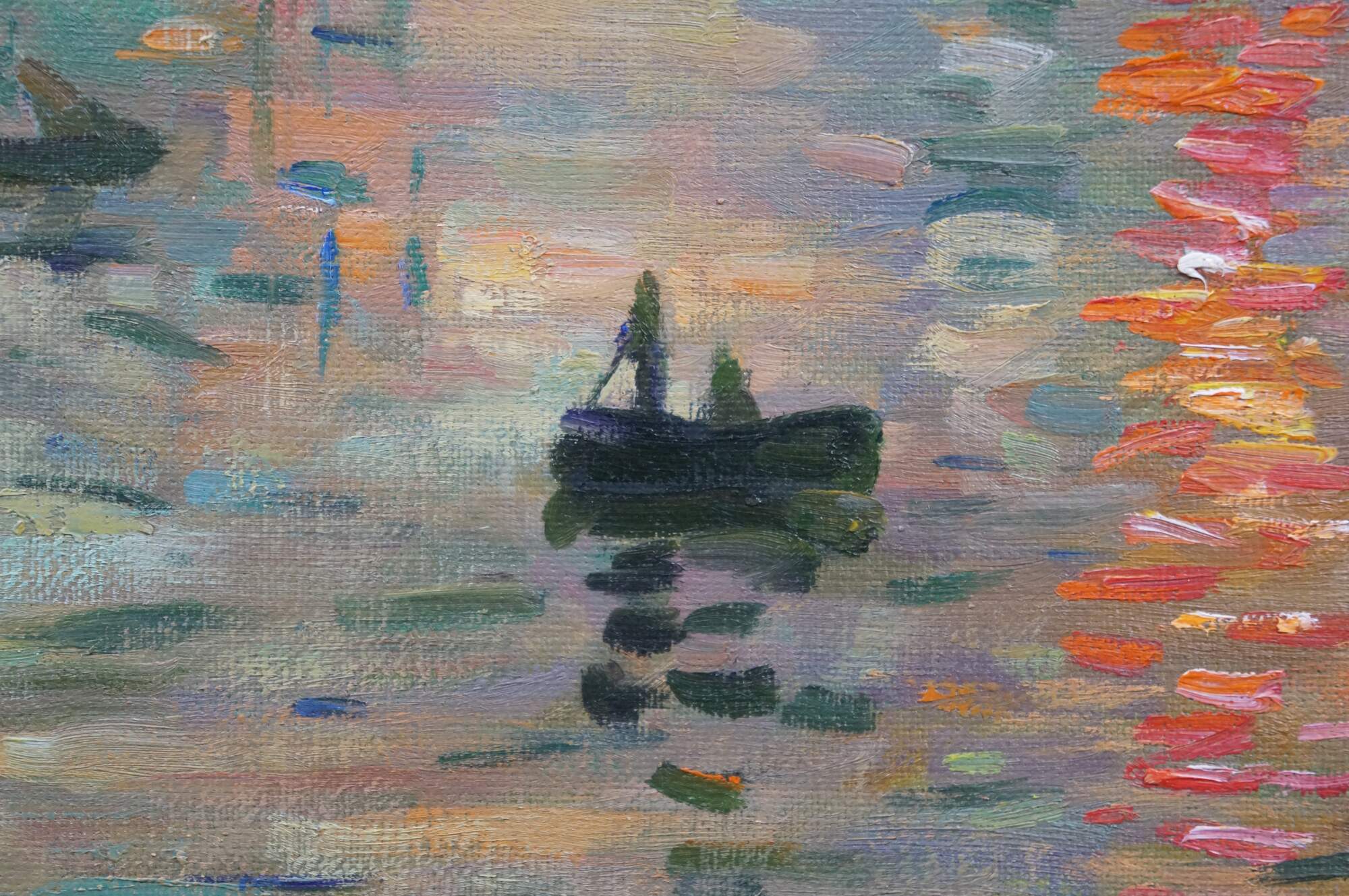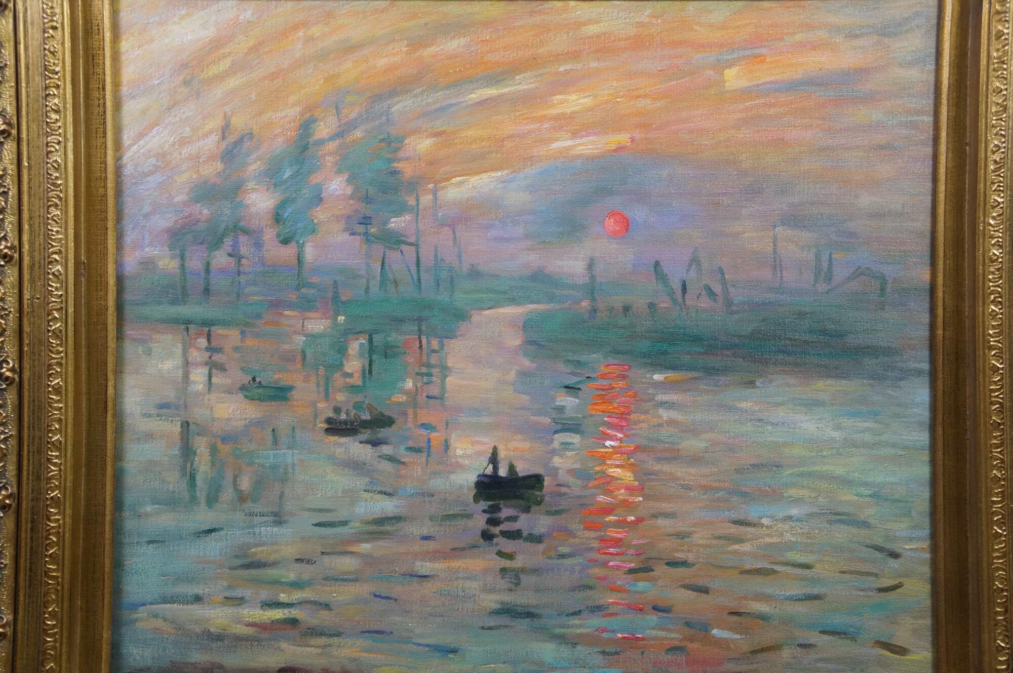 Vintage oil painting on burlap after Claude Monet's 1872 painting, Impression, Sunrise (Impression, soleil levant).� This painting is widely regarded as the masterpiece that gave the Impressionist movement its name. It depicts the port of Le Havre, France, at dawn, capturing the effects of light and fog on the water.� Monet used loose, quick brushstrokes to capture a fleeting sensation rather than detailed realism.� The artwork was first exhibited in Paris in 1874 and is currently housed in the Musée Marmottan Monet in Paris France. Neoclassical gold acanthus composite frame.