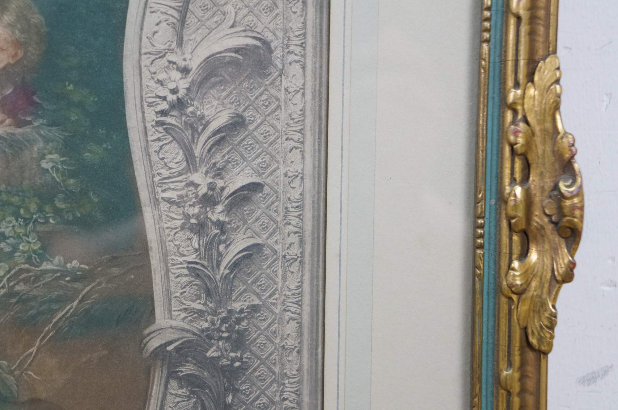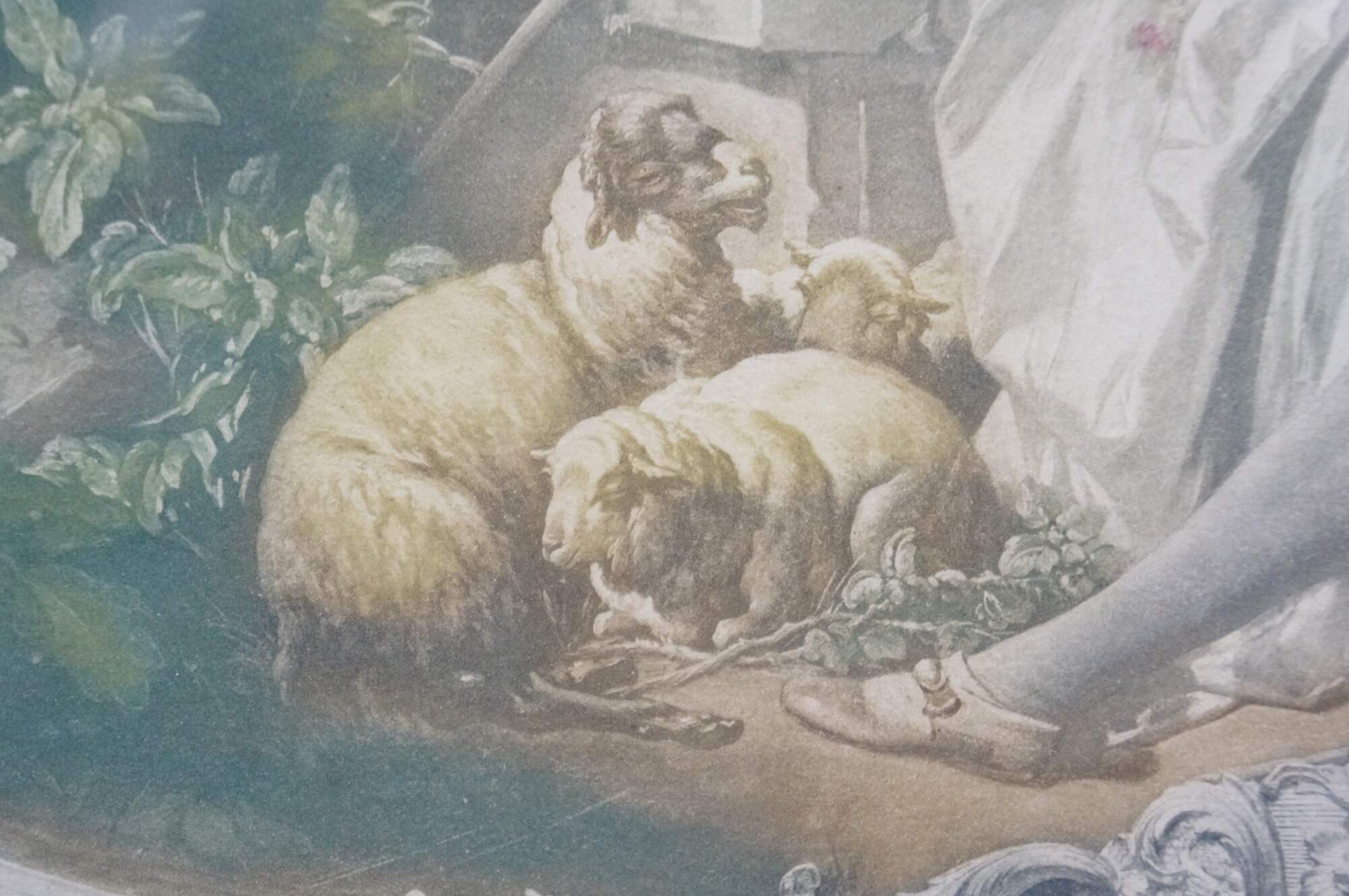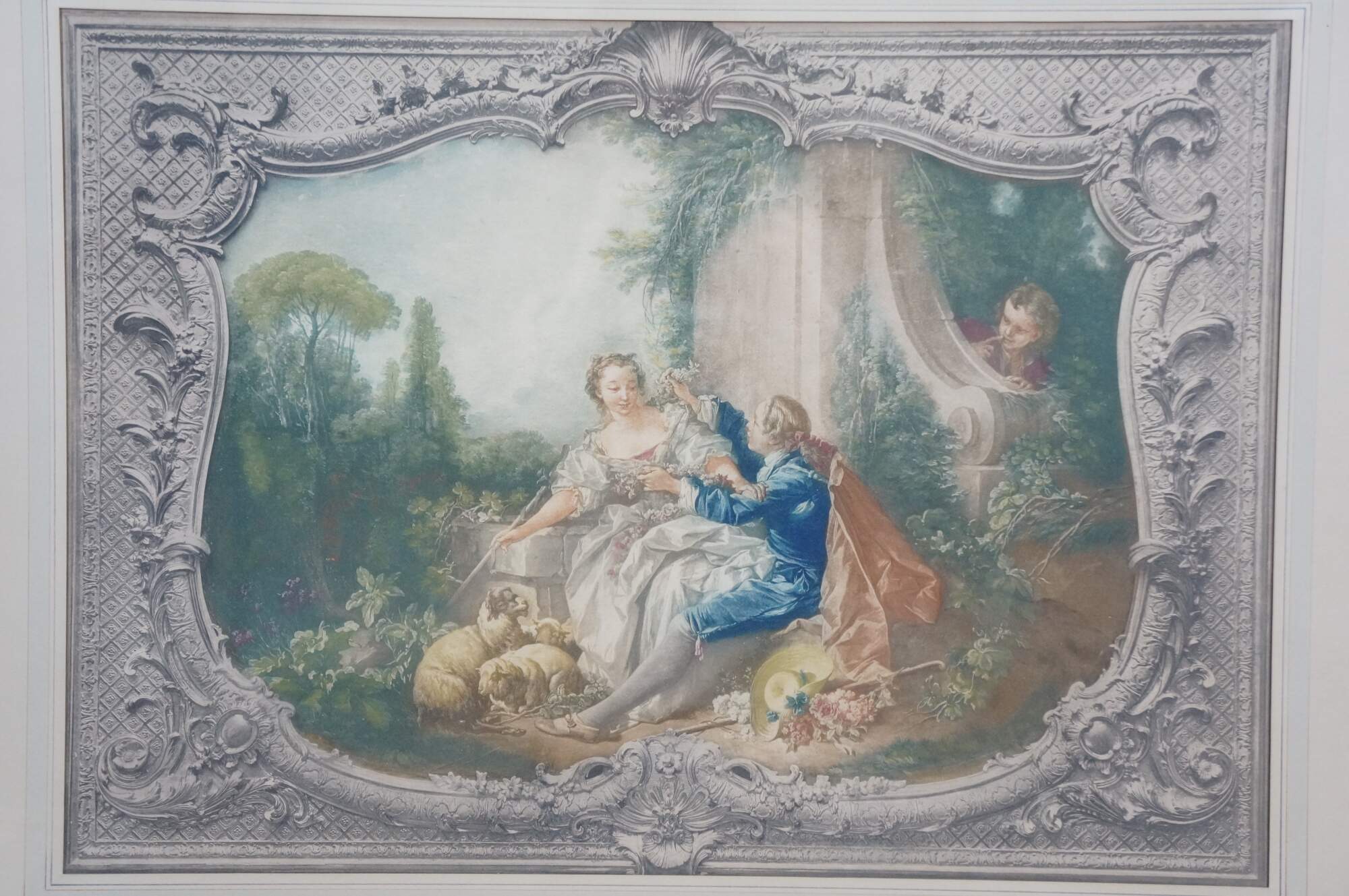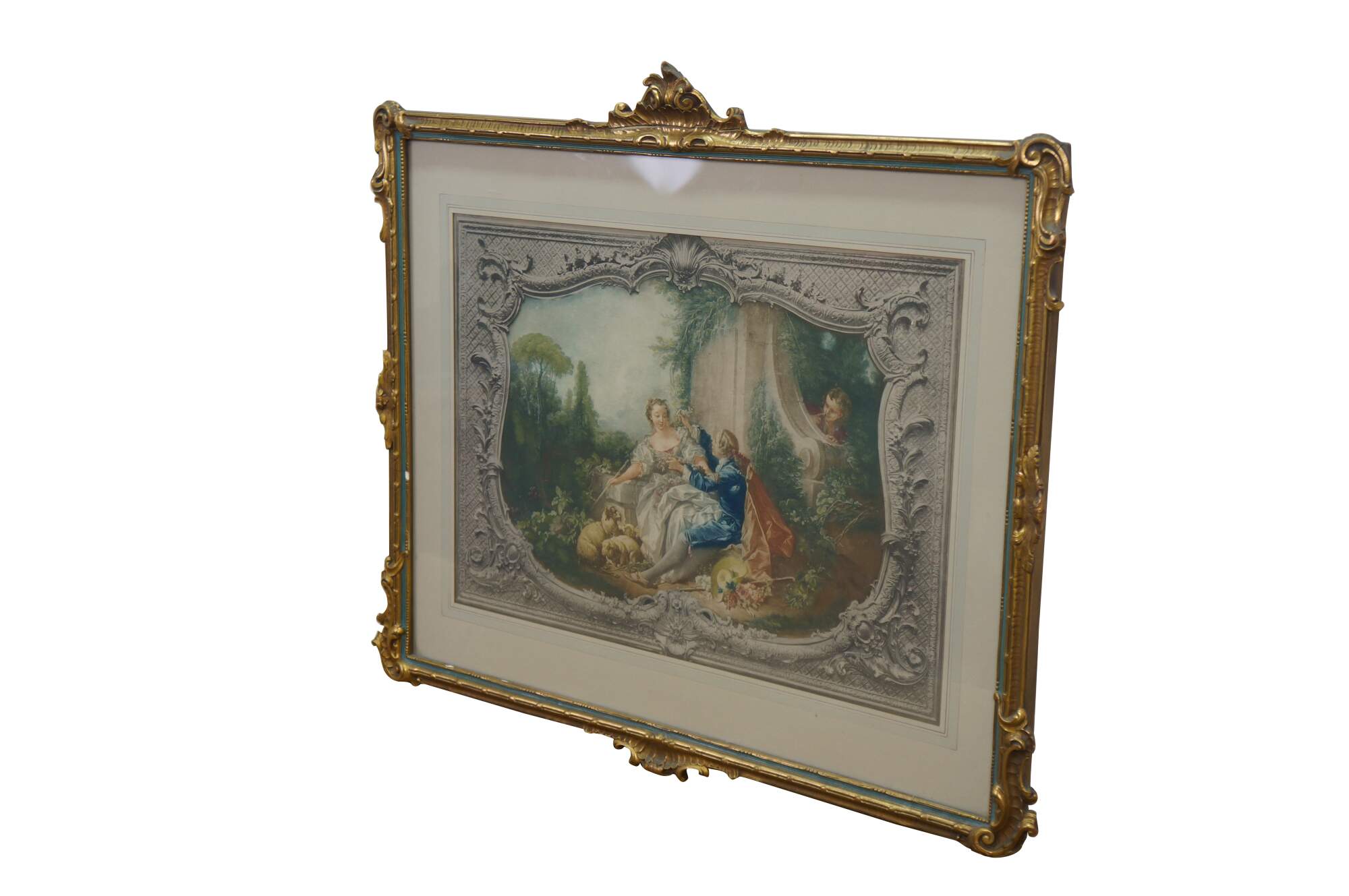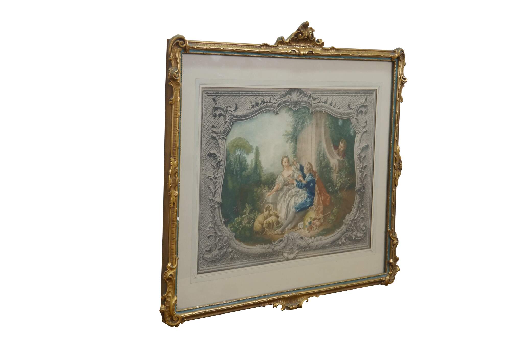 Baroque / Rococo lithograph print titled The Gallant Shepherd (French: Le Pasteur Galant) after François Boucher, originally painted around 1740–1745. Features a pastoral courting scene with a shepherd and shepherdess in a garden landscape with sheep and a mischievous spying boy.� Gold gesso wood frame.