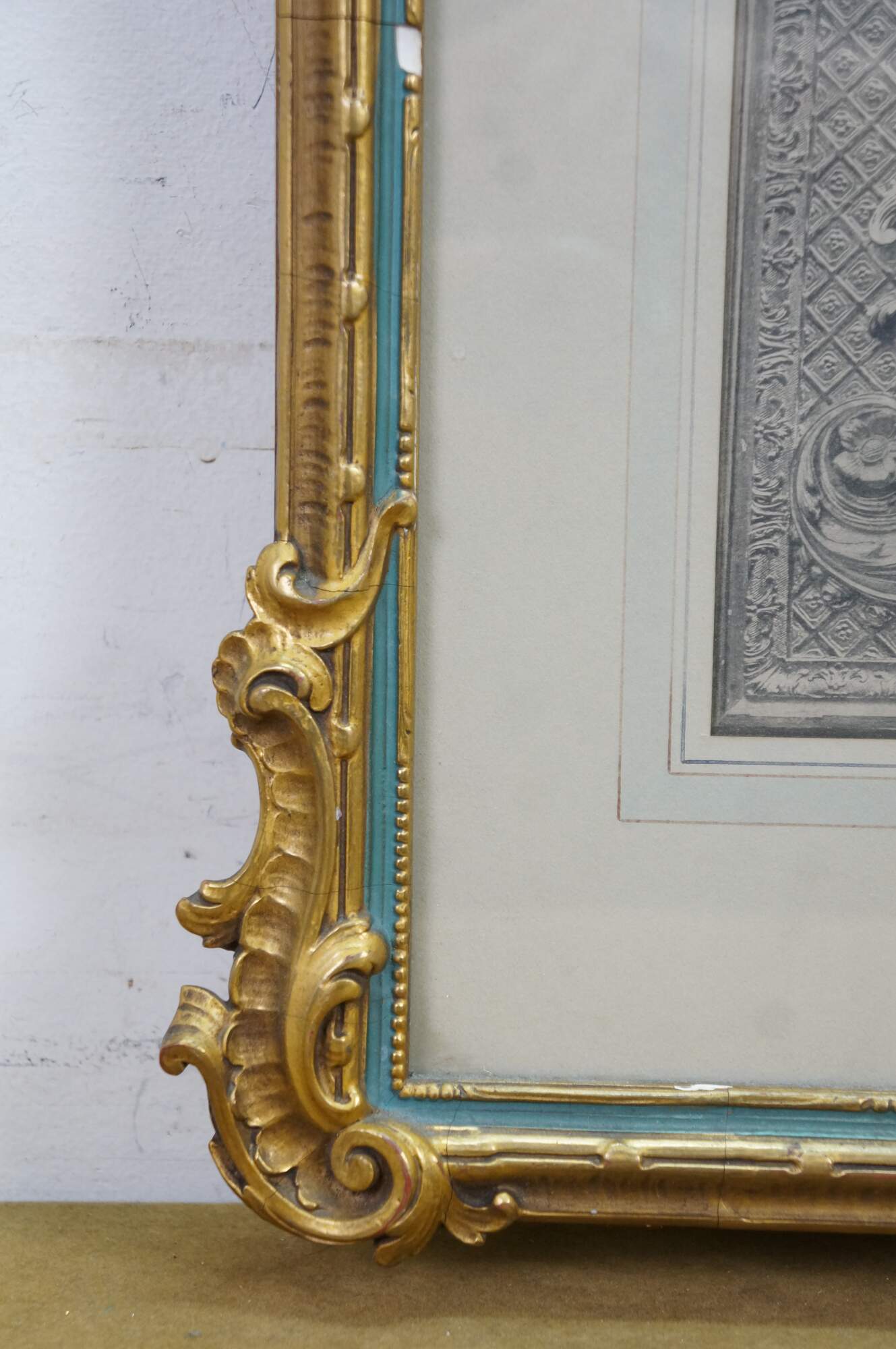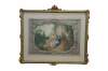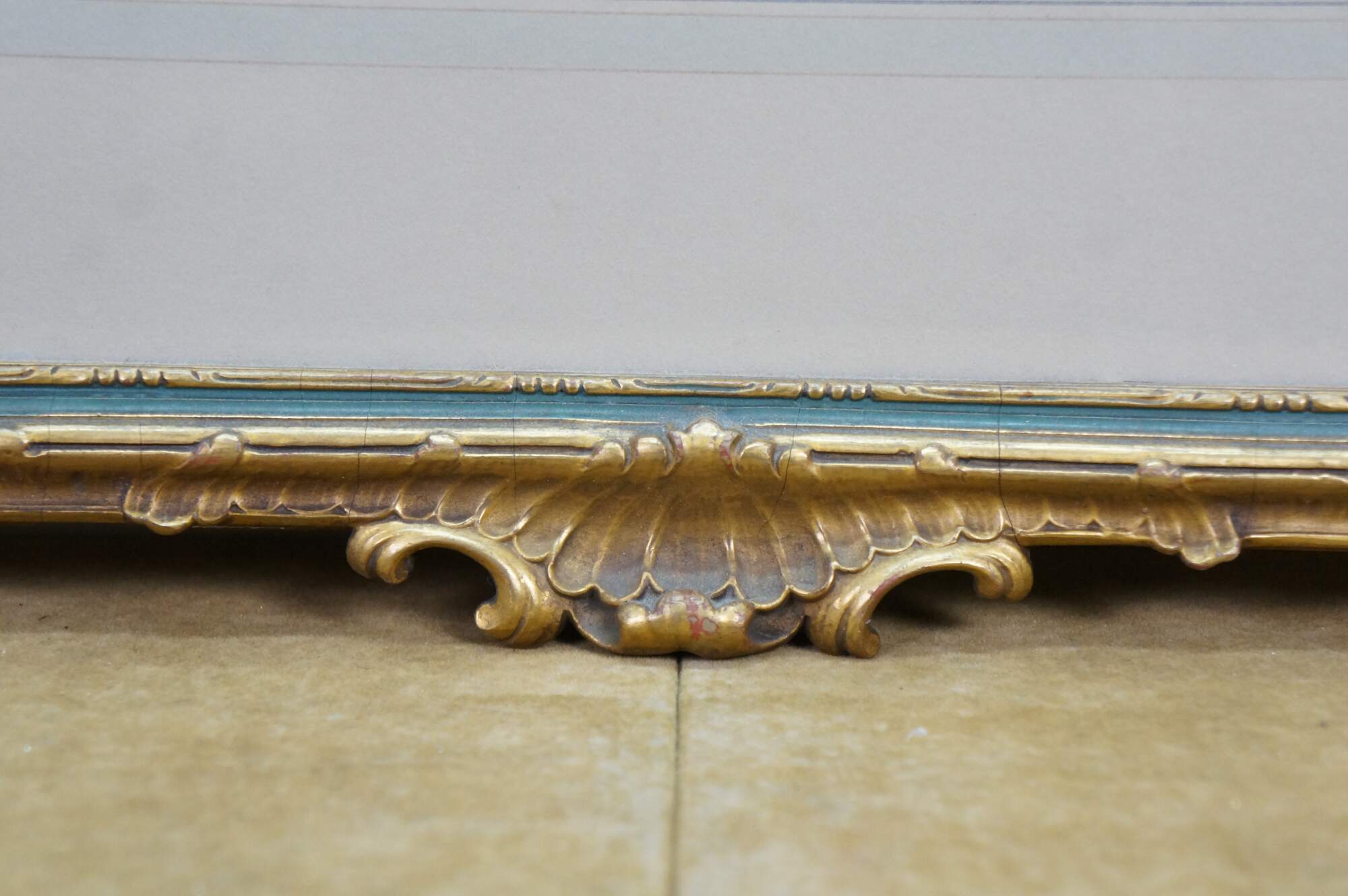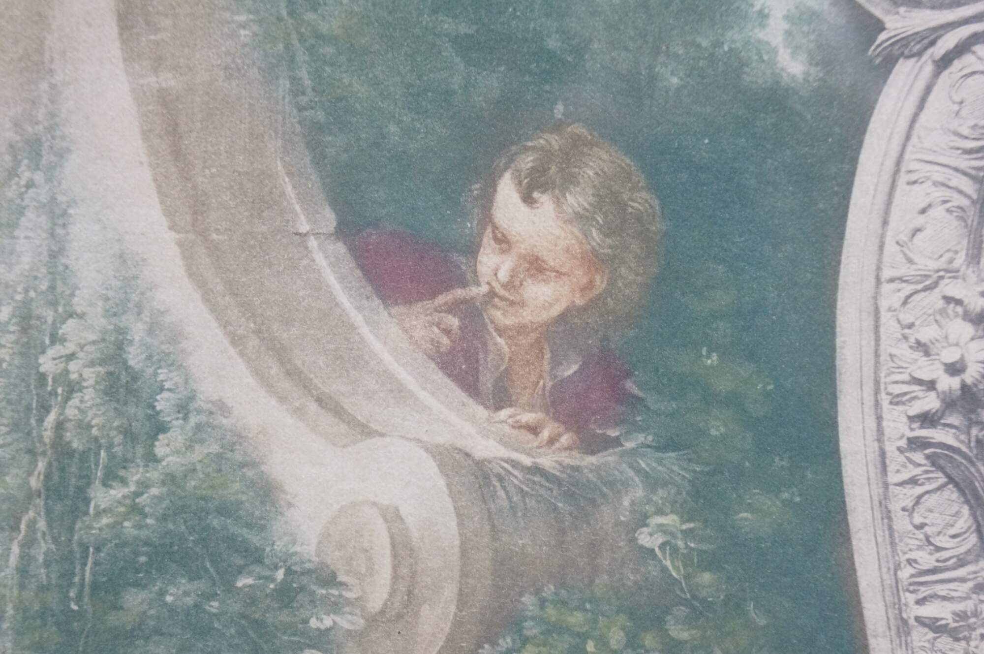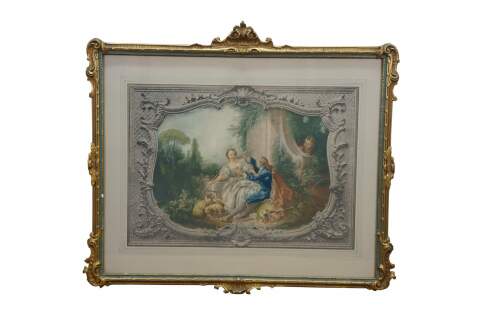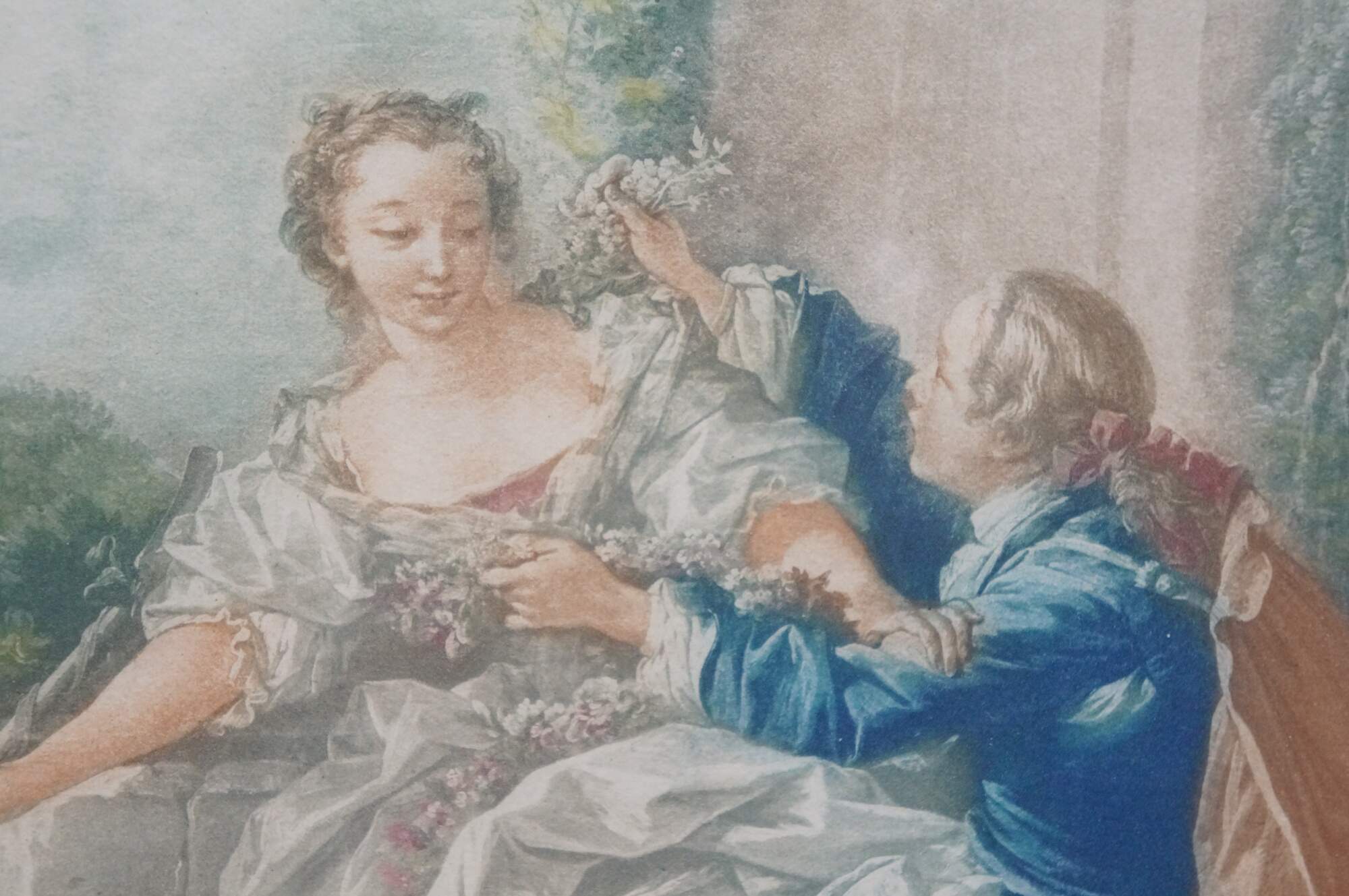 Baroque / Rococo lithograph print titled The Gallant Shepherd (French: Le Pasteur Galant) after François Boucher, originally painted around 1740–1745. Features a pastoral courting scene with a shepherd and shepherdess in a garden landscape with sheep and a mischievous spying boy.� Gold gesso wood frame.