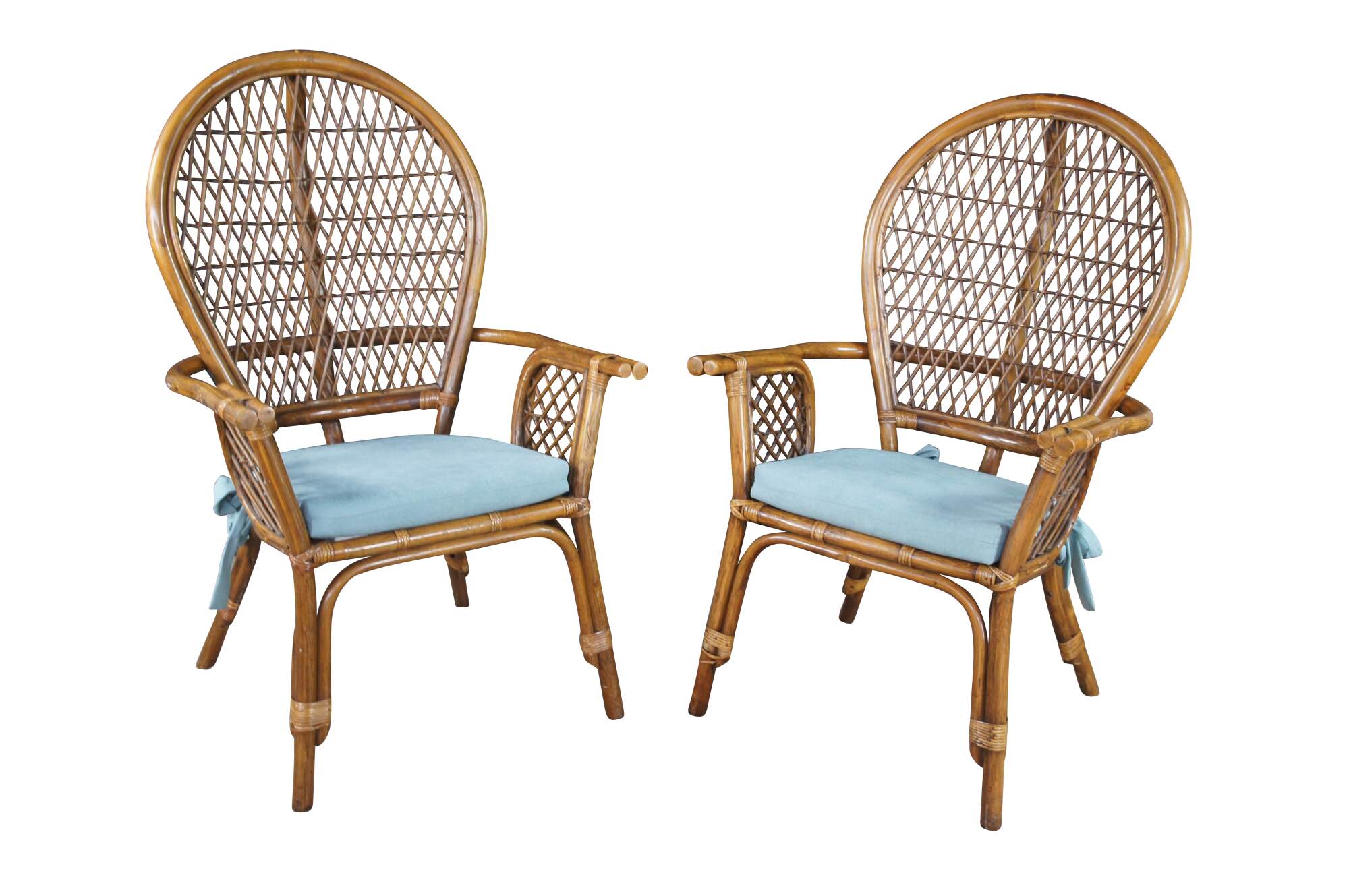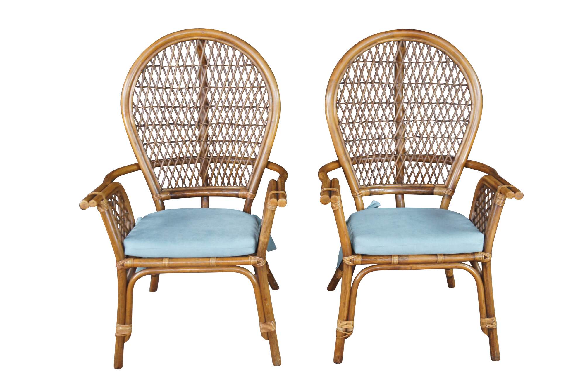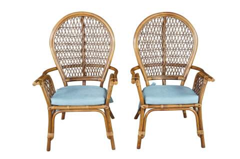 Pair of Mid Century Coastal Bohemian Armchairs. Features a bamboo frame with interlaced rattan balloon back and removable cushions.