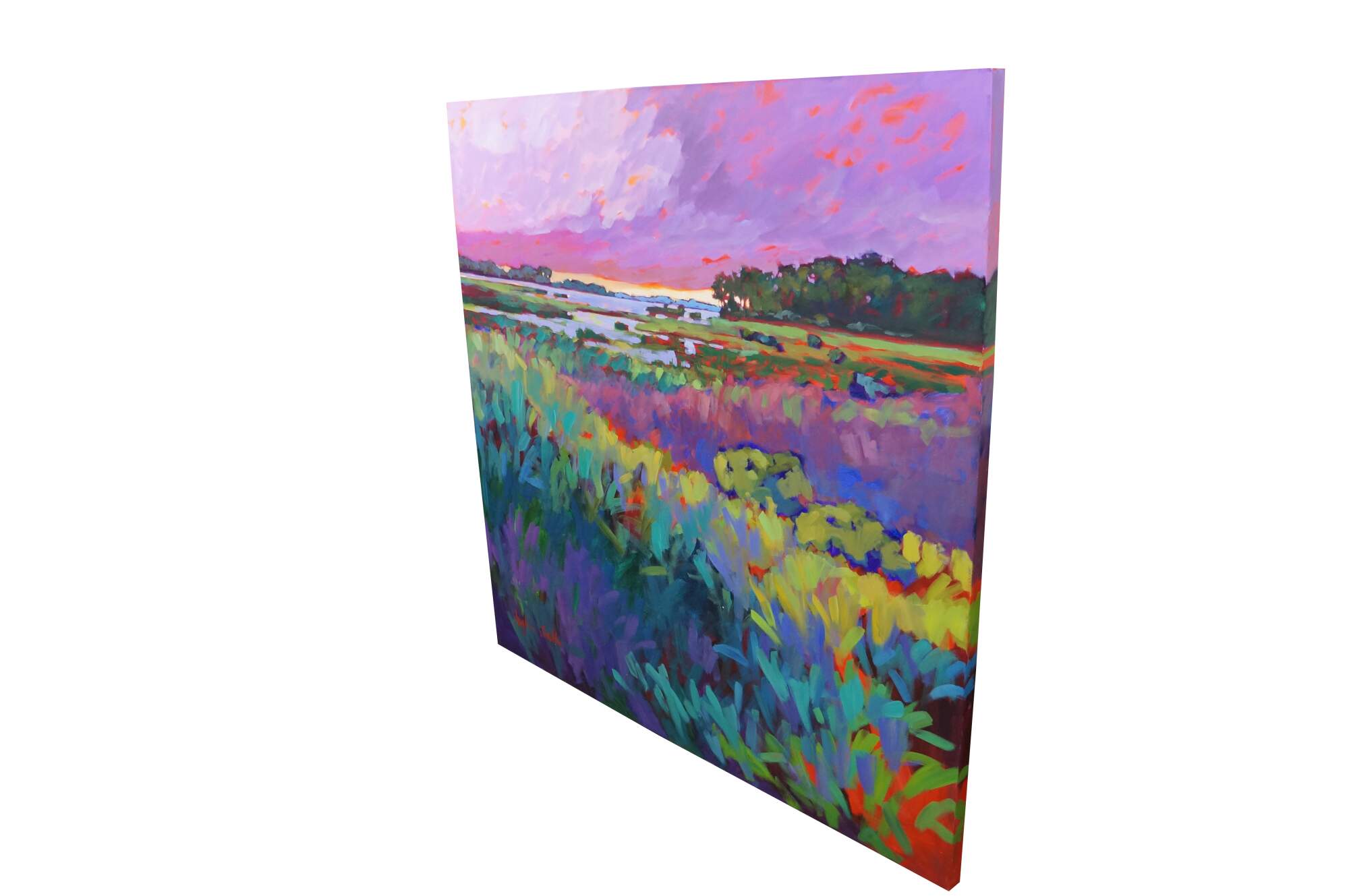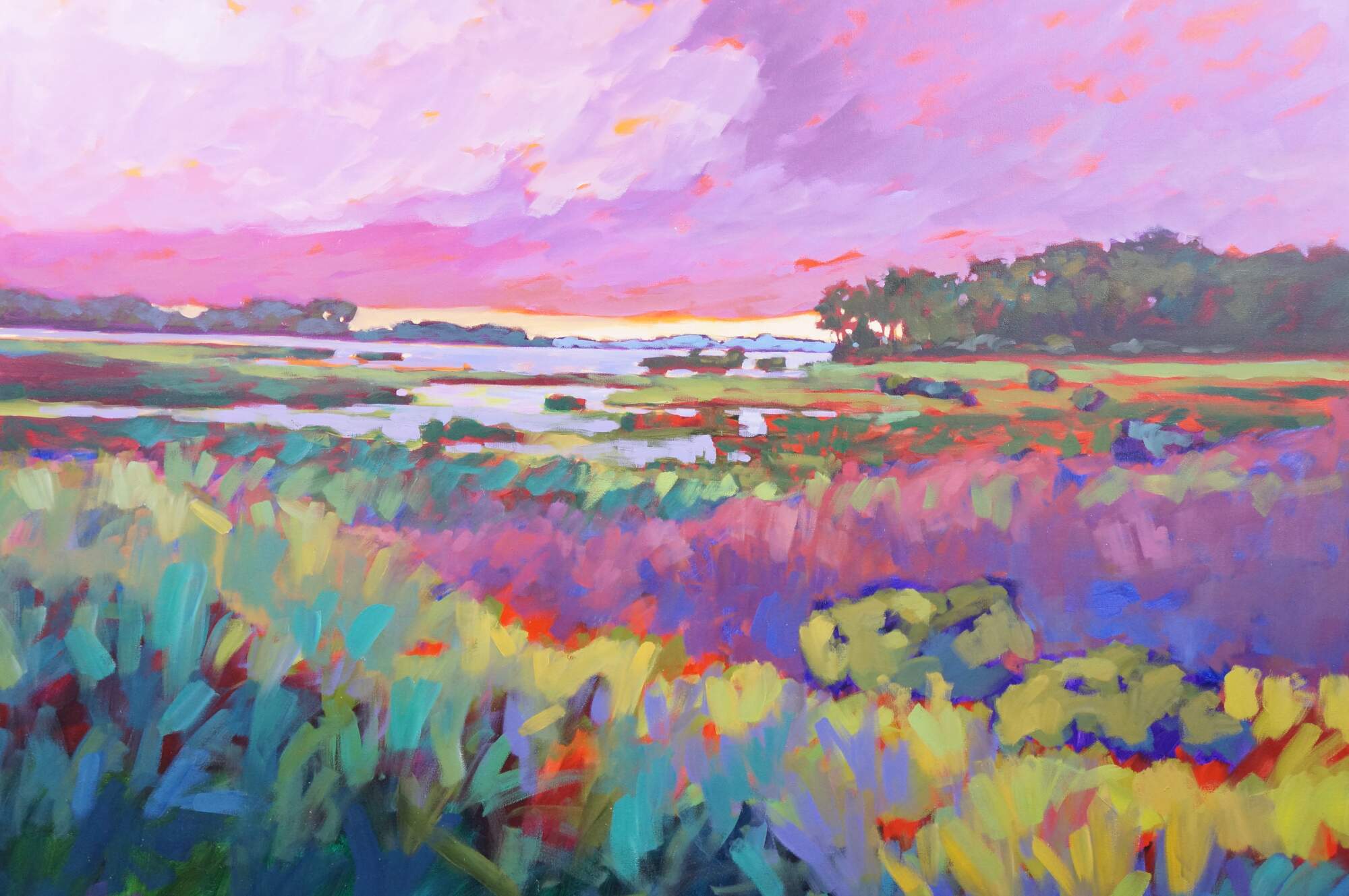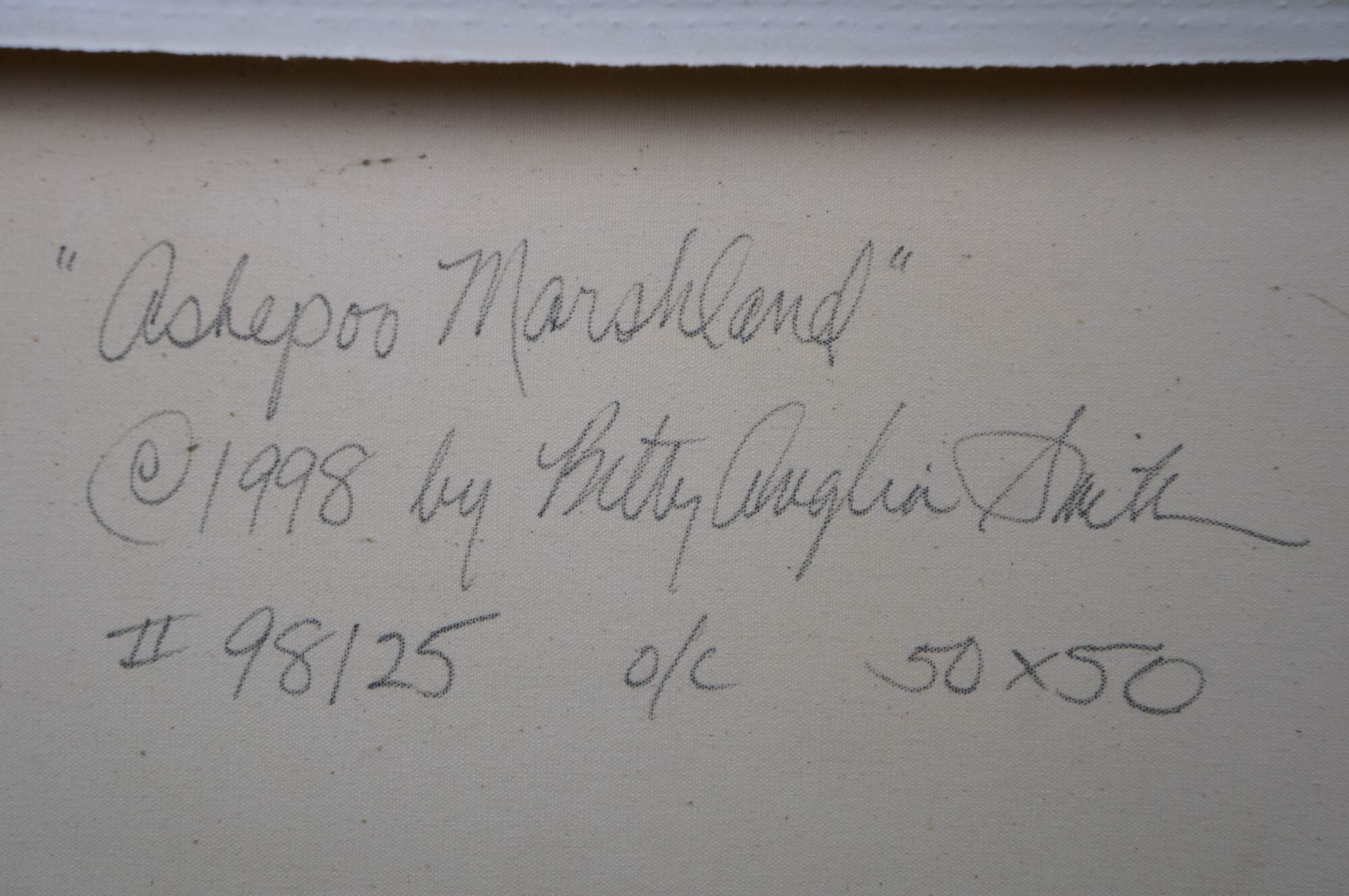 Vintage 1998 Betty Anglin Smith original oil painting on canvas titled Ashepoo Marshland. A vibrant landscape featuring a low-lying, waterlogged wetland dominated by grasses, reeds, rushes, trees and sedges.