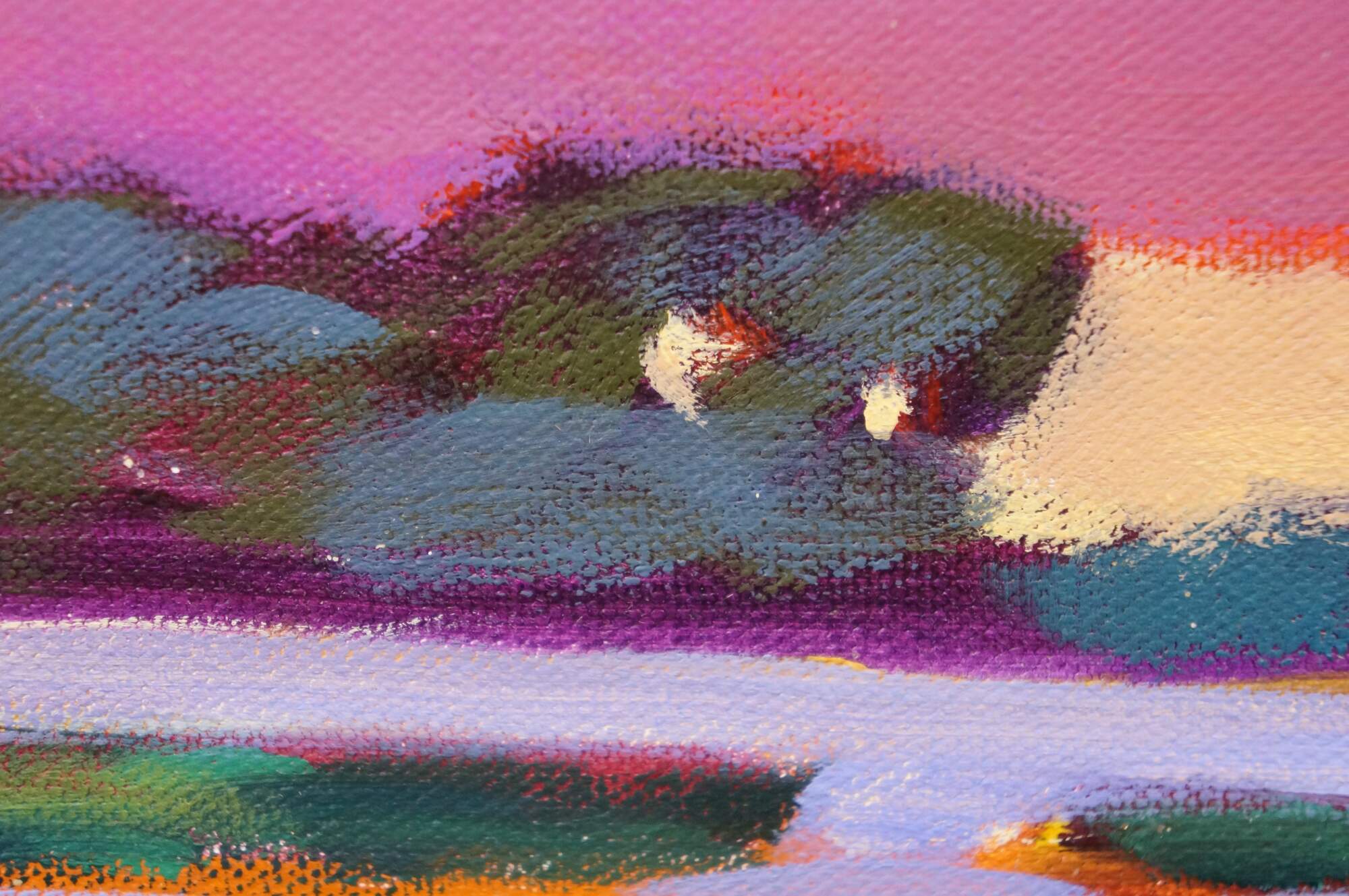 She has discovered that lines were to be found in the colorful shifting clouds and meandering creeks. Using large brushstrokes and eye-catching colors, Smith has worked to capture not just the physical nature of a place, but the feeling as well. Her goal with her paintings is to give the viewer a sense of the immediacy of the moment.