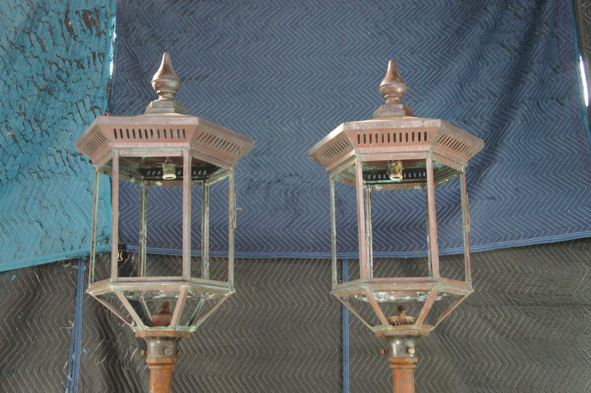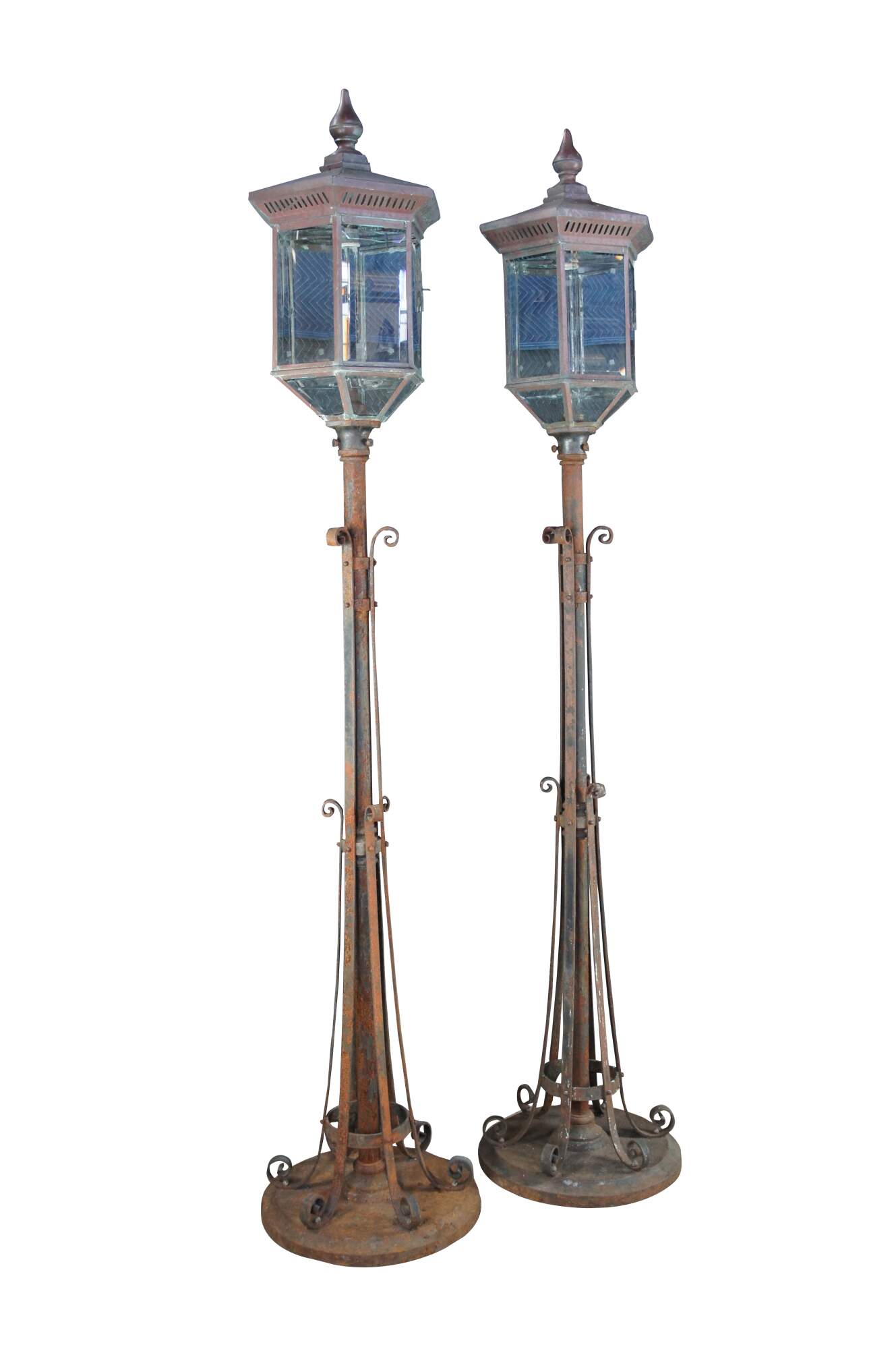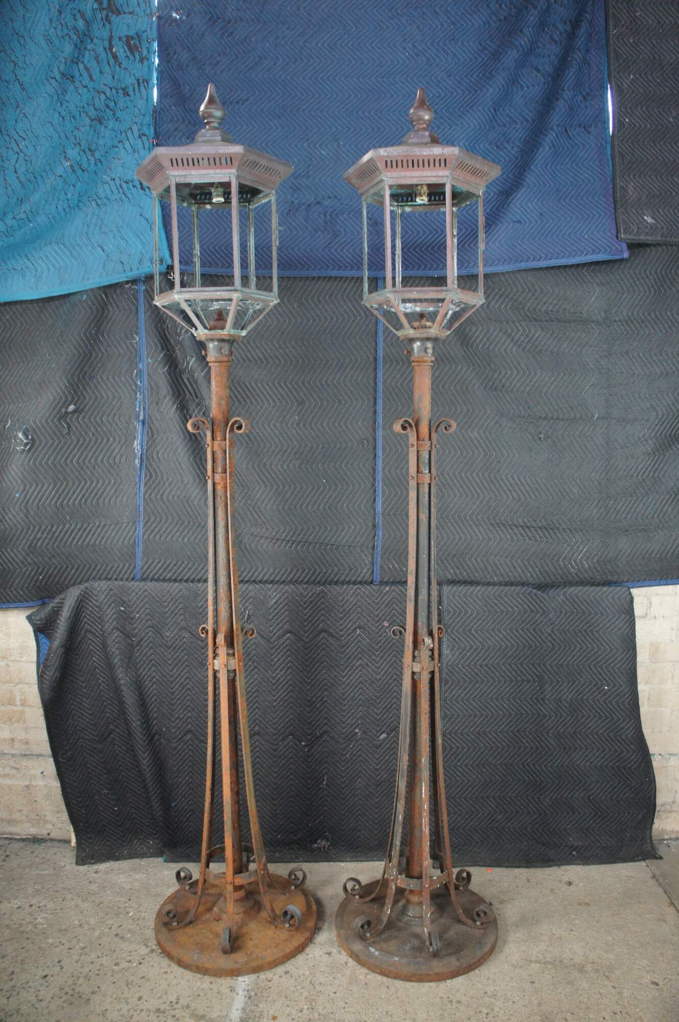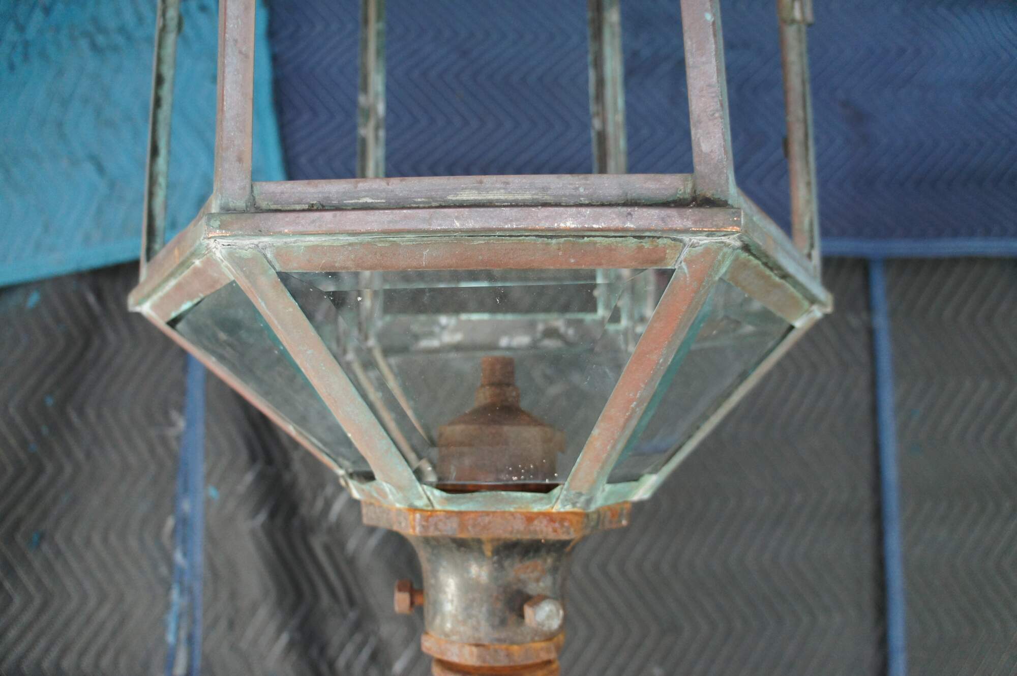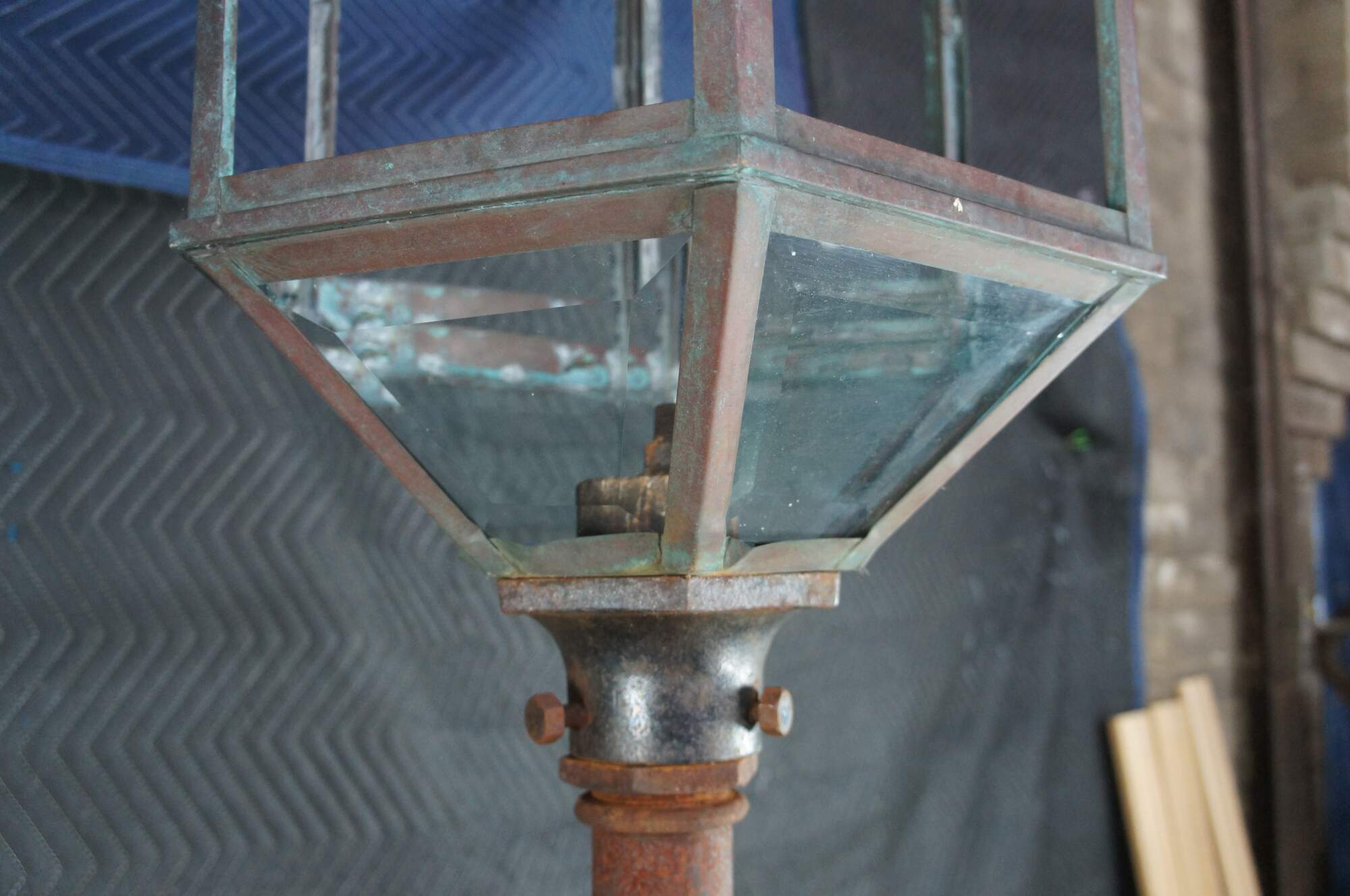A rare pair of early 20th century converted glass wrought iron street post lights / lamps. Features a copper hexagonal lantern top with spire finial over fluted molding and beveled glass inserts. The lantern is supported by a large wrought iron post with scrolled accents leading to a round pedestal base. The top has one central socket for illumination.