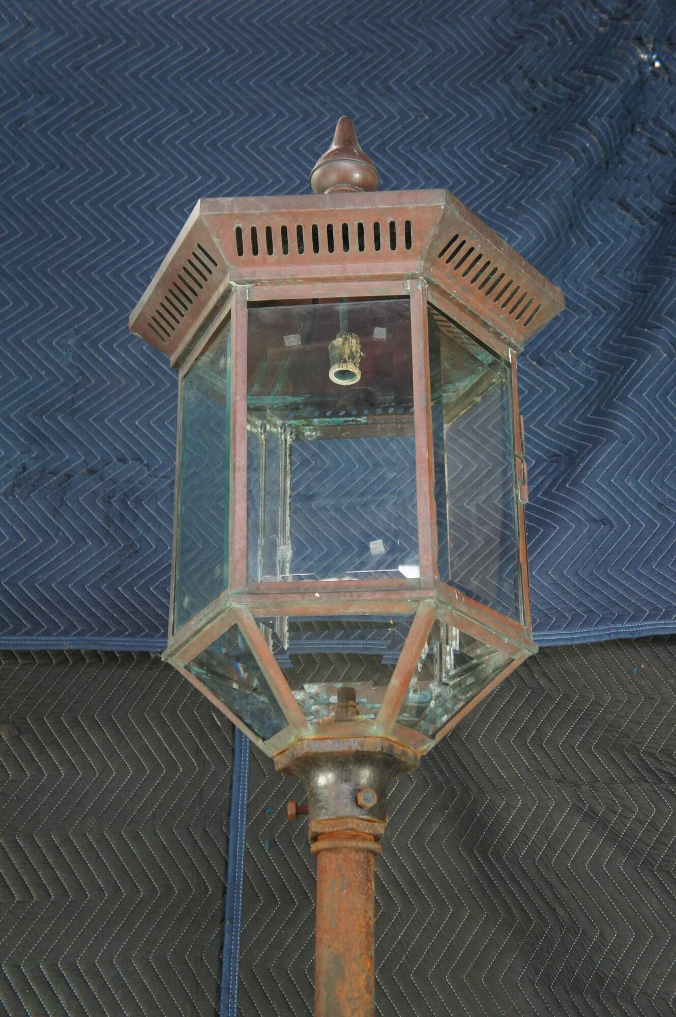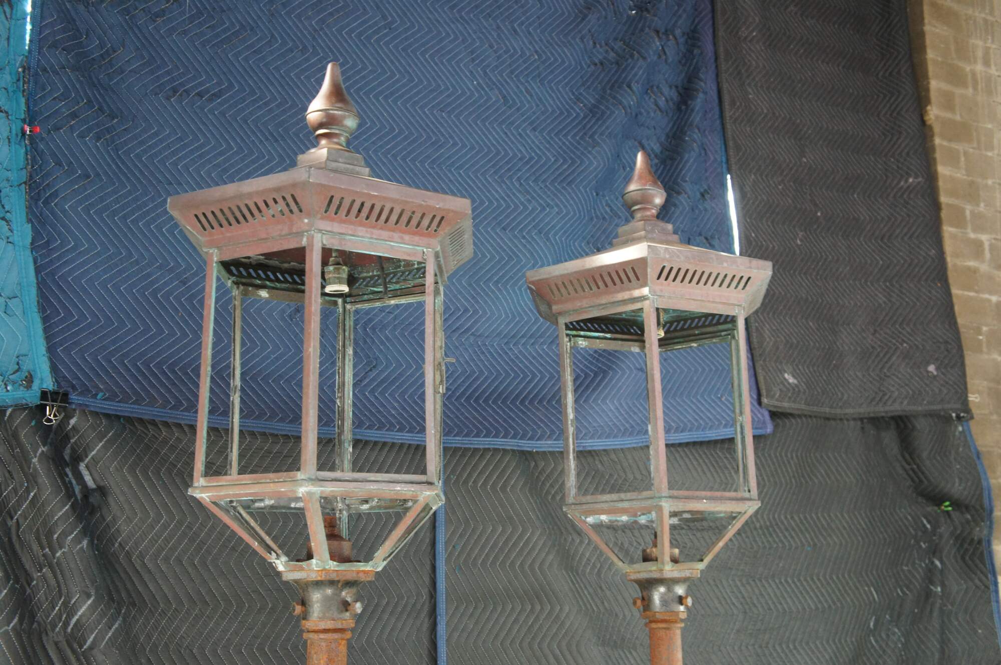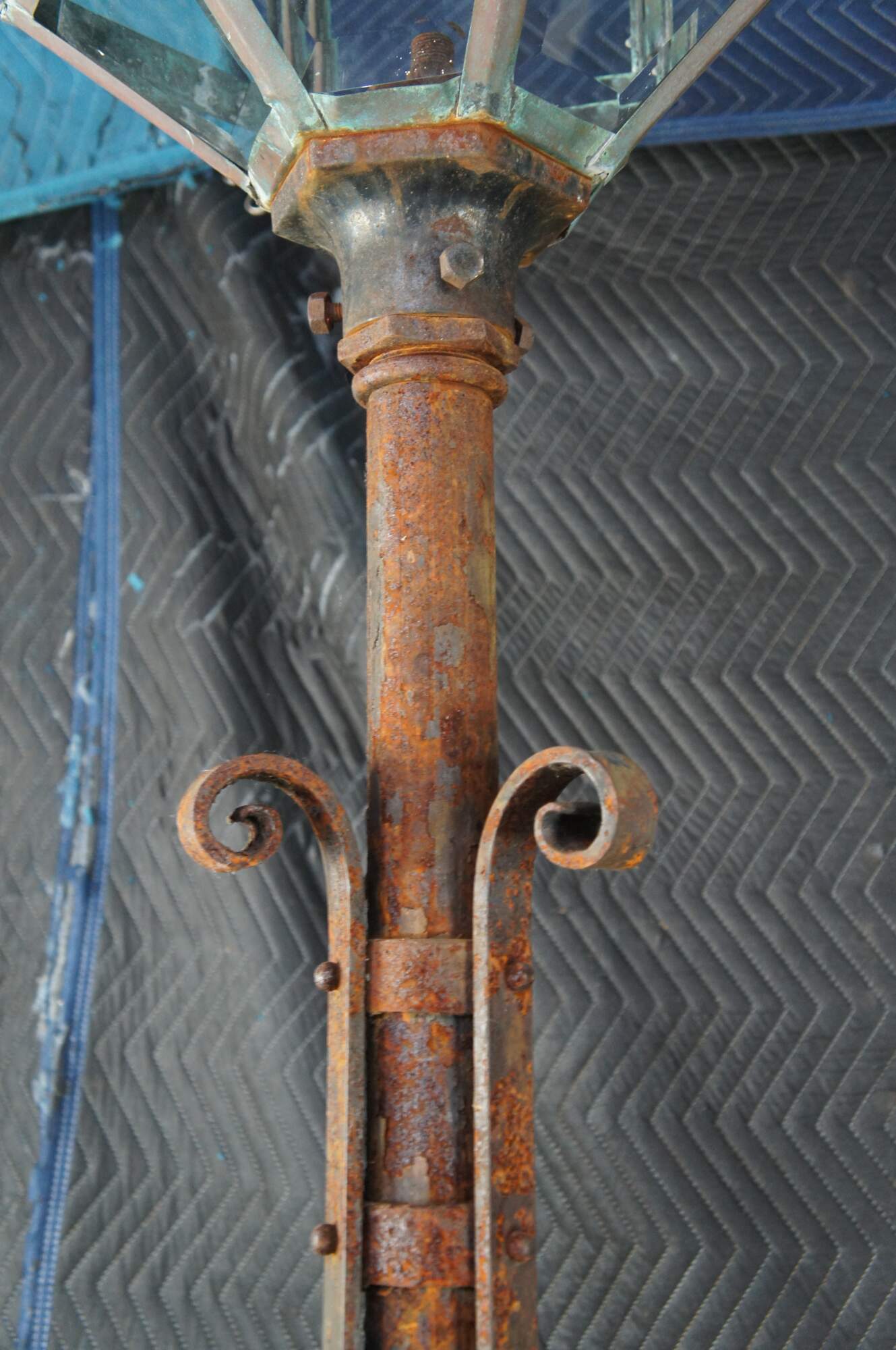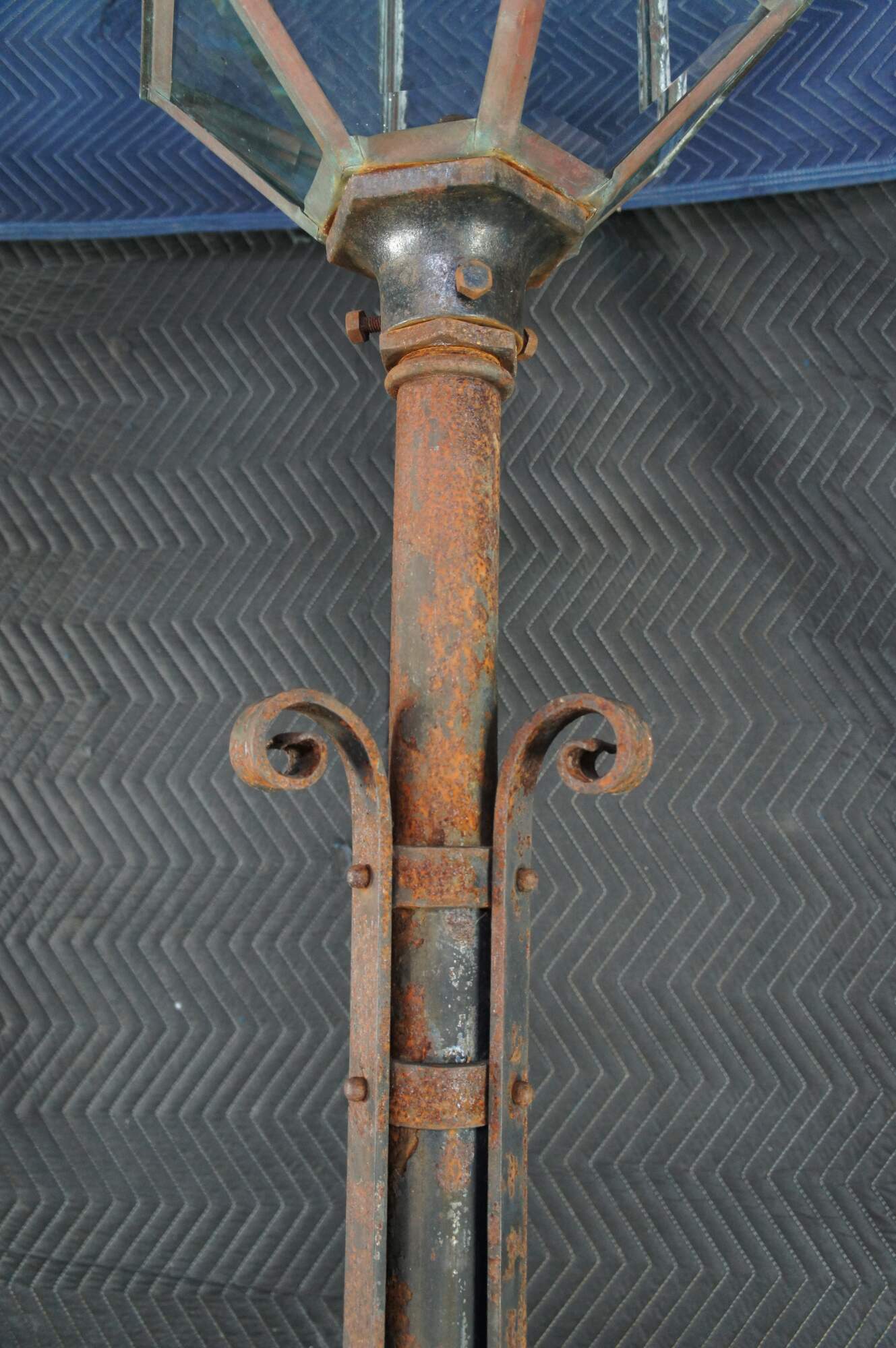 A rare pair of early 20th century converted glass wrought iron street post lights / lamps. Features a copper hexagonal lantern top with spire finial over fluted molding and beveled glass inserts. The lantern is supported by a large wrought iron post with scrolled accents leading to a round pedestal base. The top has one central socket for illumination.