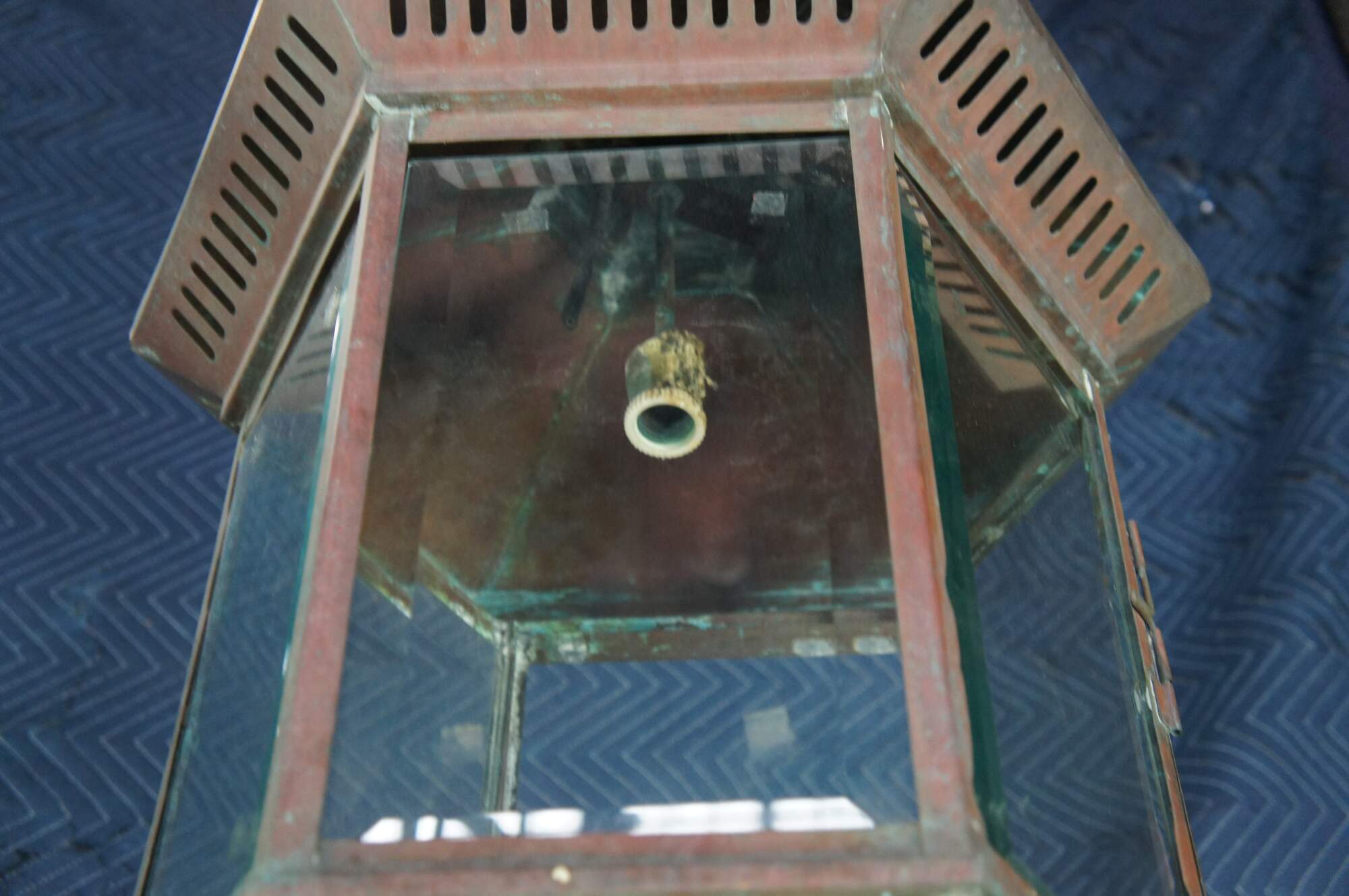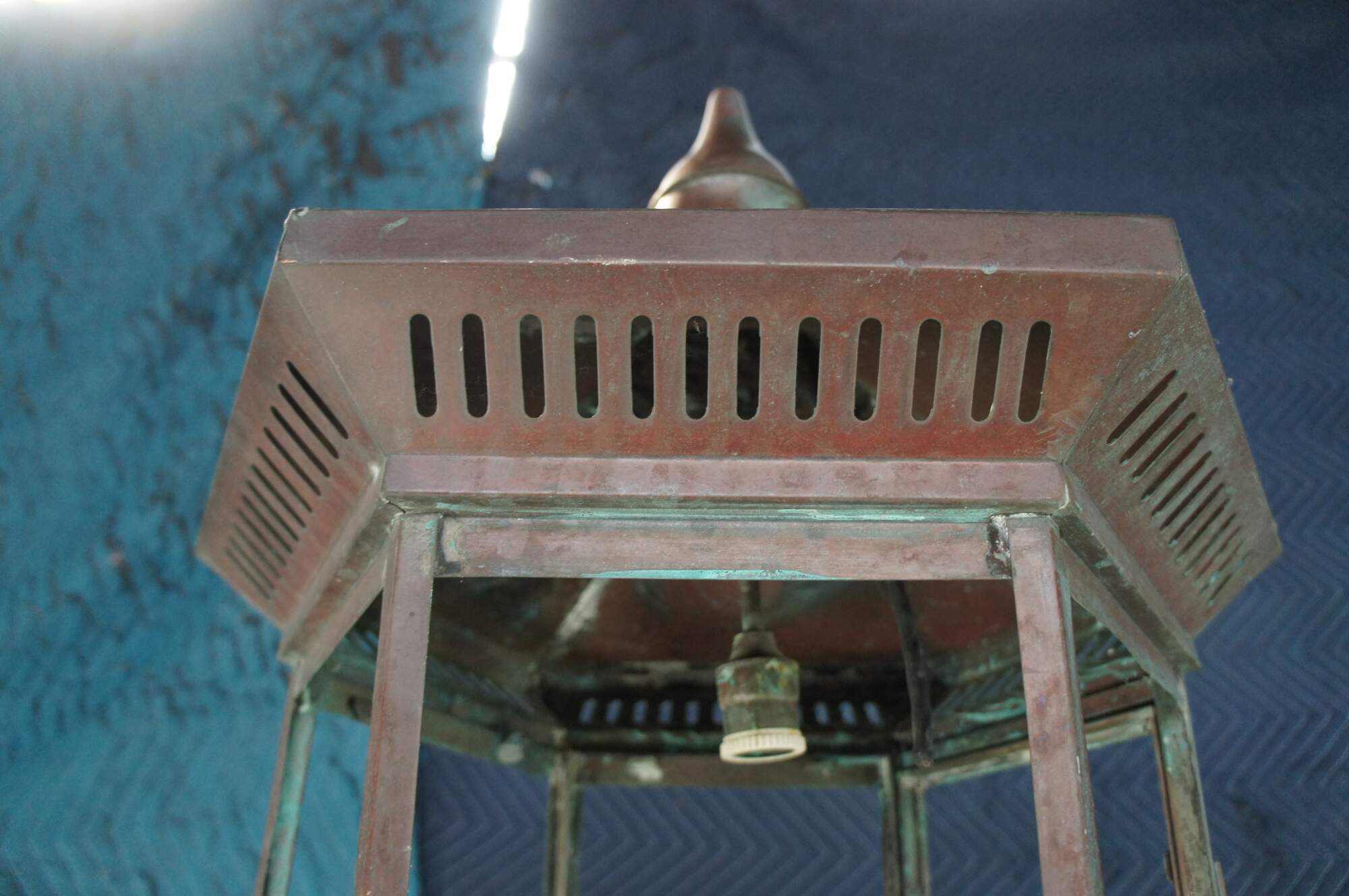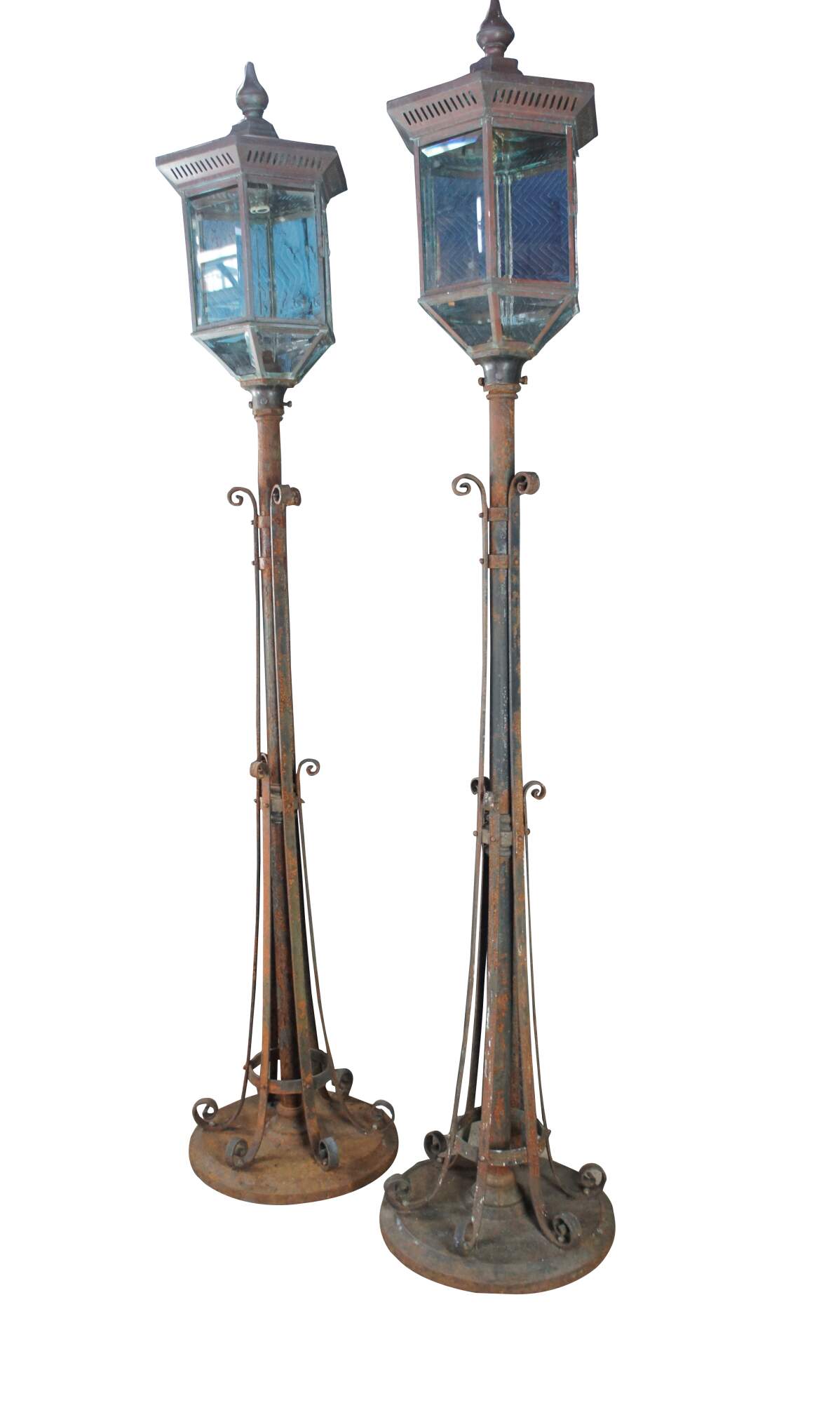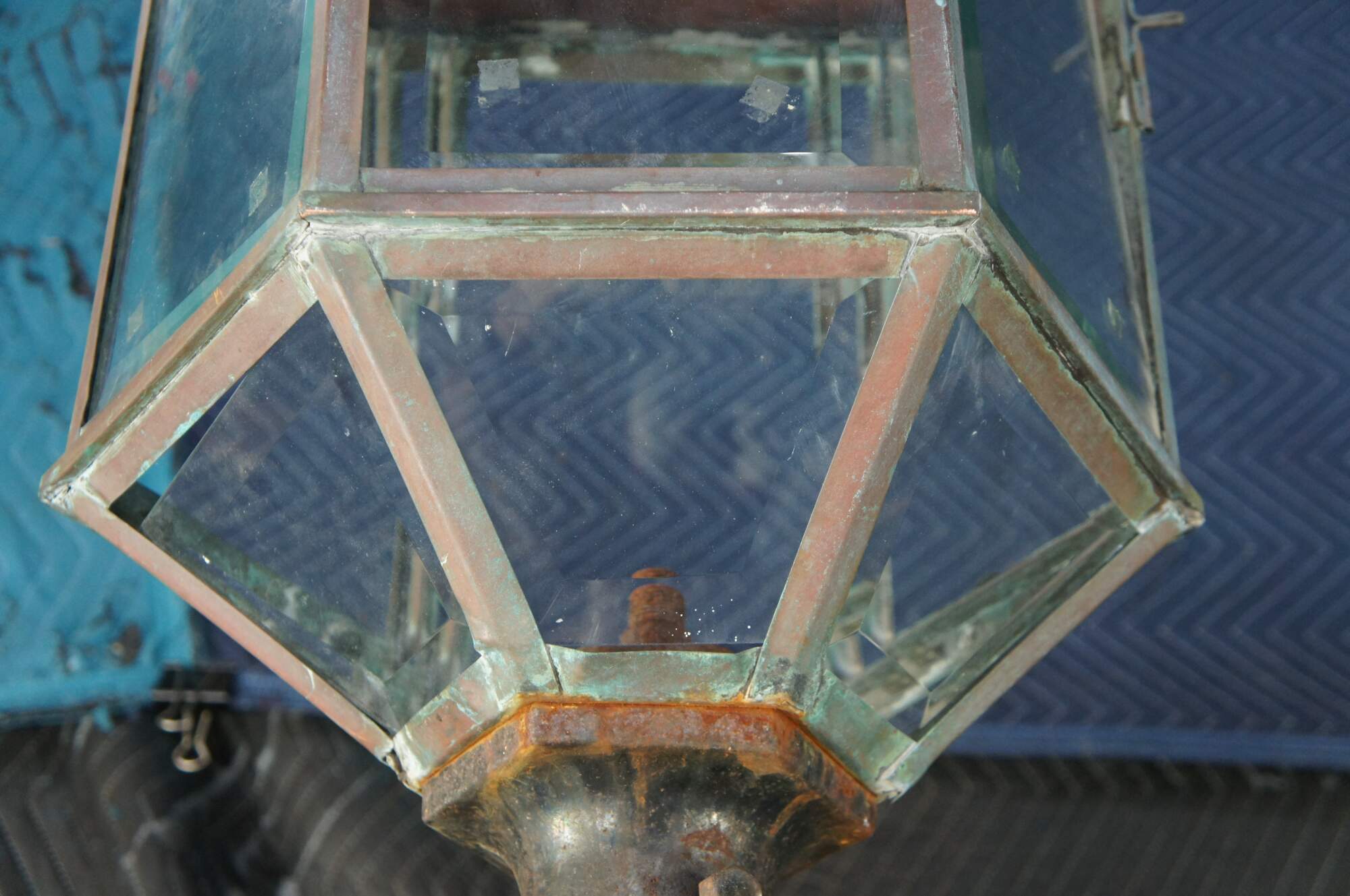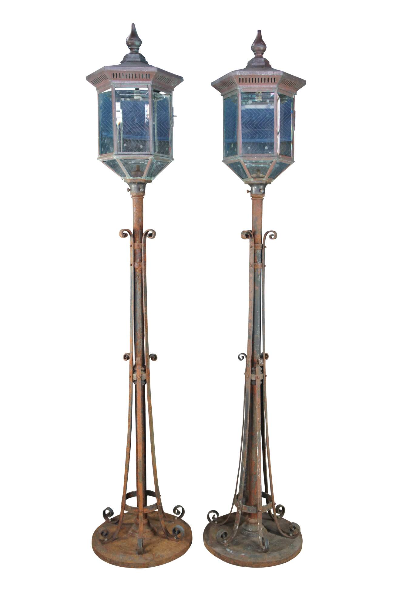 A rare pair of early 20th century converted glass wrought iron street post lights / lamps. Features a copper hexagonal lantern top with spire finial over fluted molding and beveled glass inserts. The lantern is supported by a large wrought iron post with scrolled accents leading to a round pedestal base. The top has one central socket for illumination.