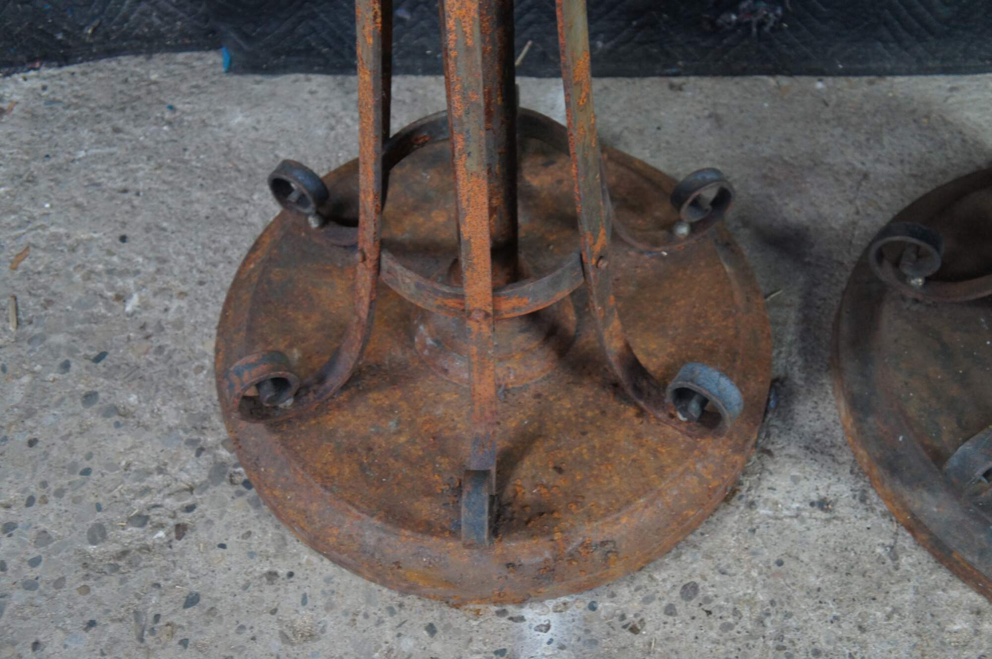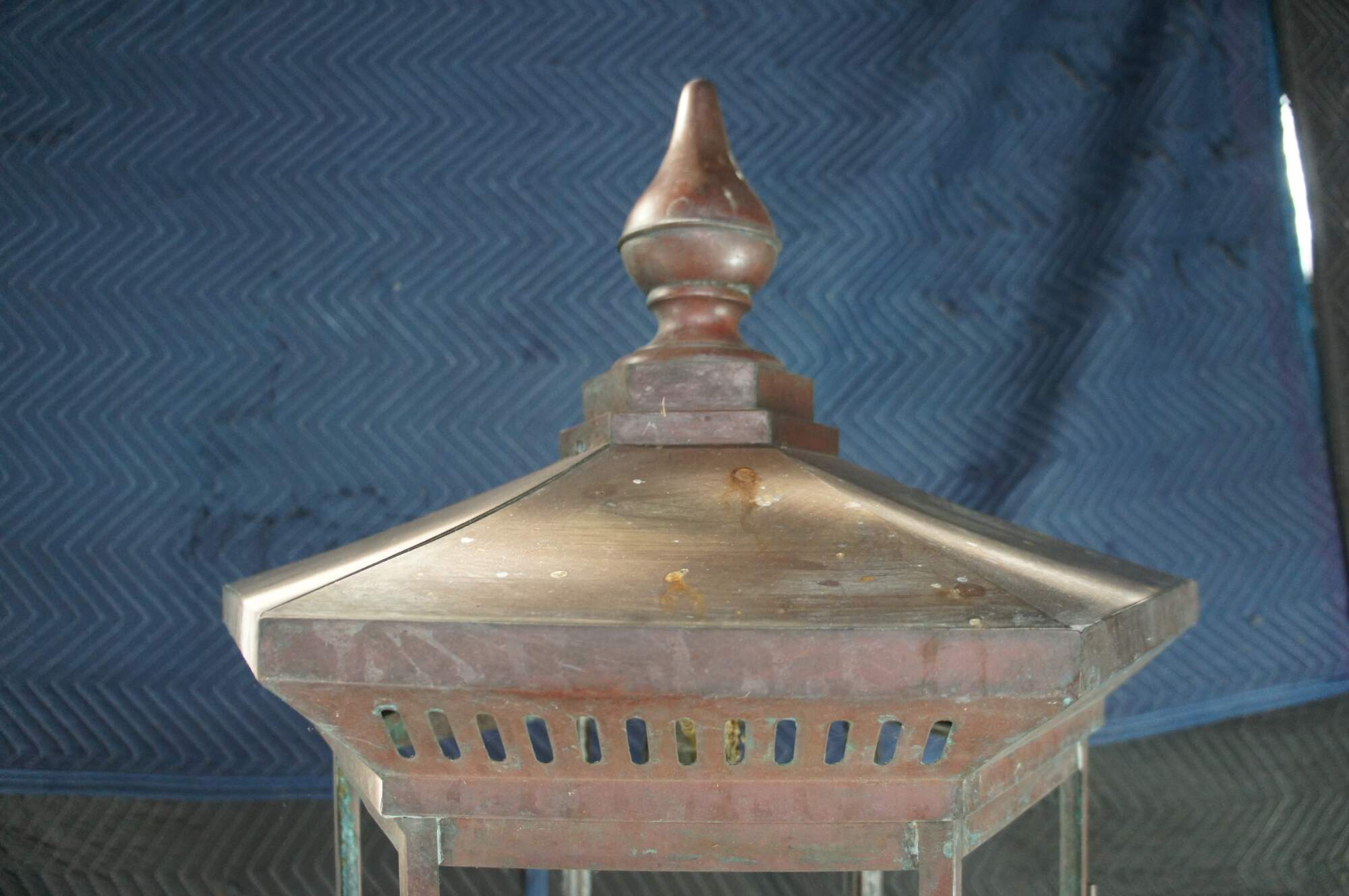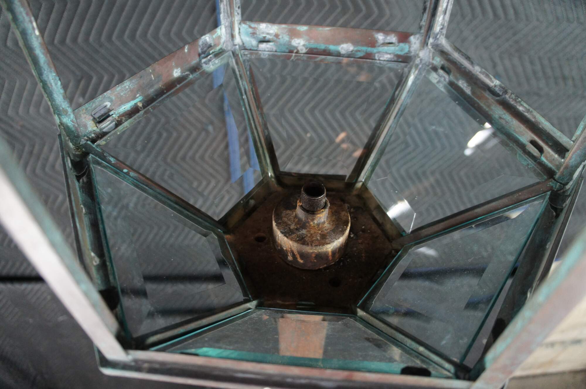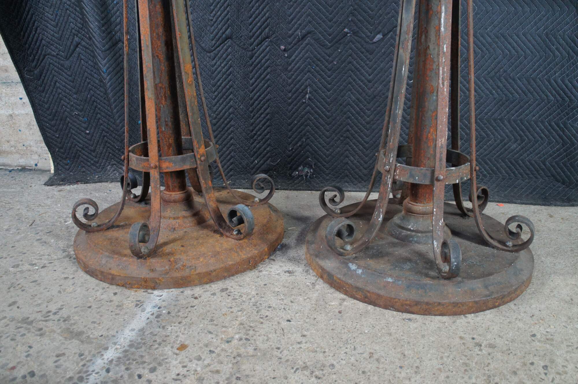 A rare pair of early 20th century converted glass wrought iron street post lights / lamps. Features a copper hexagonal lantern top with spire finial over fluted molding and beveled glass inserts. The lantern is supported by a large wrought iron post with scrolled accents leading to a round pedestal base. The top has one central socket for illumination.