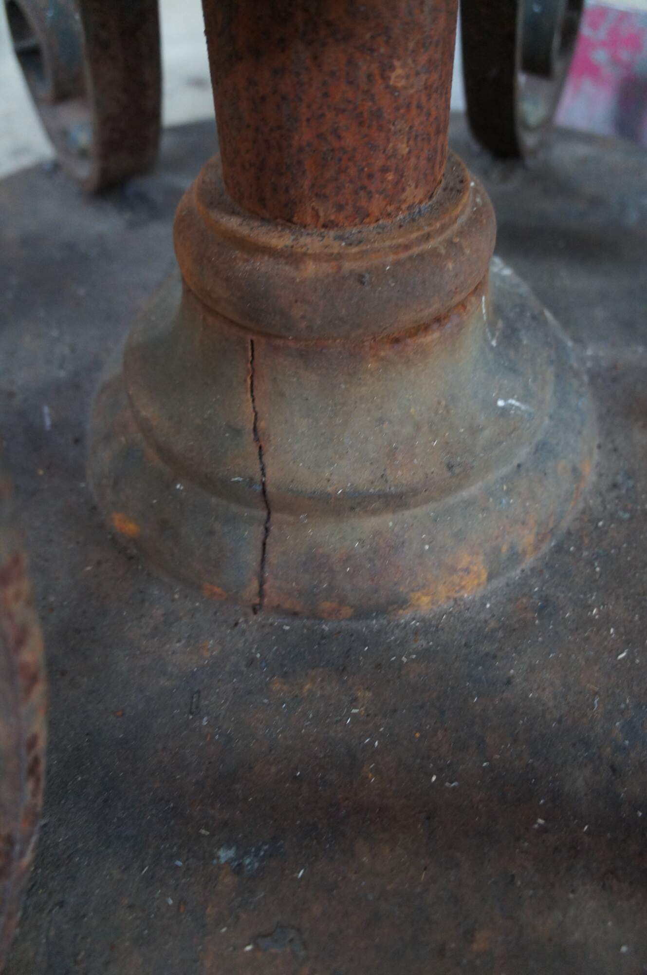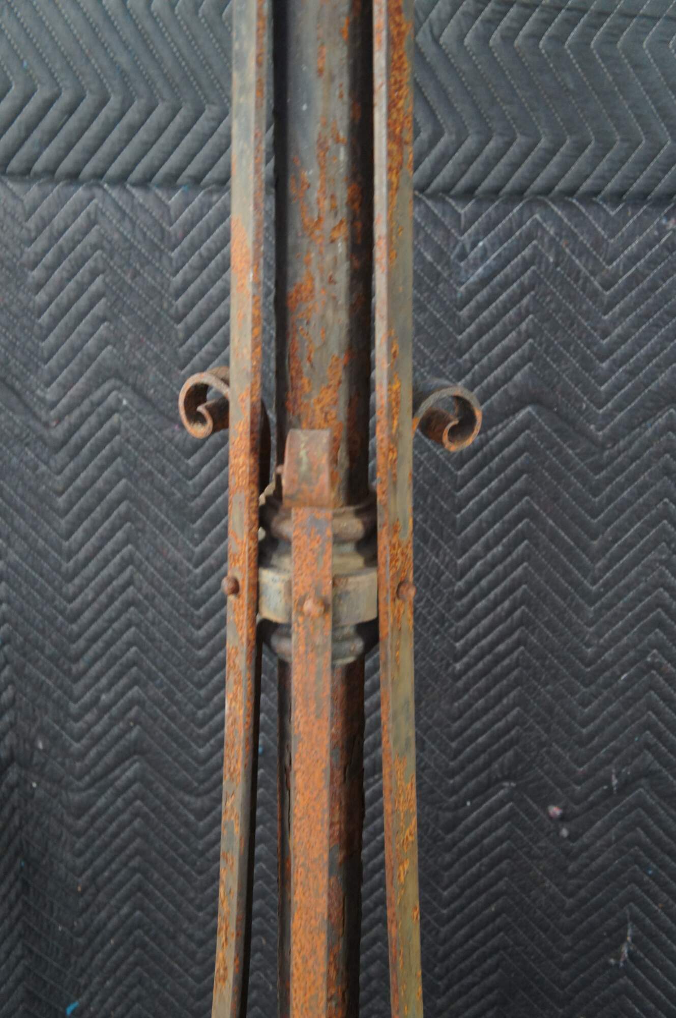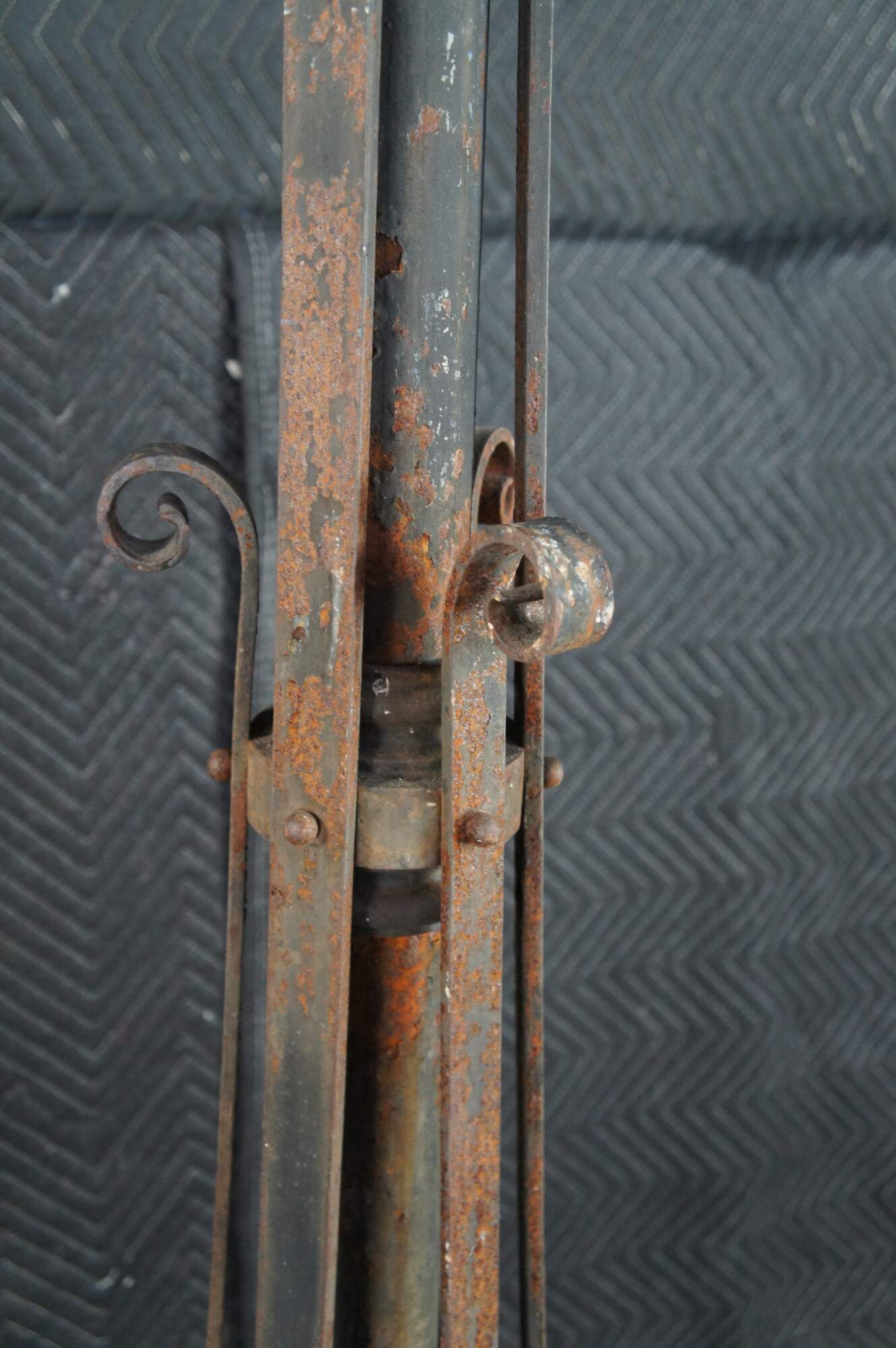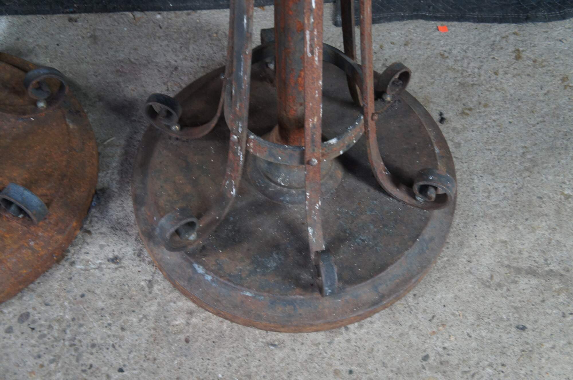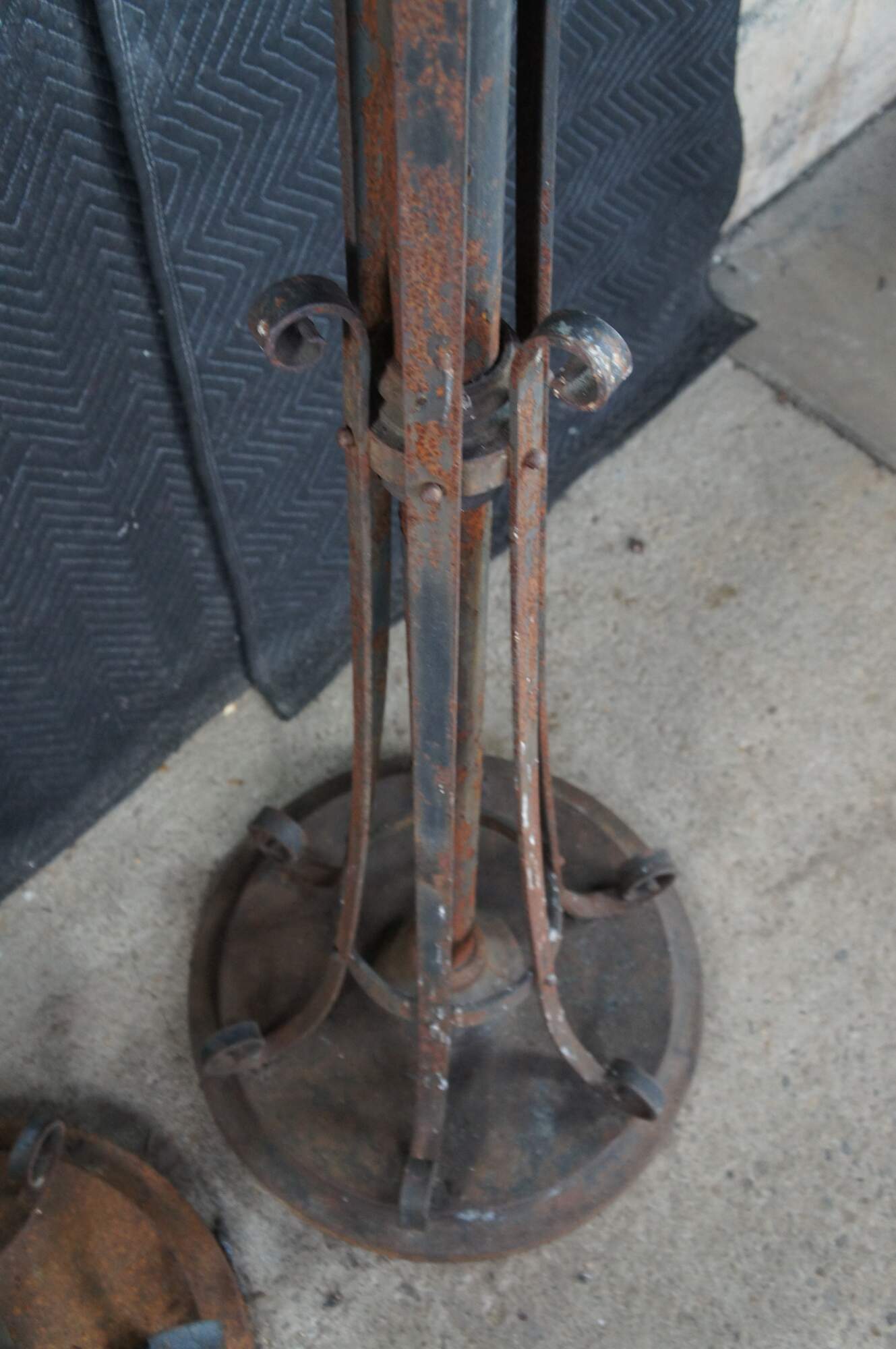 A rare pair of early 20th century converted glass wrought iron street post lights / lamps. Features a copper hexagonal lantern top with spire finial over fluted molding and beveled glass inserts. The lantern is supported by a large wrought iron post with scrolled accents leading to a round pedestal base. The top has one central socket for illumination.