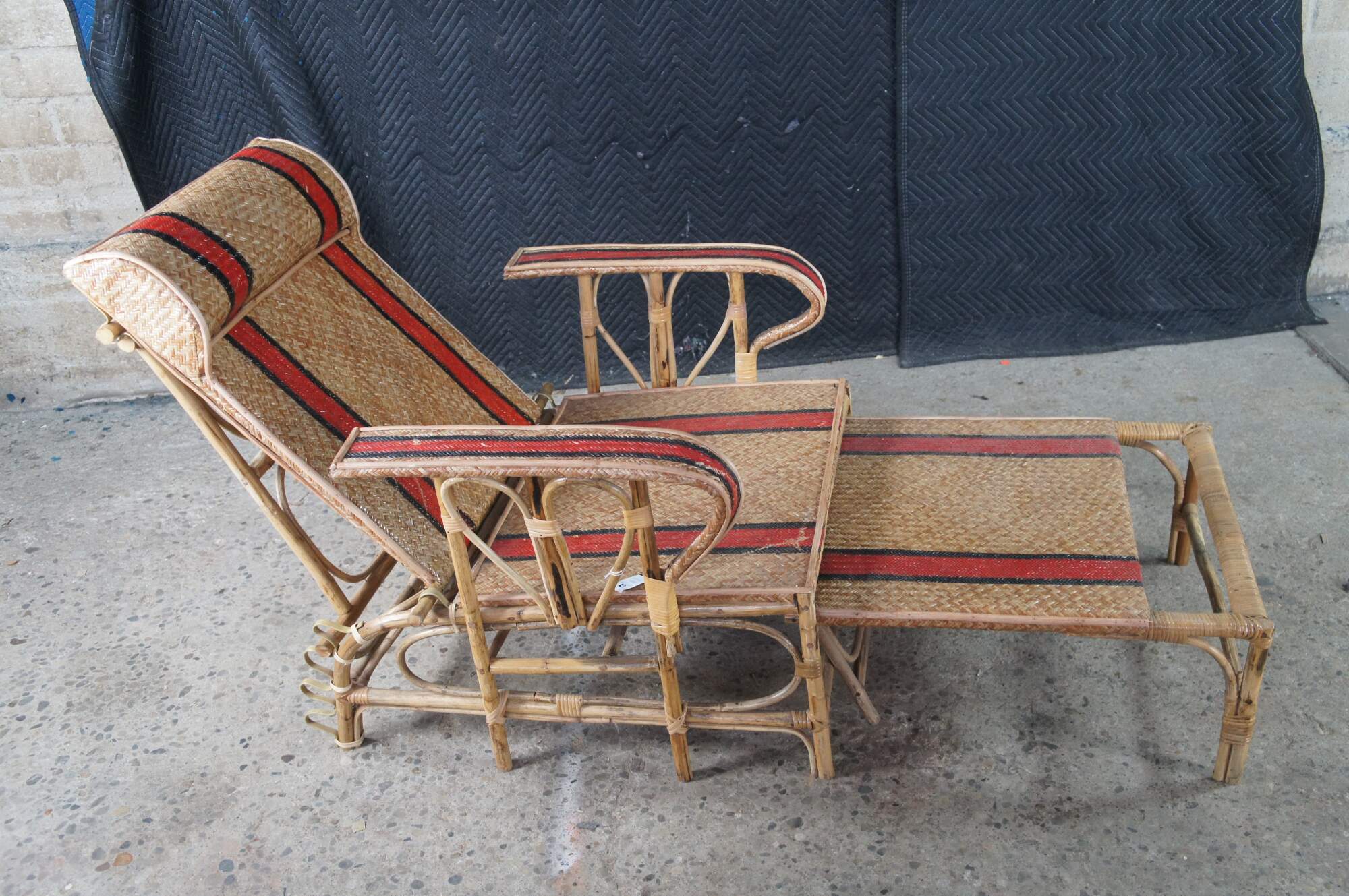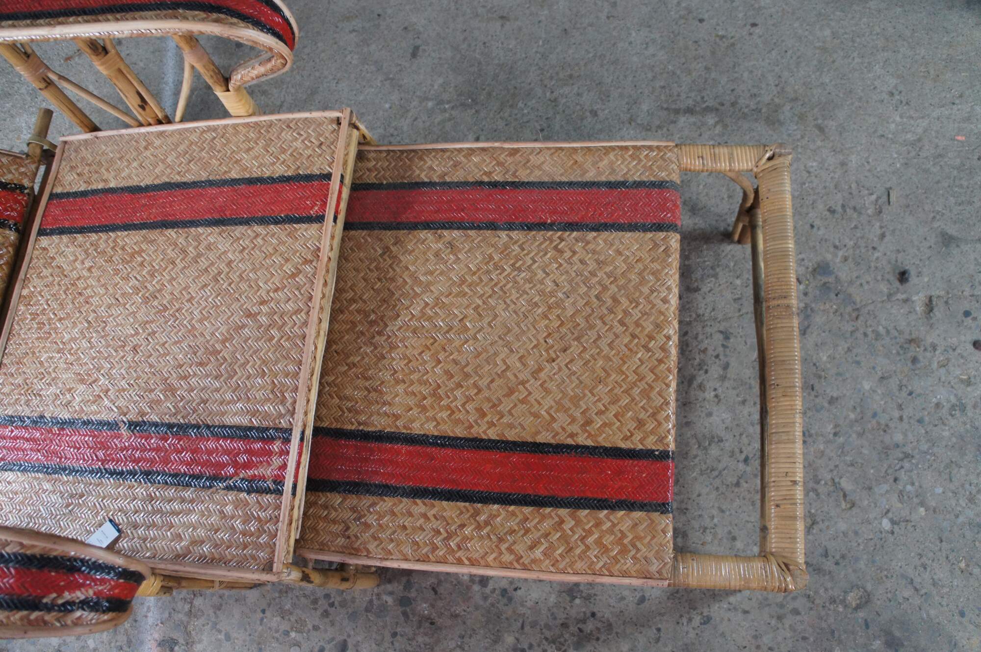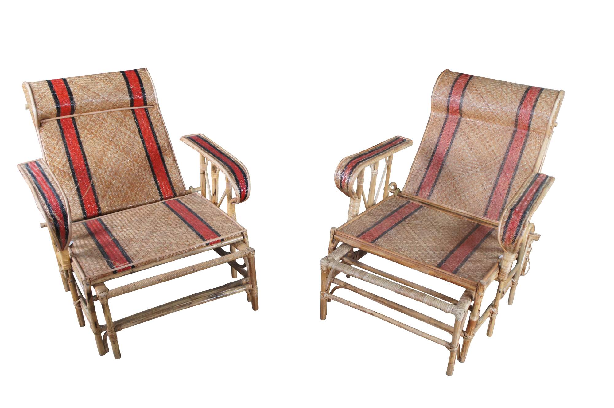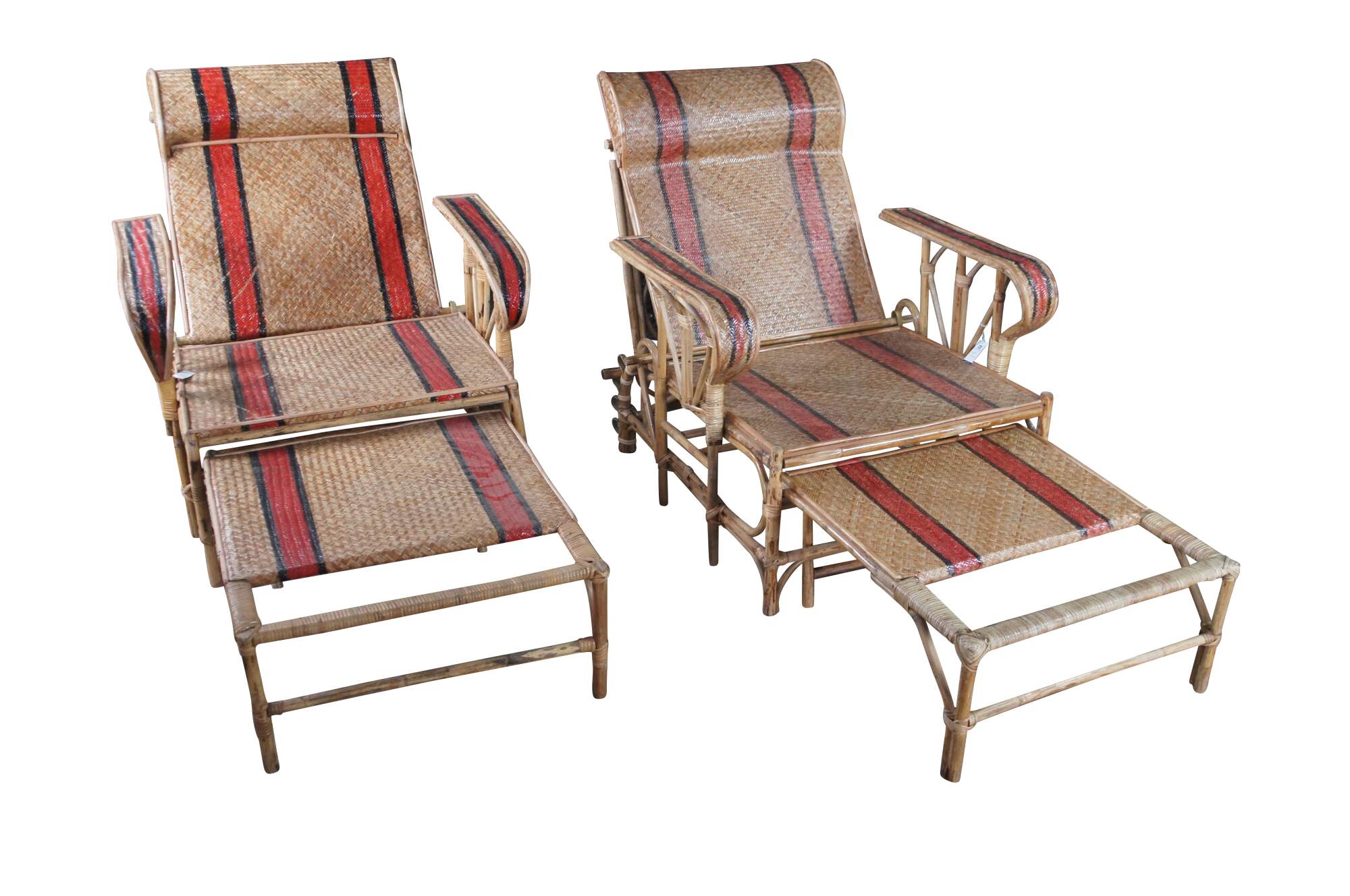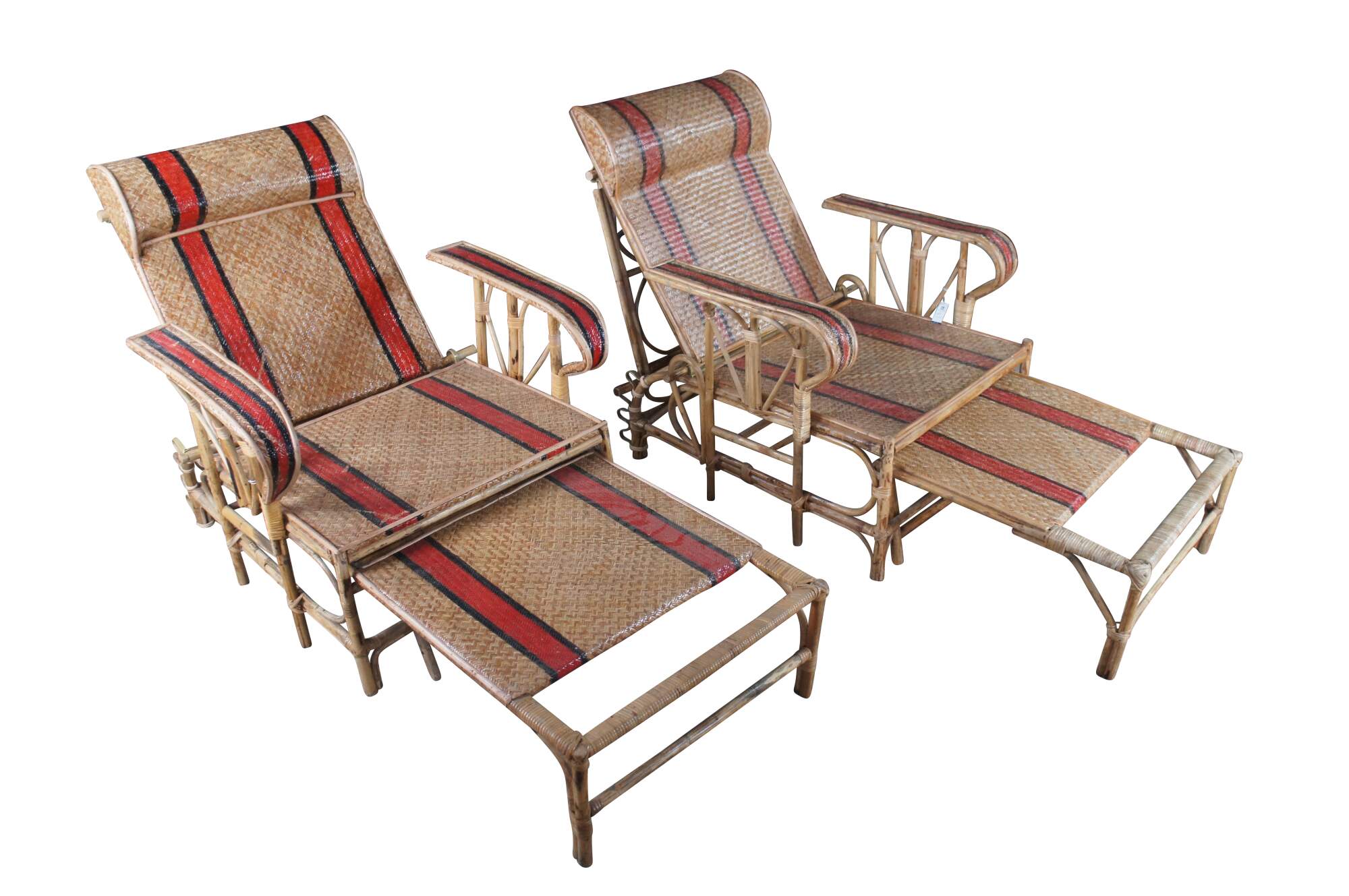 Features a bamboo and woven rattan frame with red and black stripes. The chairs have an adjustable back and extendable legs allowing them to be used poolside for tanning and lounging. When not in the extended position the chairs can be used in a traditional upright format. A unique design and fun color