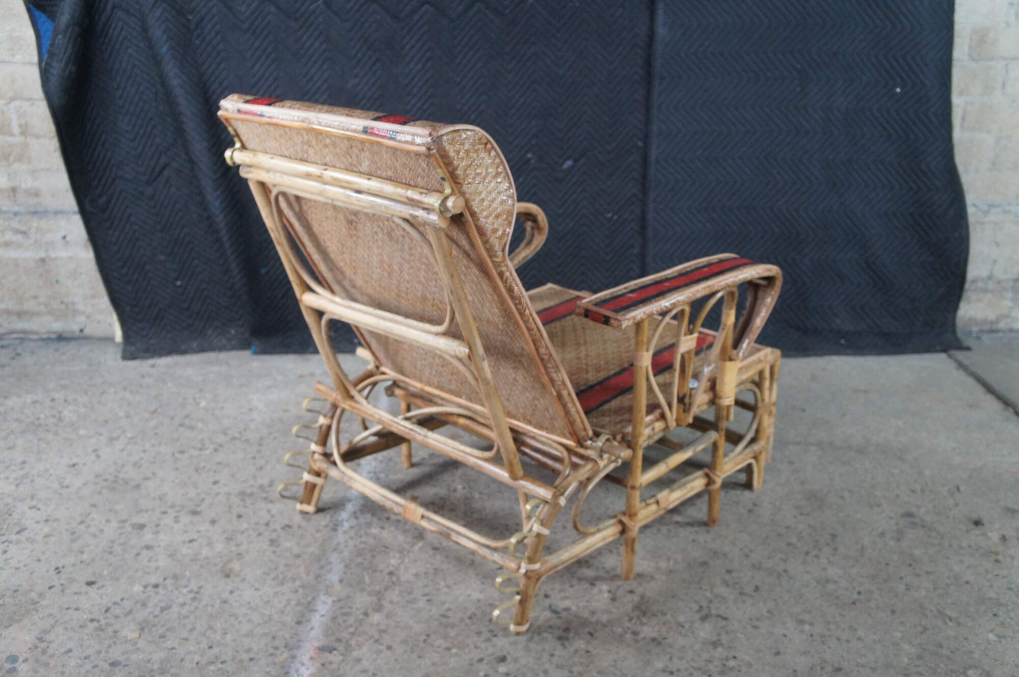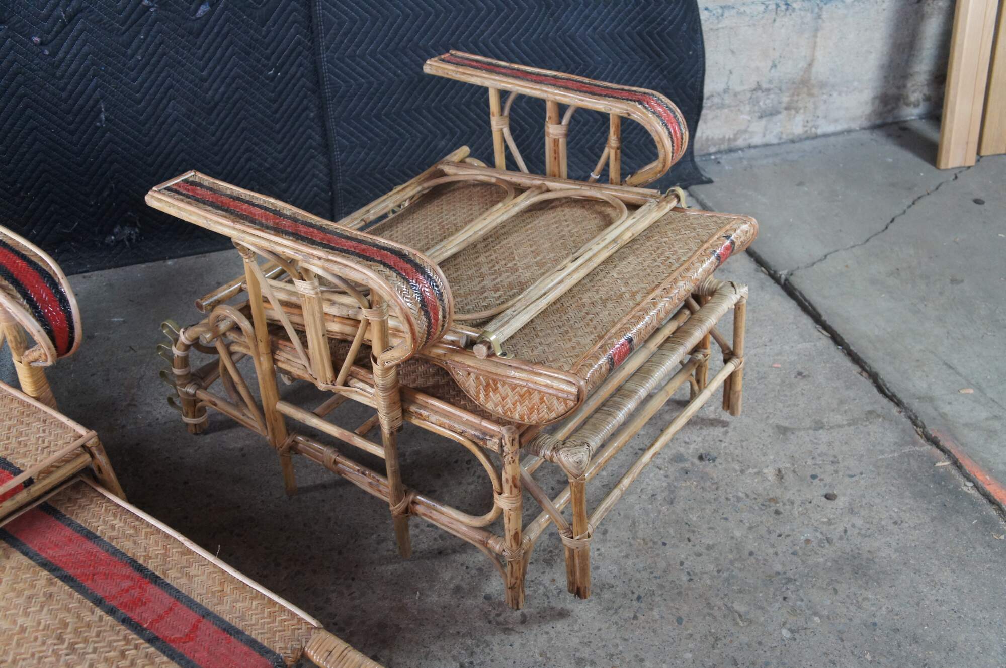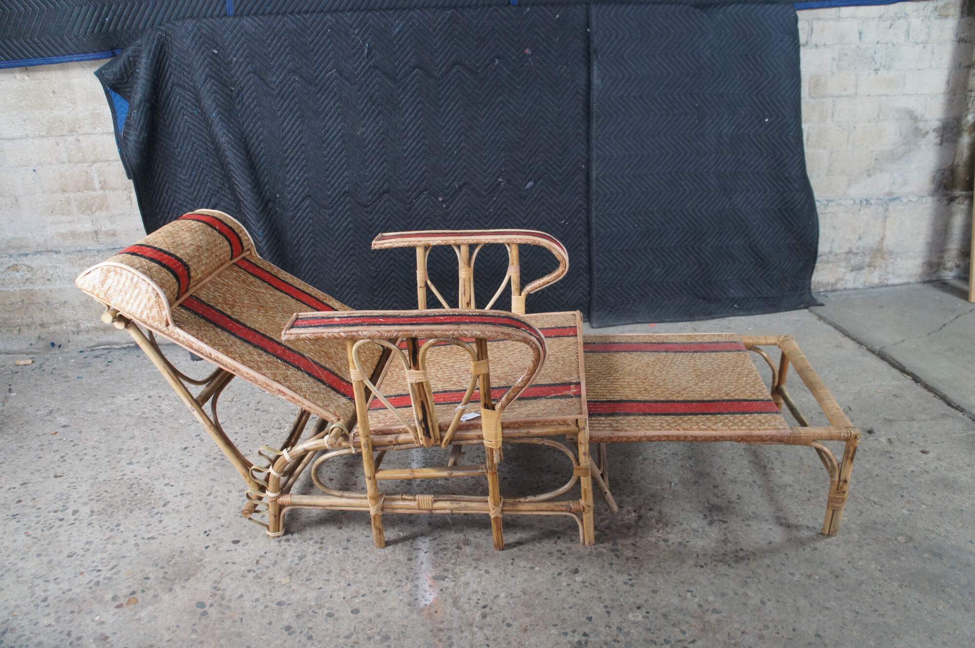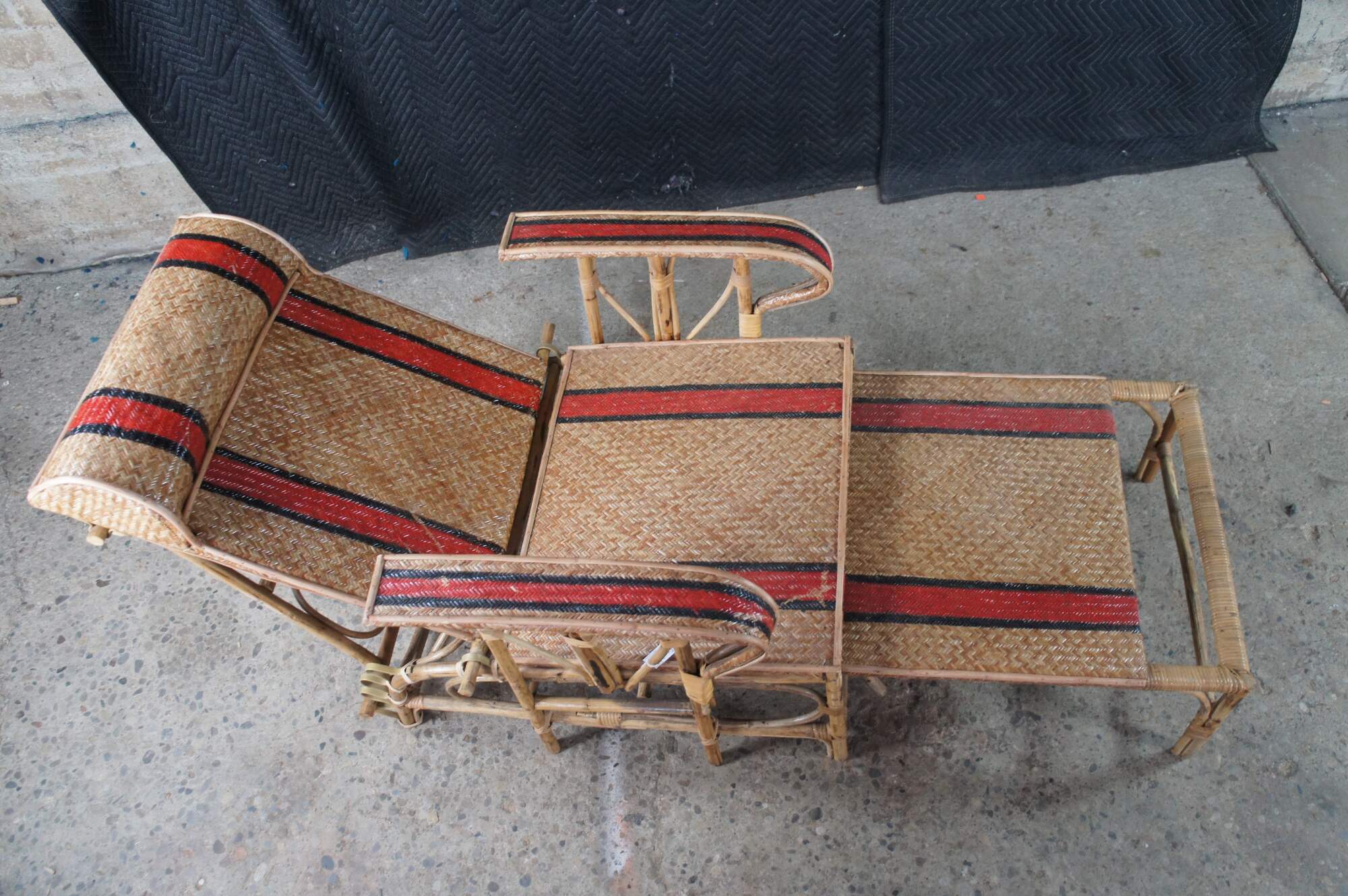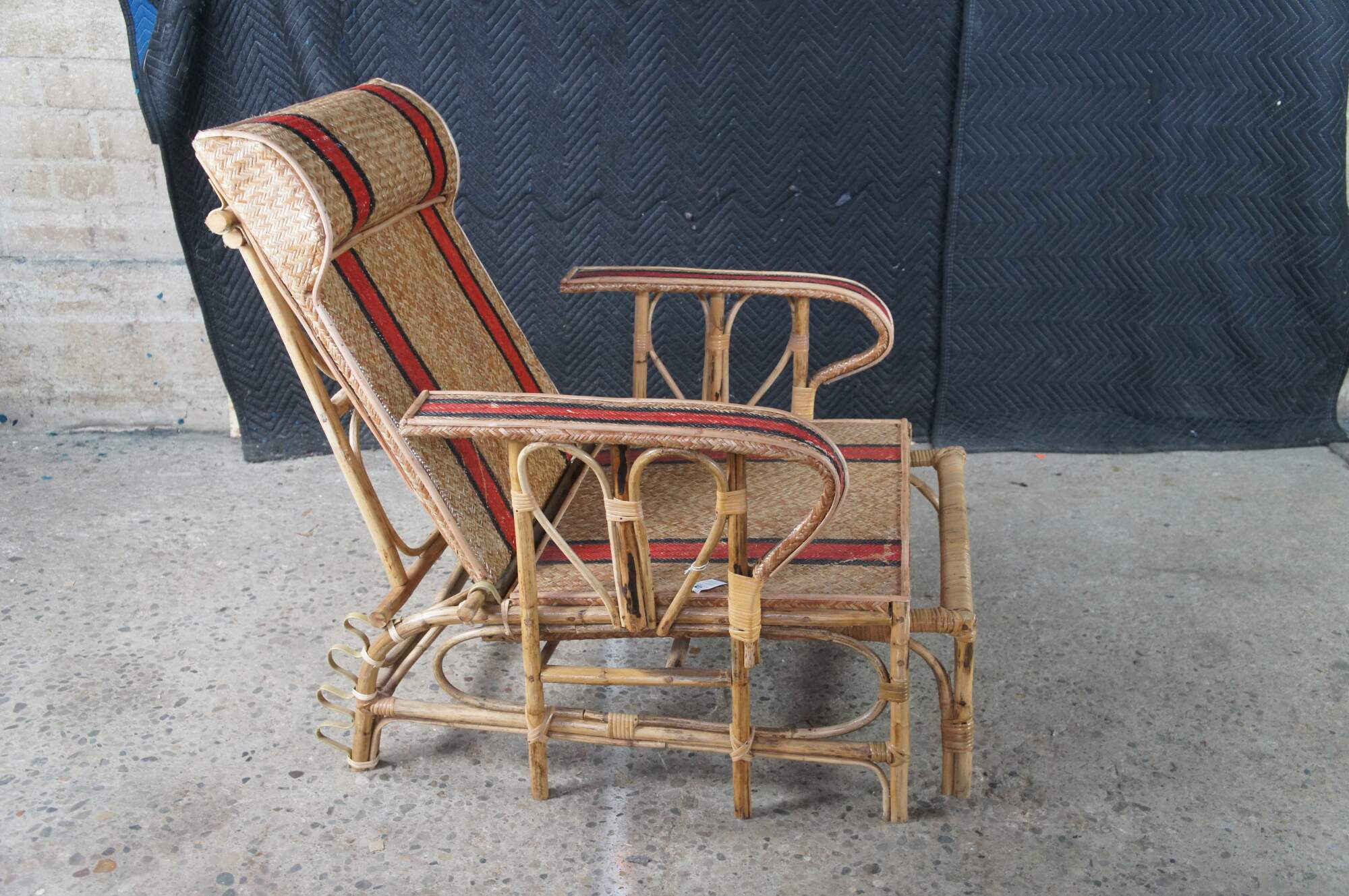 Features a bamboo and woven rattan frame with red and black stripes. The chairs have an adjustable back and extendable legs allowing them to be used poolside for tanning and lounging. When not in the extended position the chairs can be used in a traditional upright format. A unique design and fun color