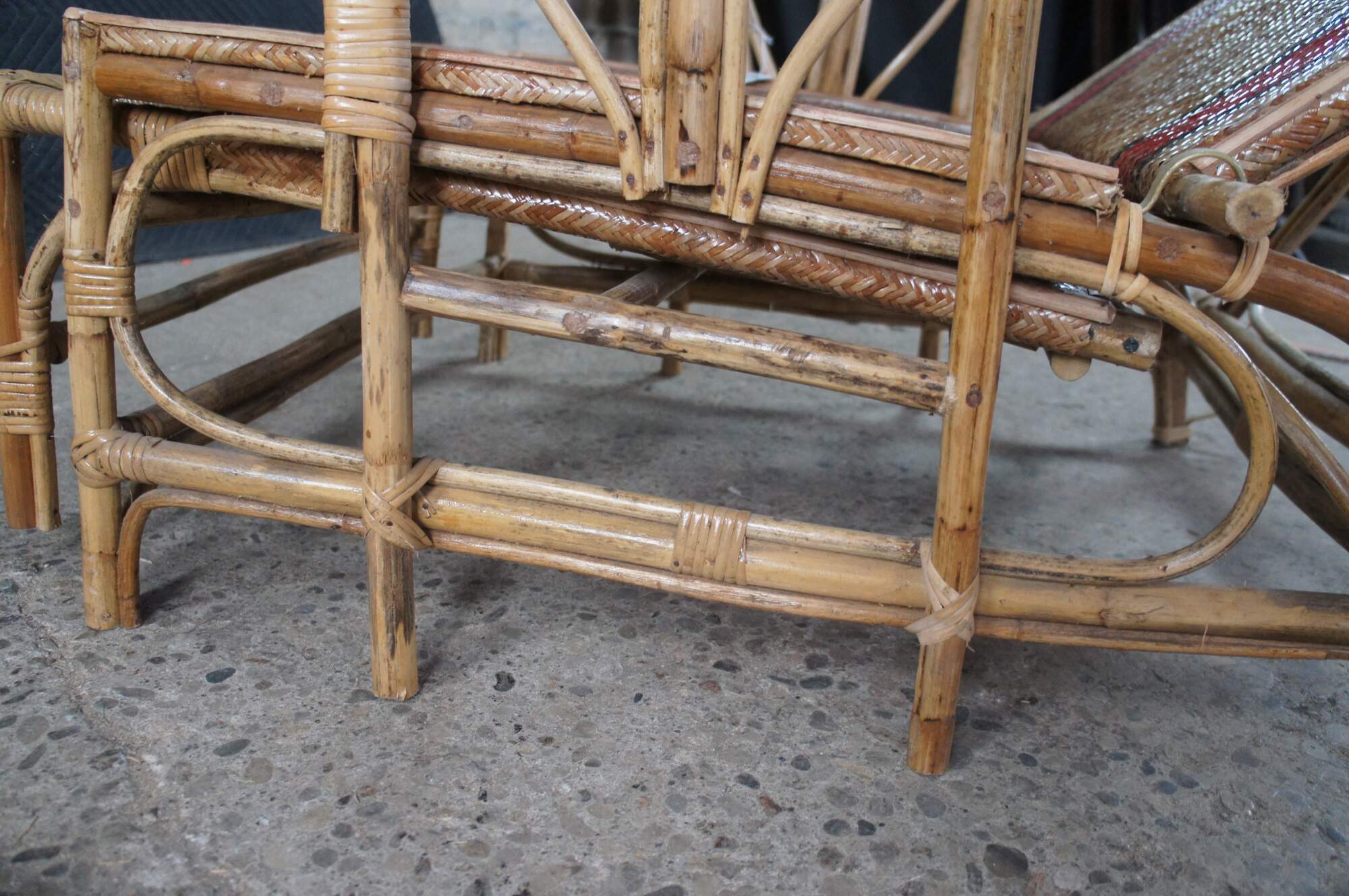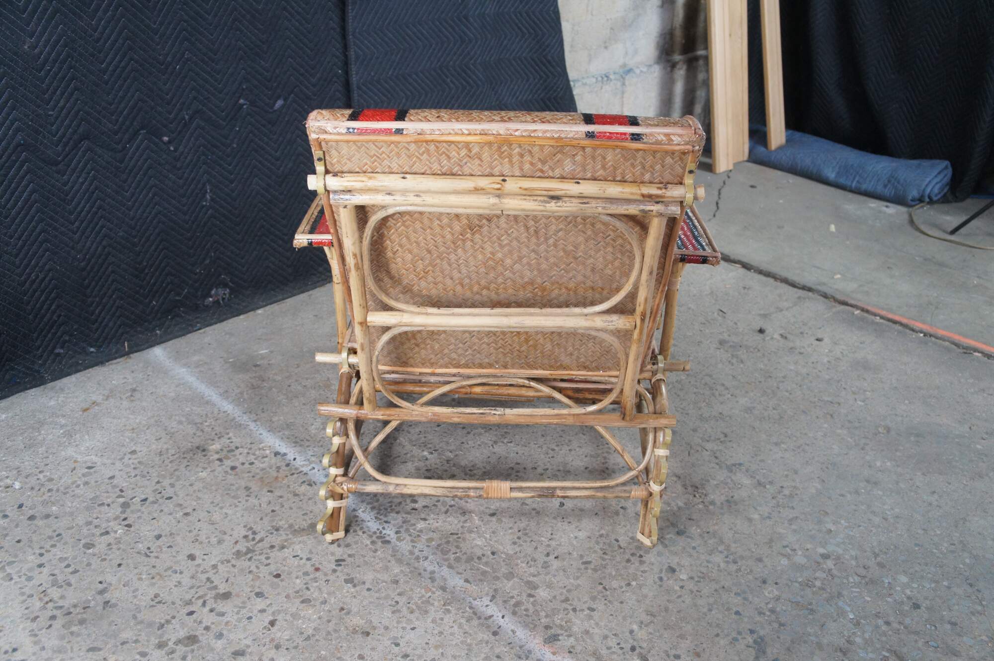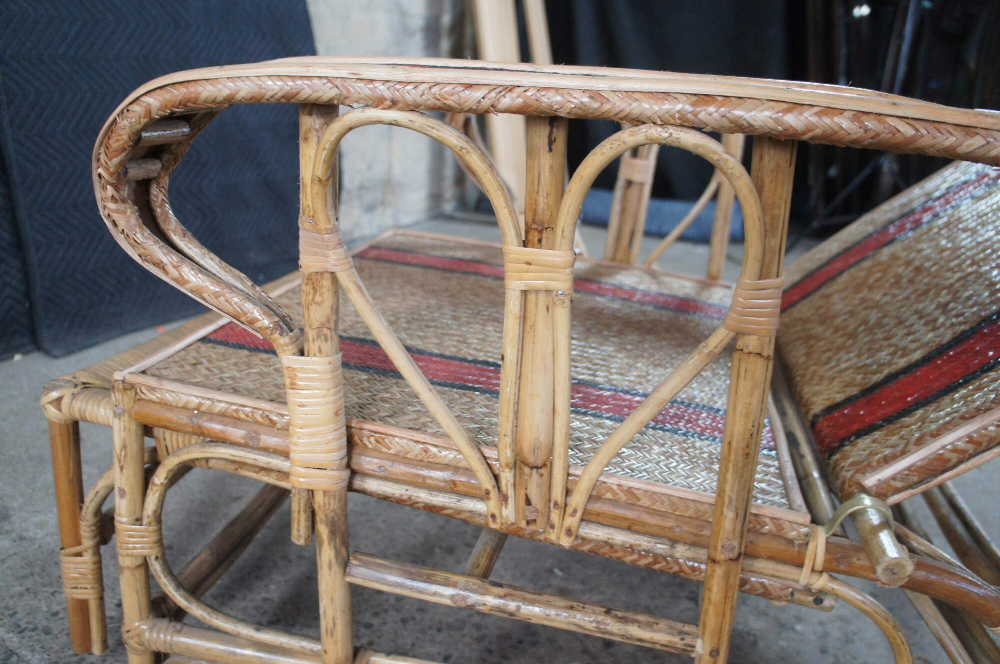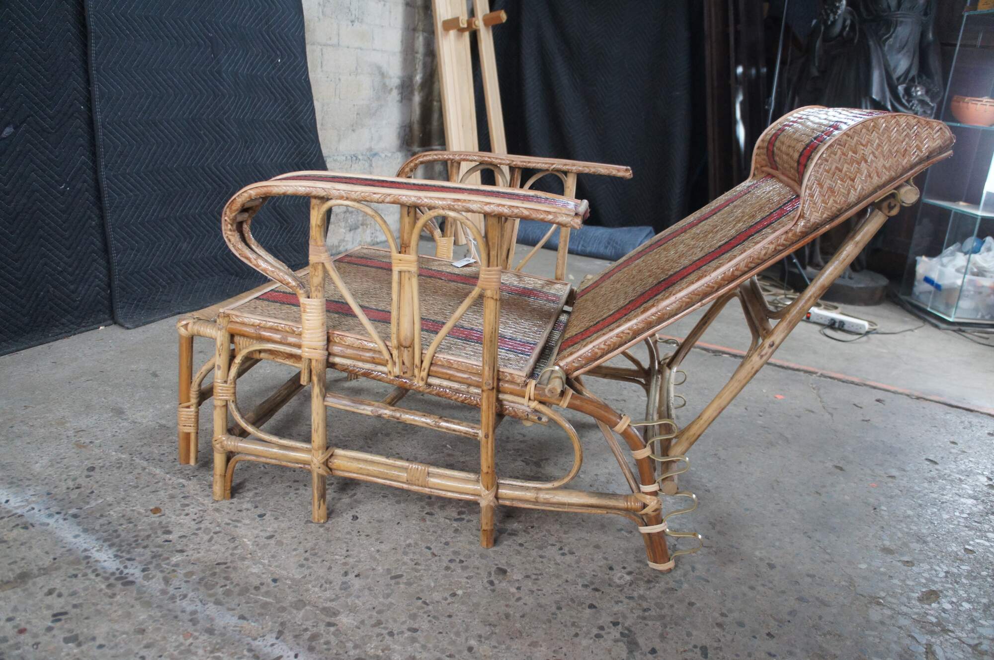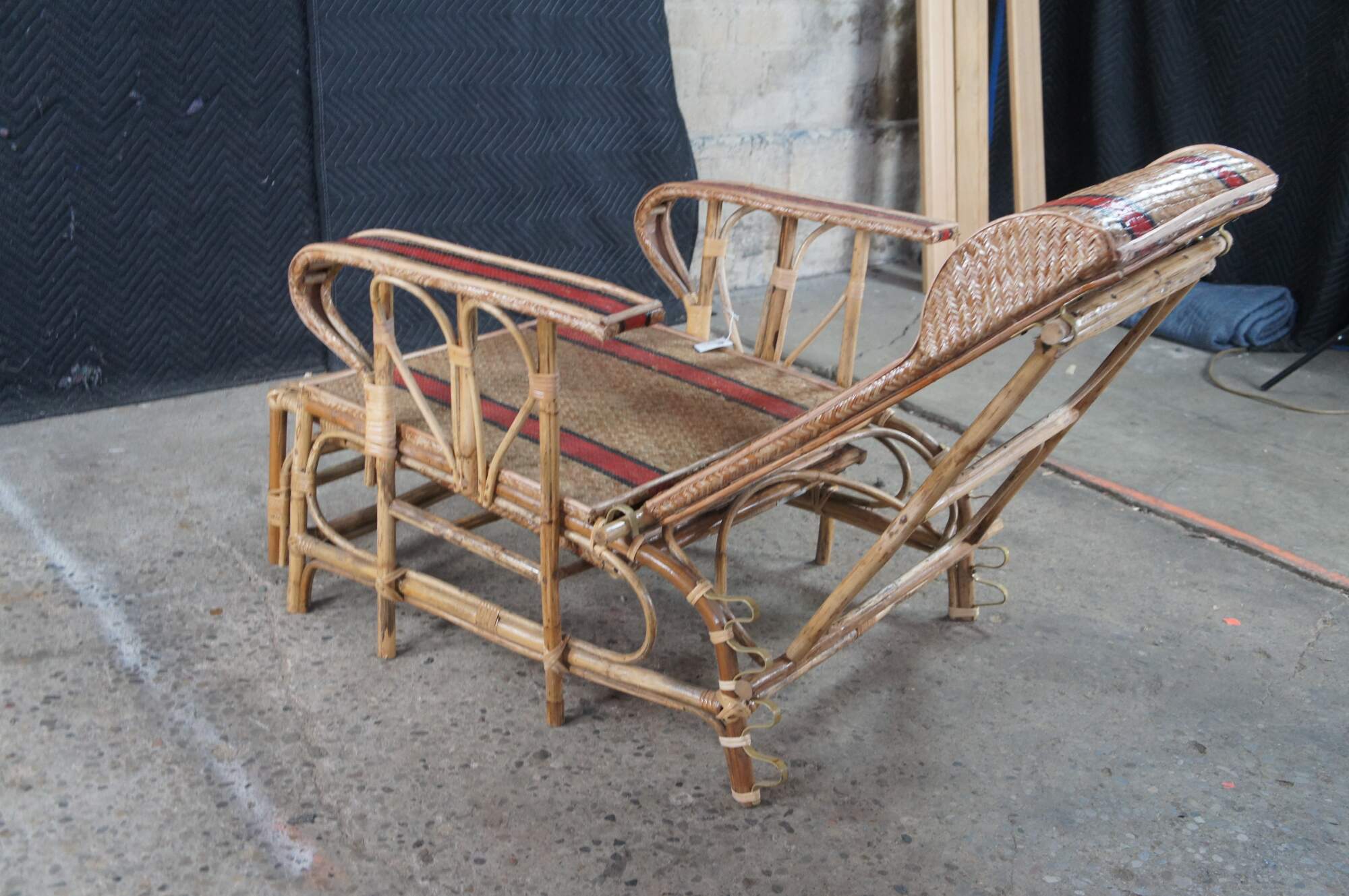 Features a bamboo and woven rattan frame with red and black stripes. The chairs have an adjustable back and extendable legs allowing them to be used poolside for tanning and lounging. When not in the extended position the chairs can be used in a traditional upright format. A unique design and fun color