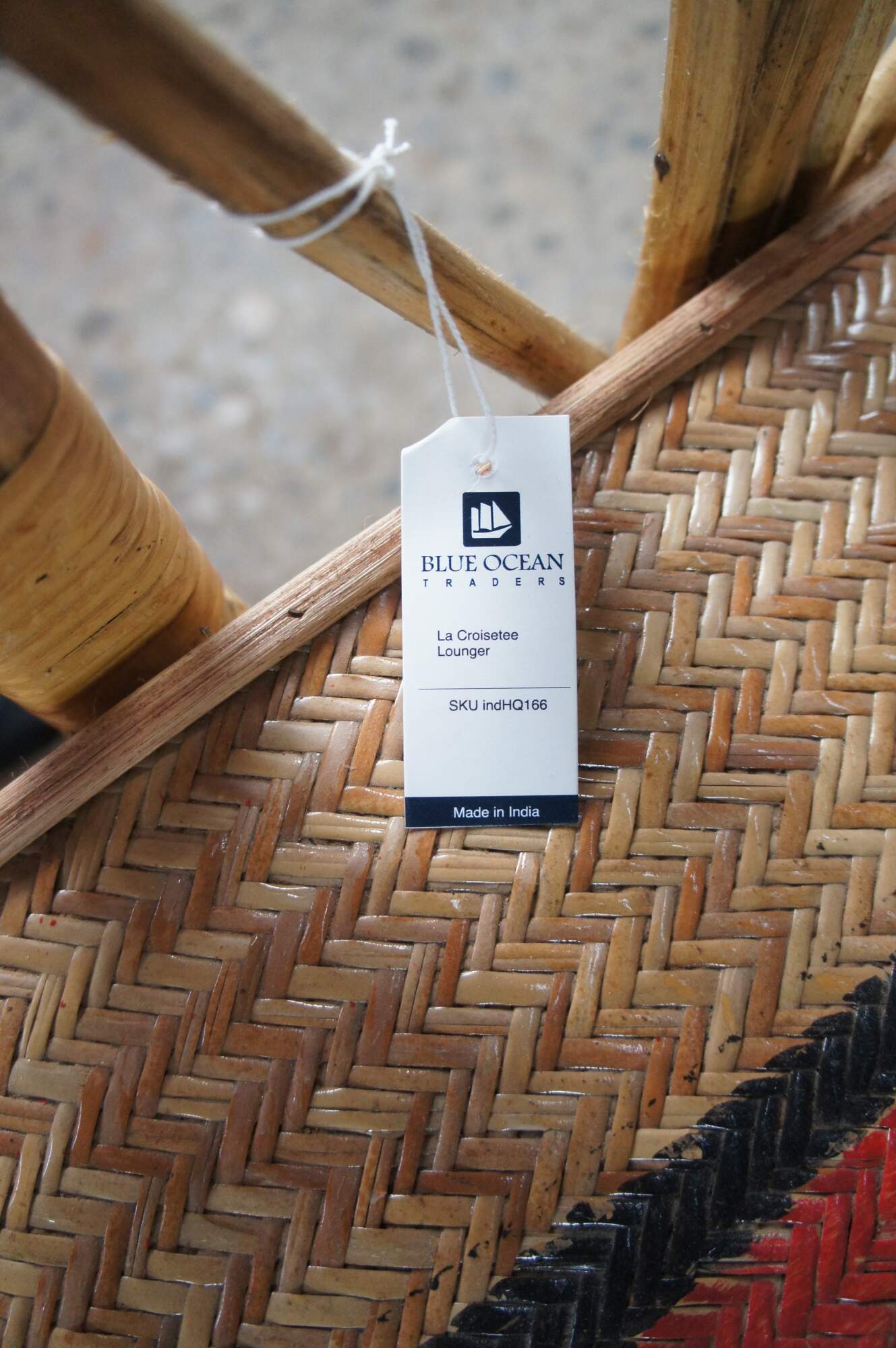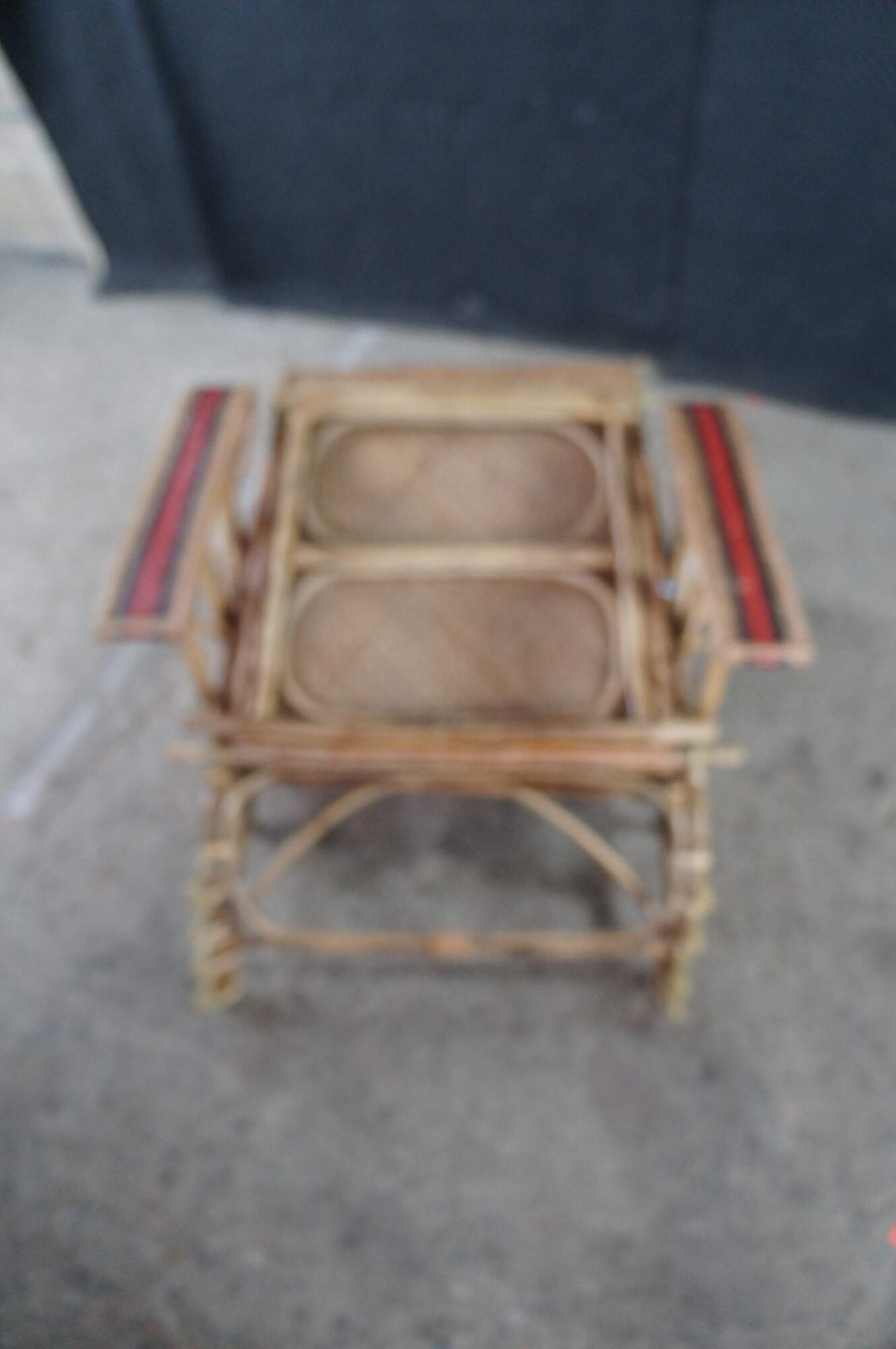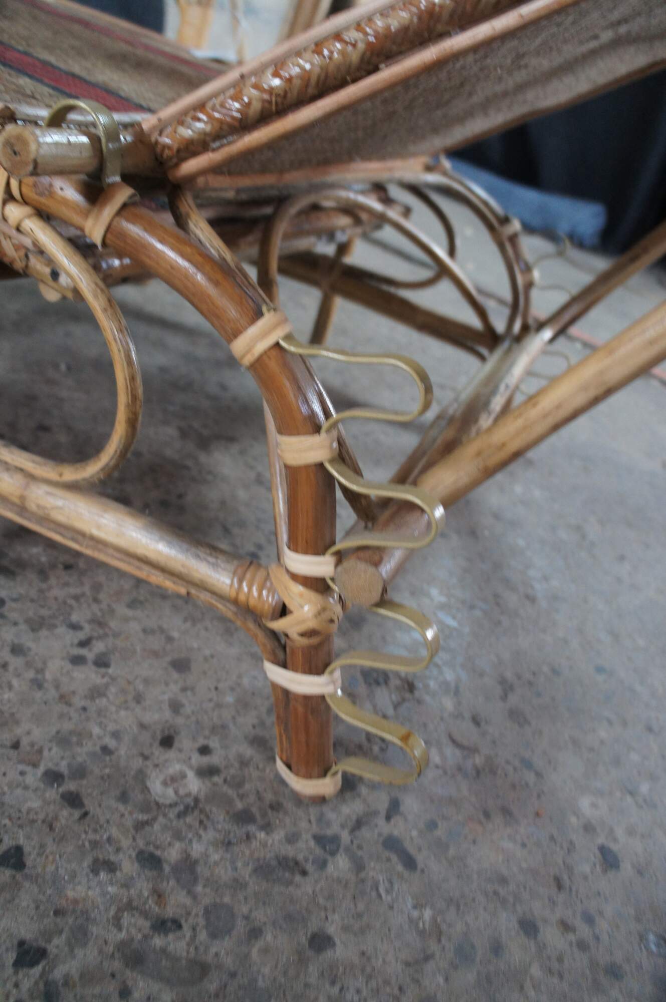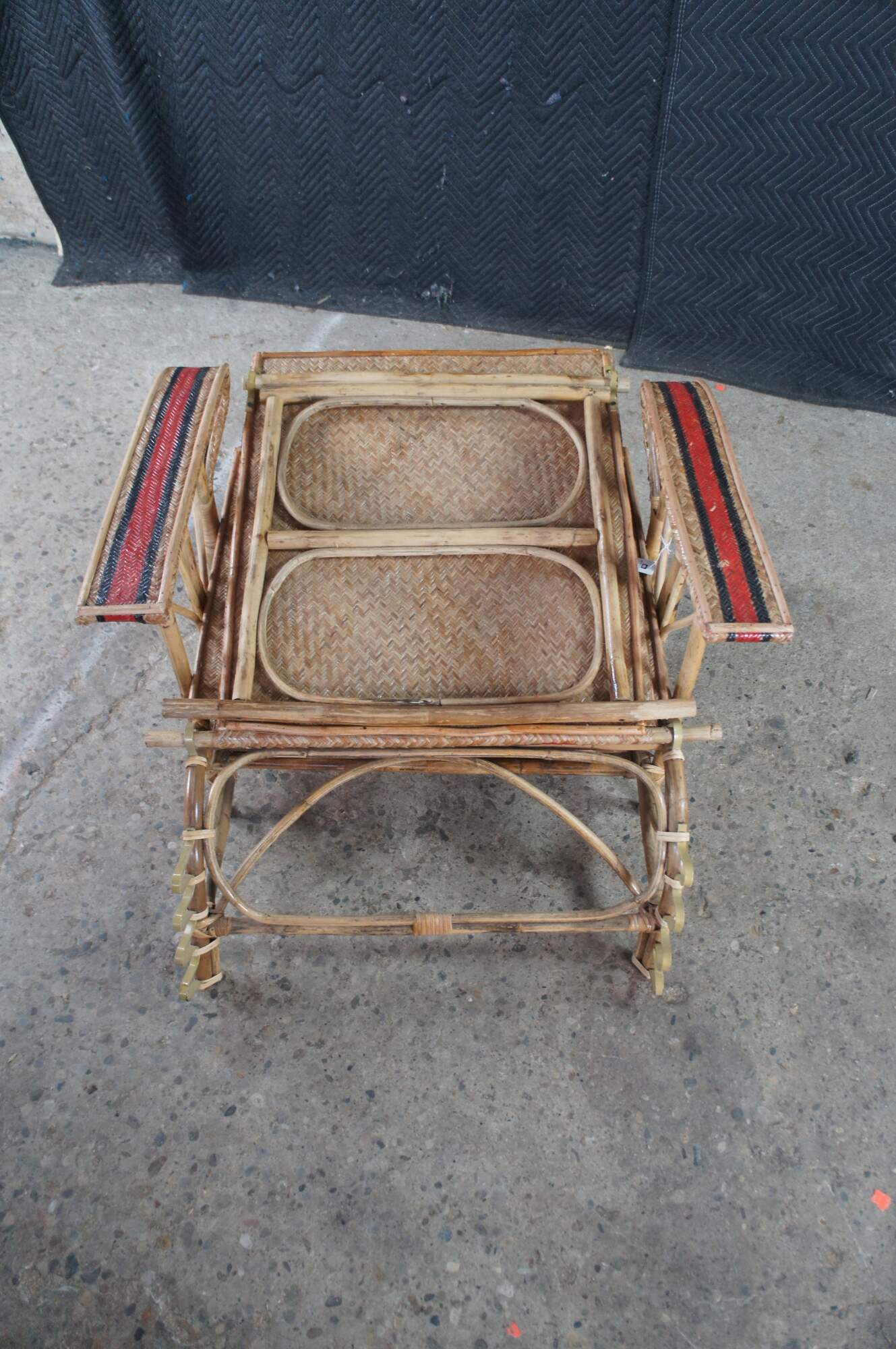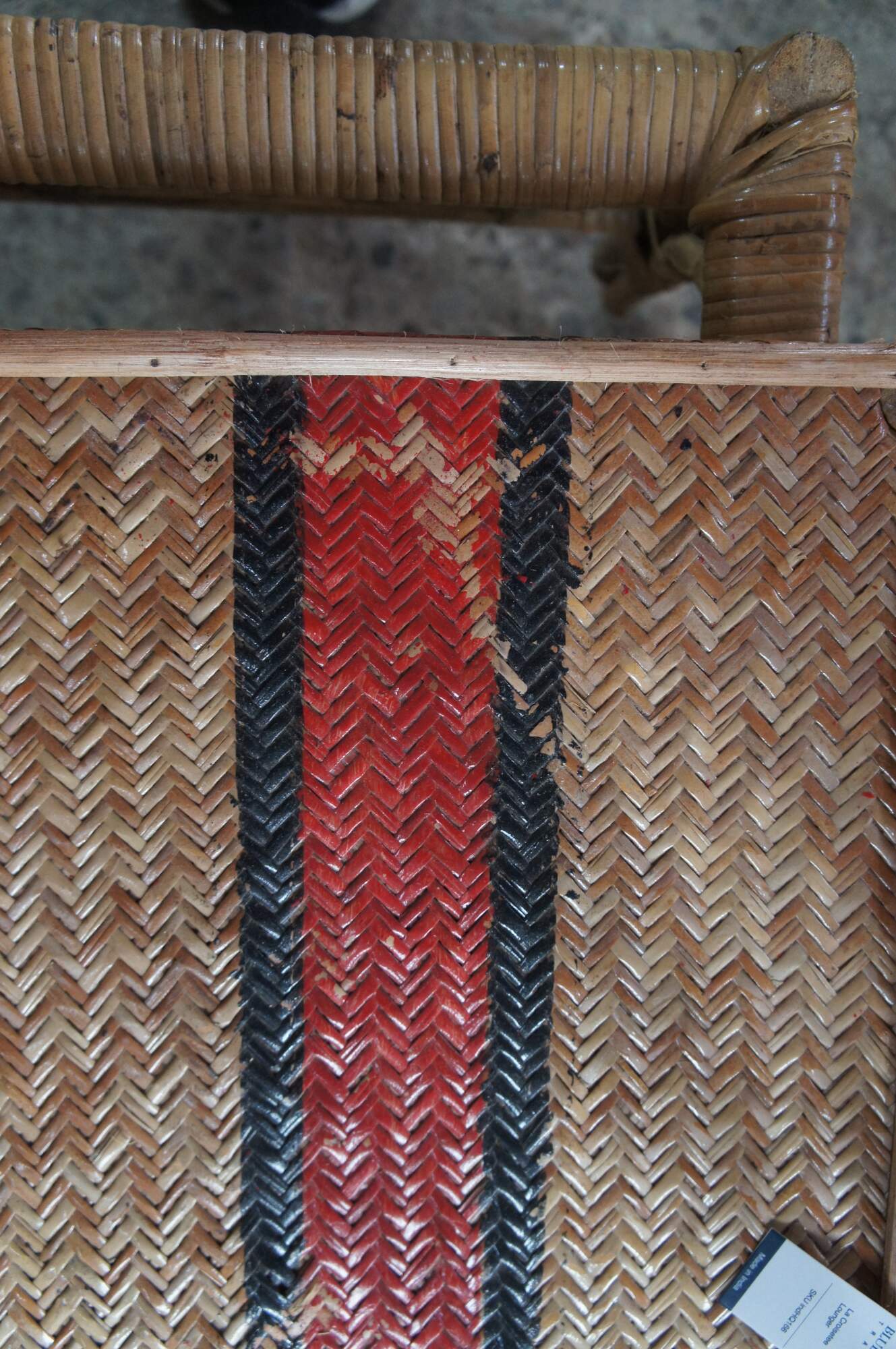 Features a bamboo and woven rattan frame with red and black stripes. The chairs have an adjustable back and extendable legs allowing them to be used poolside for tanning and lounging. When not in the extended position the chairs can be used in a traditional upright format. A unique design and fun color